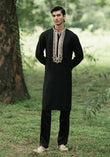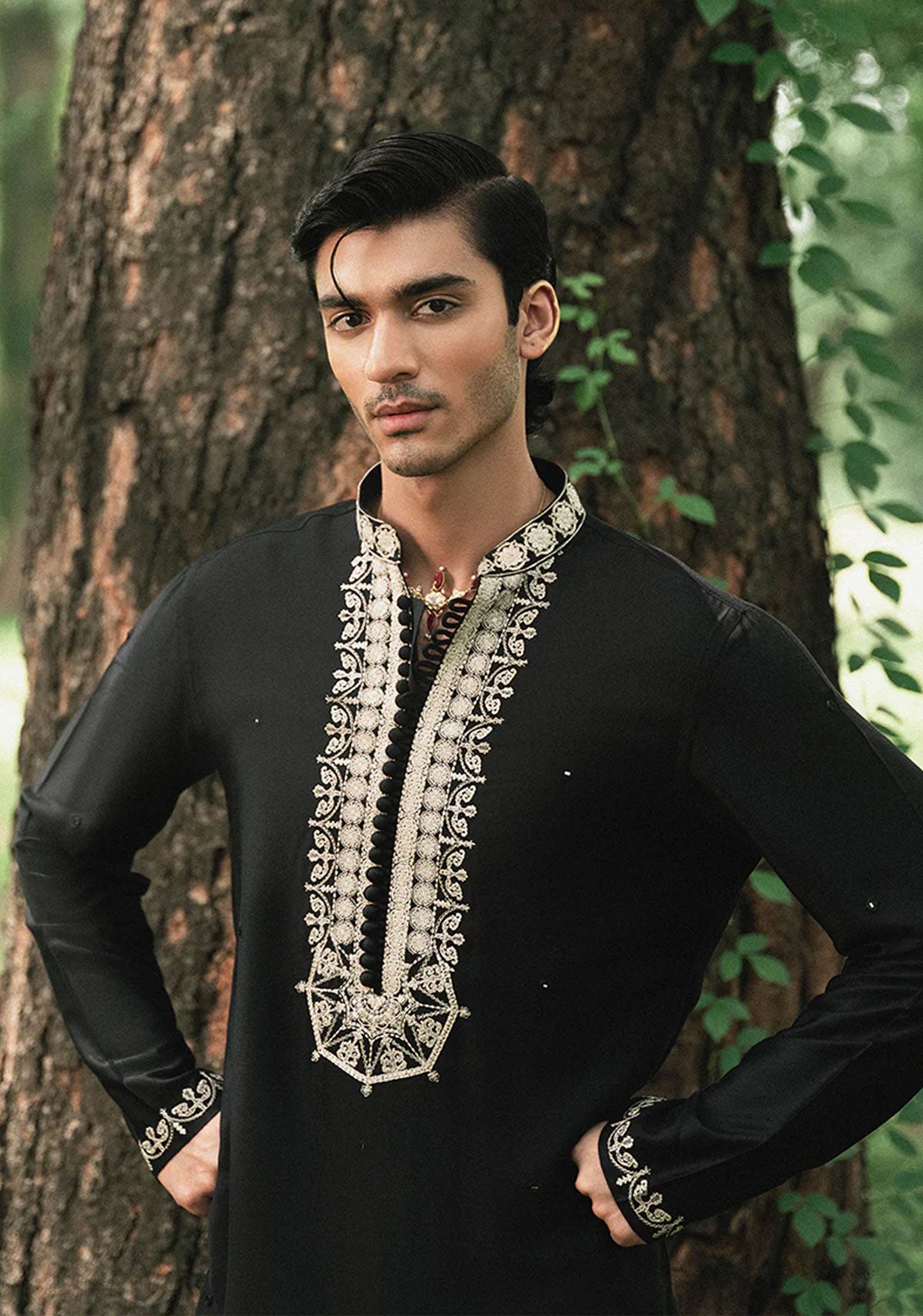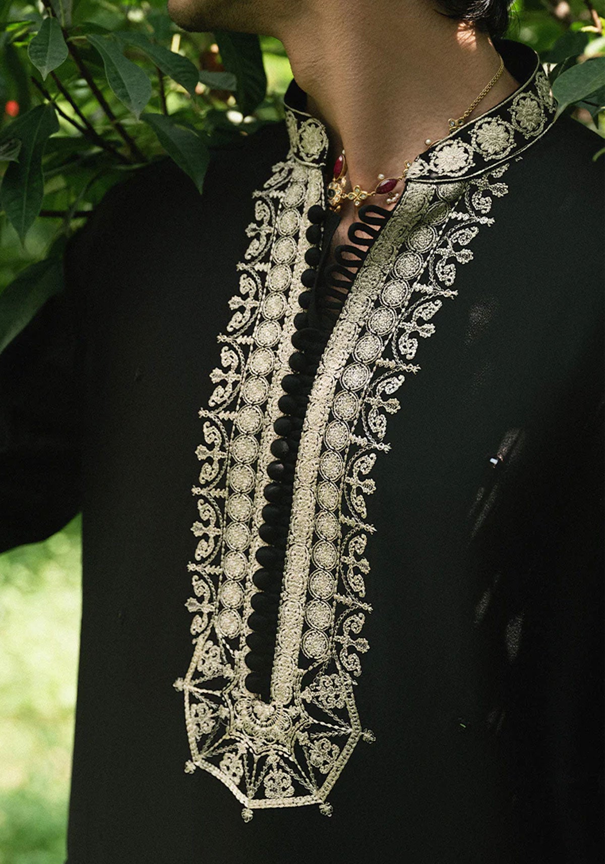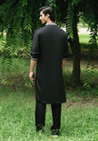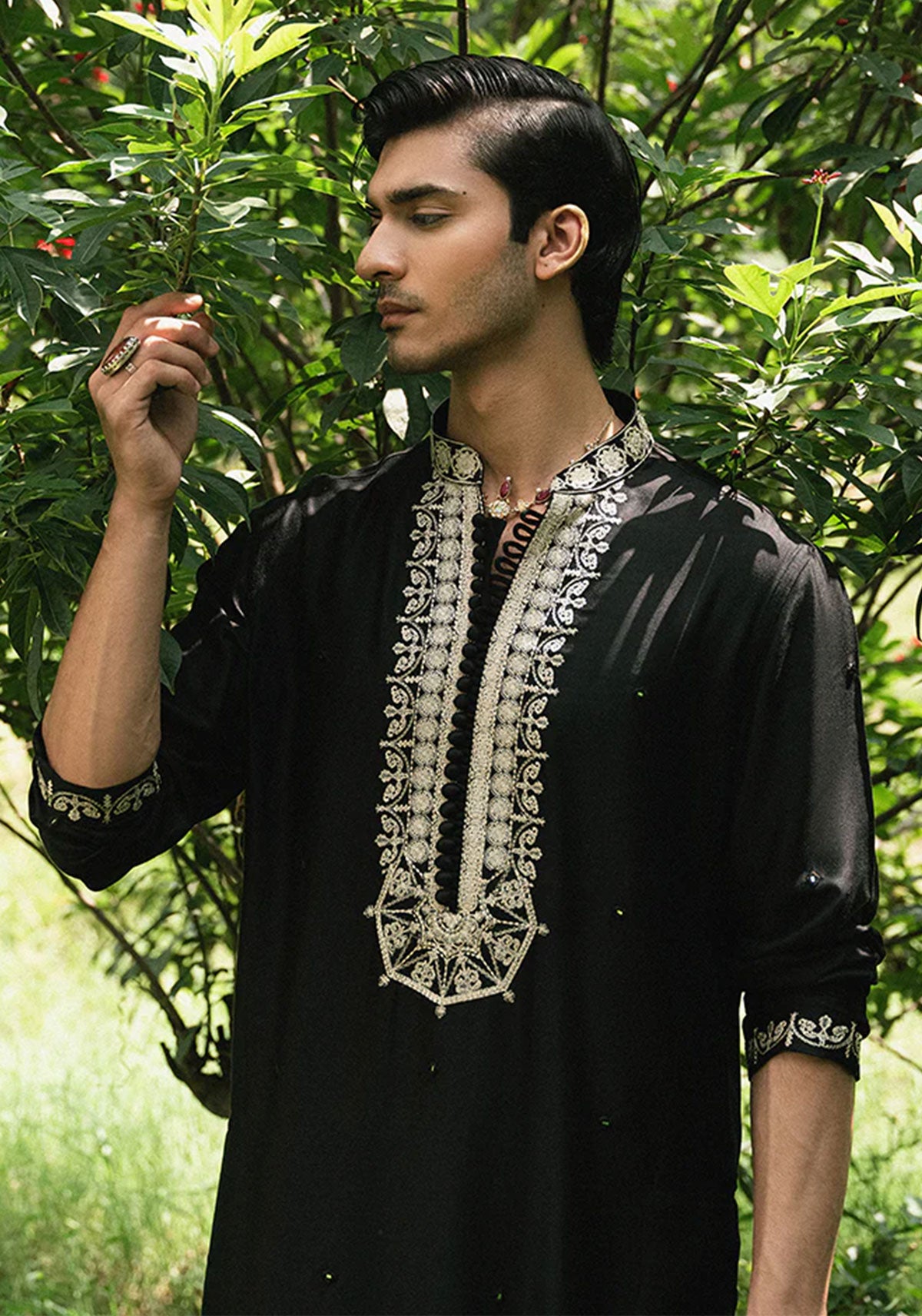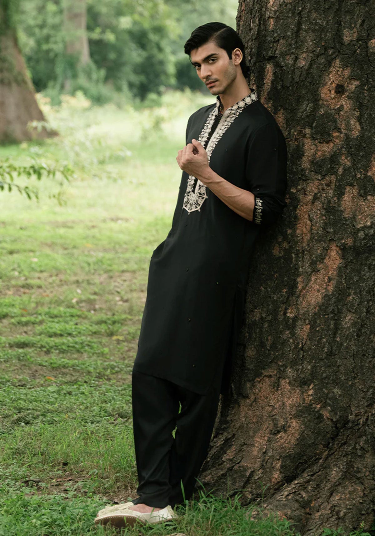 'A black kurta and pajama set with fawn contrast embroidery inspired by roman architecture, on the neckline, band collar and border on the sleeves. Further detailed with hand crafted mirror work.