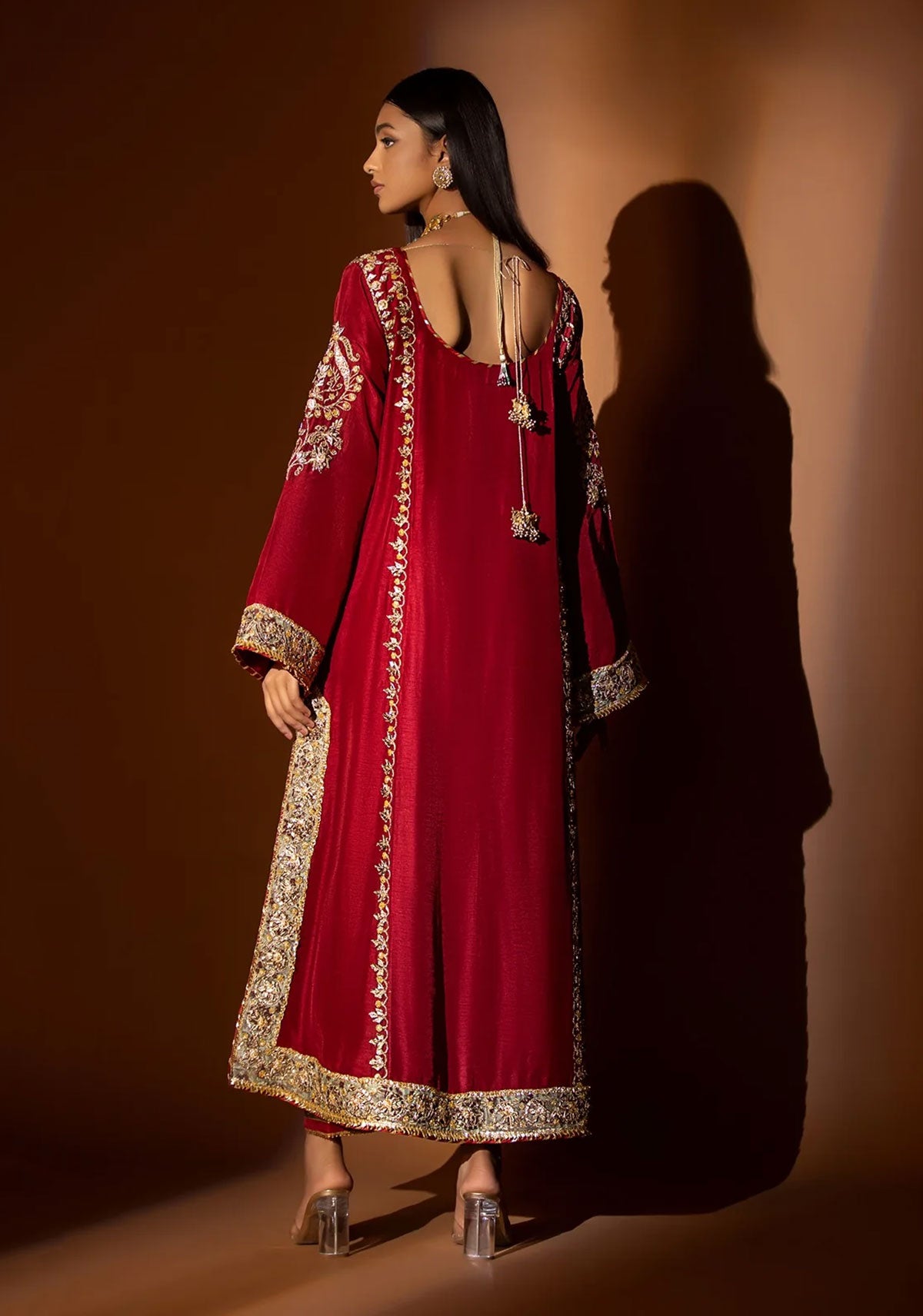 Maroon raw silk long hand crafted kurta with side pockets and gota work on it. Paired with embossed silk gota paincha pants.