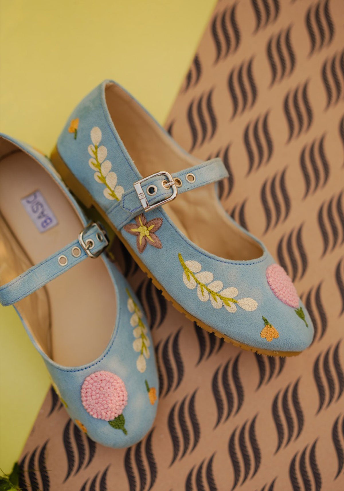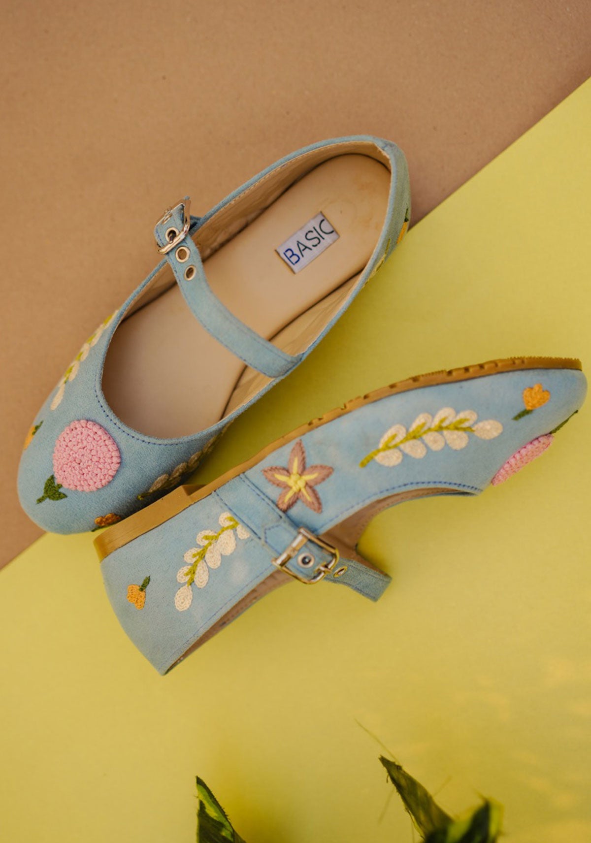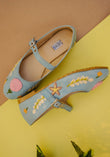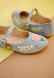 These charming Peachy Keen Mary Jane shoes feature hand embroidery in taupe, mustard, peach, off-white and two tones of green colors, showcasing delicate leaves and floral motifs crafted with chain stitch and French knots. Designed for comfort, these blue color Mary Jane include a cushioned upper and insole, plus an elastic strap with a buckle for easy wearing. The durable rubber sole keeps every step playful and secure. Perfect for adding a whimsical touch to any outfit!