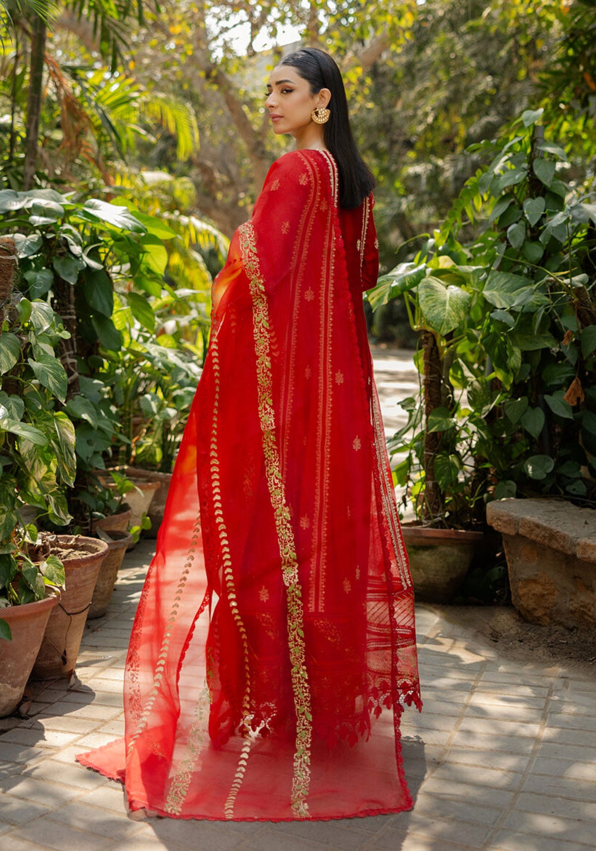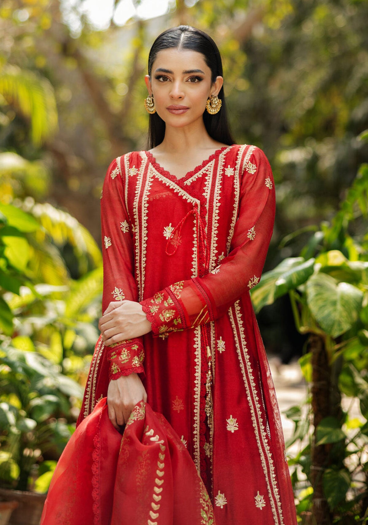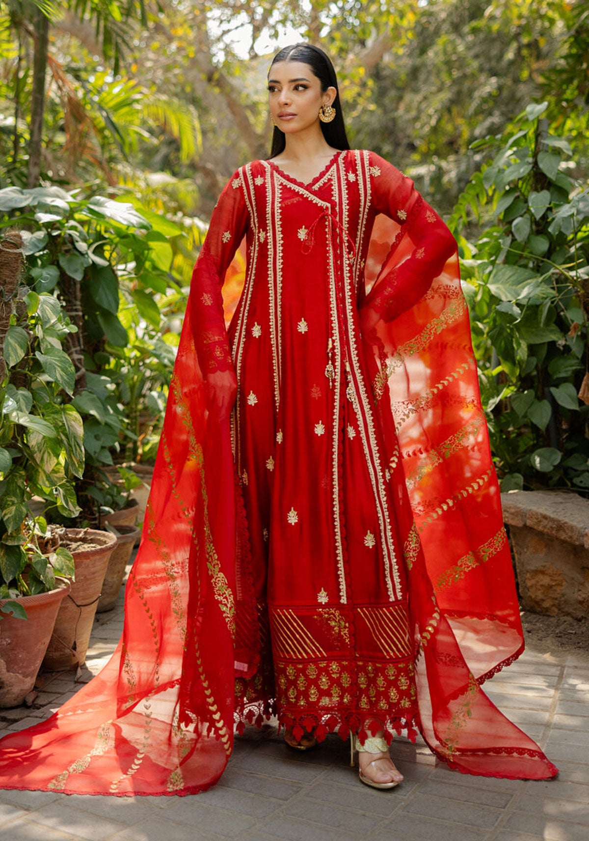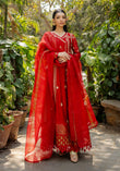 Red Anrakha khaddi net done with laces Ari work hand touching & block print