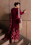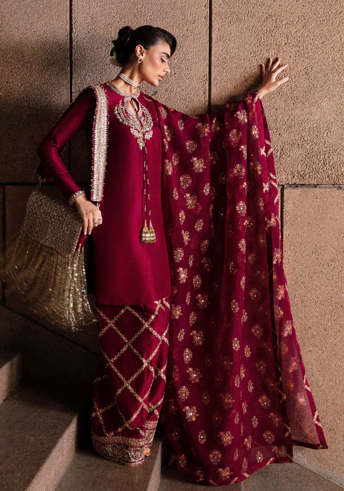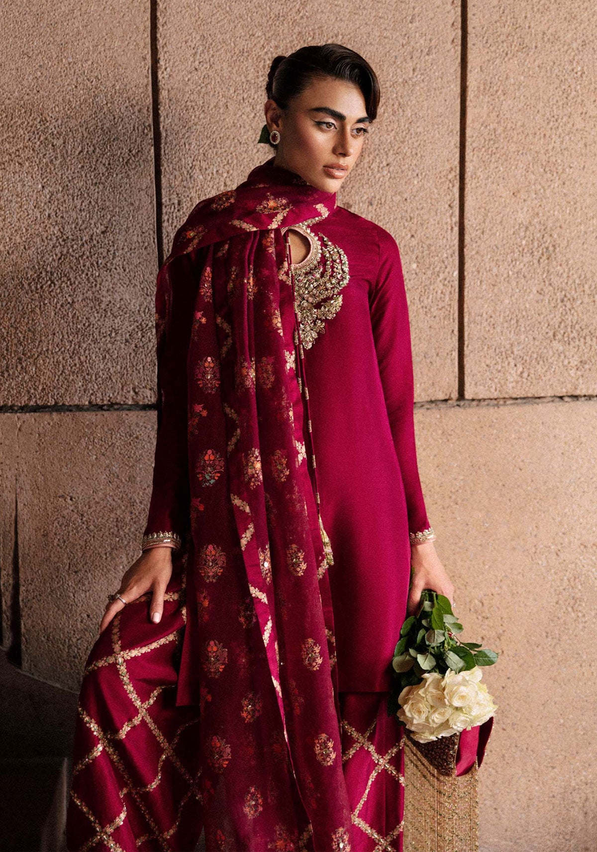 A ravishing burgundy maroon ensemble including a beautiful short raw silk shirt with embellishment detailing on neckline. The neckline is also adorned with gold sequins and naqshi with green , gold and pink buggle beads. It is paired with heavily embroidered and embellished shalwar. It comes with printed organza dupatta with block printed finishing on all four sides.