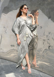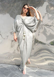 'A relaxed and loose V-neck metallic white kaftan dress featuring an adjustable drawstring at the front for a slight gather, accented with tassels.