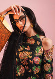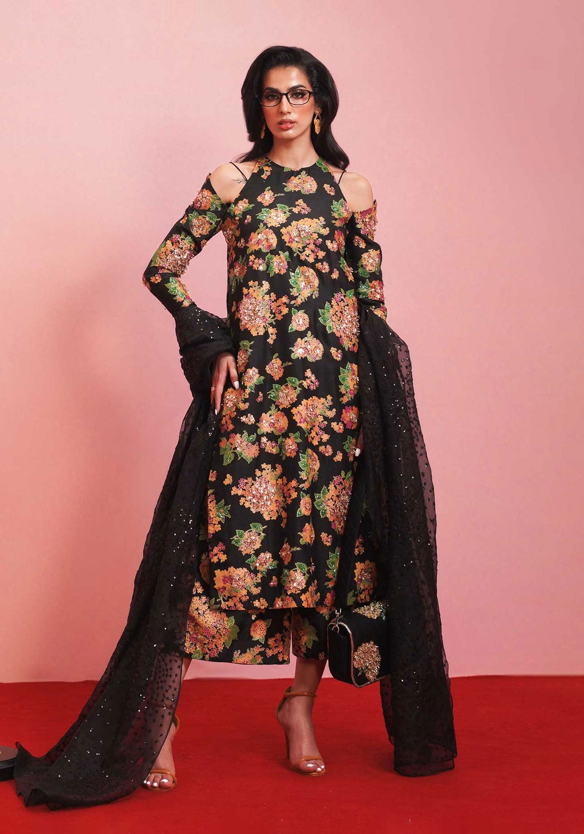 An exquisite raw silk block printed shirt and culottes embellished all over with dainty fine details of gold sequins and pink and gold buggle beads with halter neckline. It comes with black organza duppatta heavily sprayed with black sequins all over.