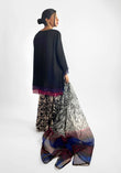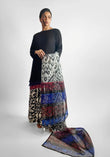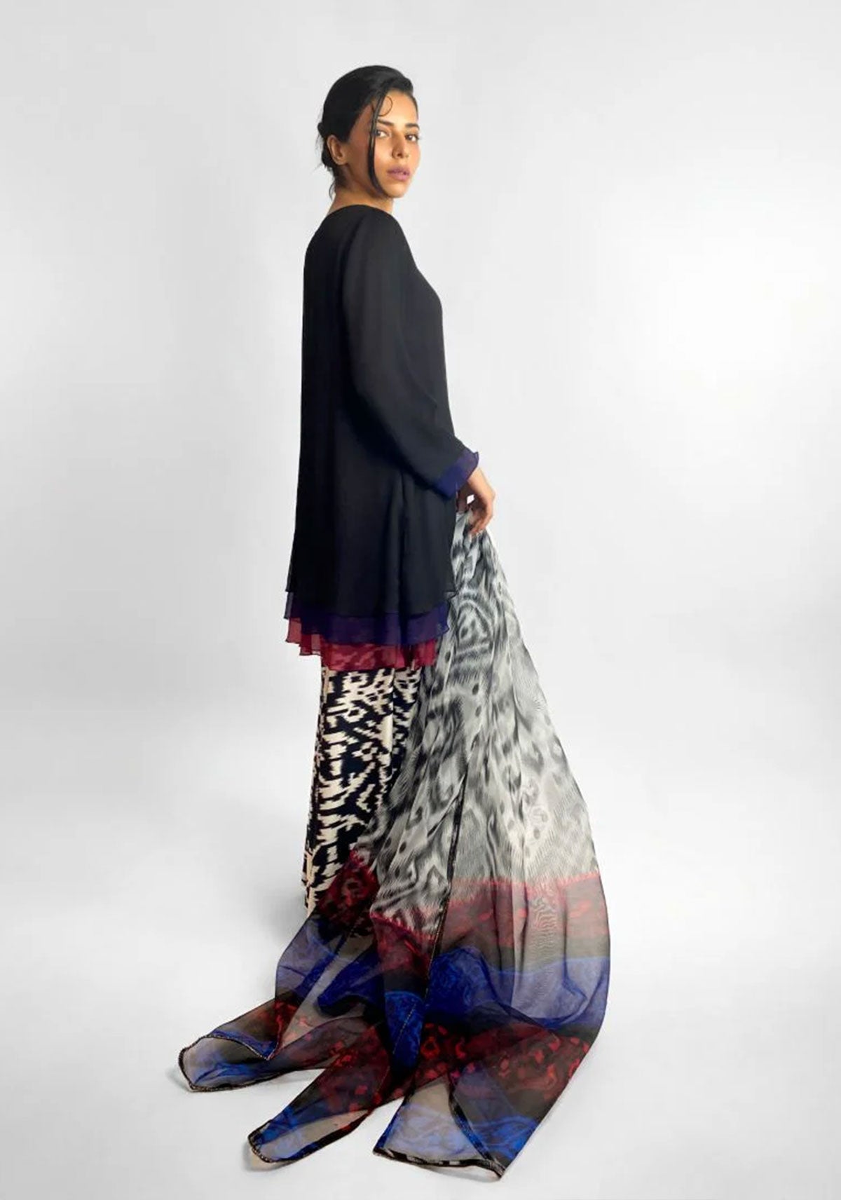 A striking fusion ensemble featuring a three-layered chiffon tunic in a rich palette of black, blue, and maroon, creating depth and movement with every step. The airy silhouette is complemented by ikat print culottes that add a bold, artisanal touch. Finished with a digitally printed organza dupatta, this look blends texture, tradition, and contemporary elegance, perfect for festive occasions or statement daywear.