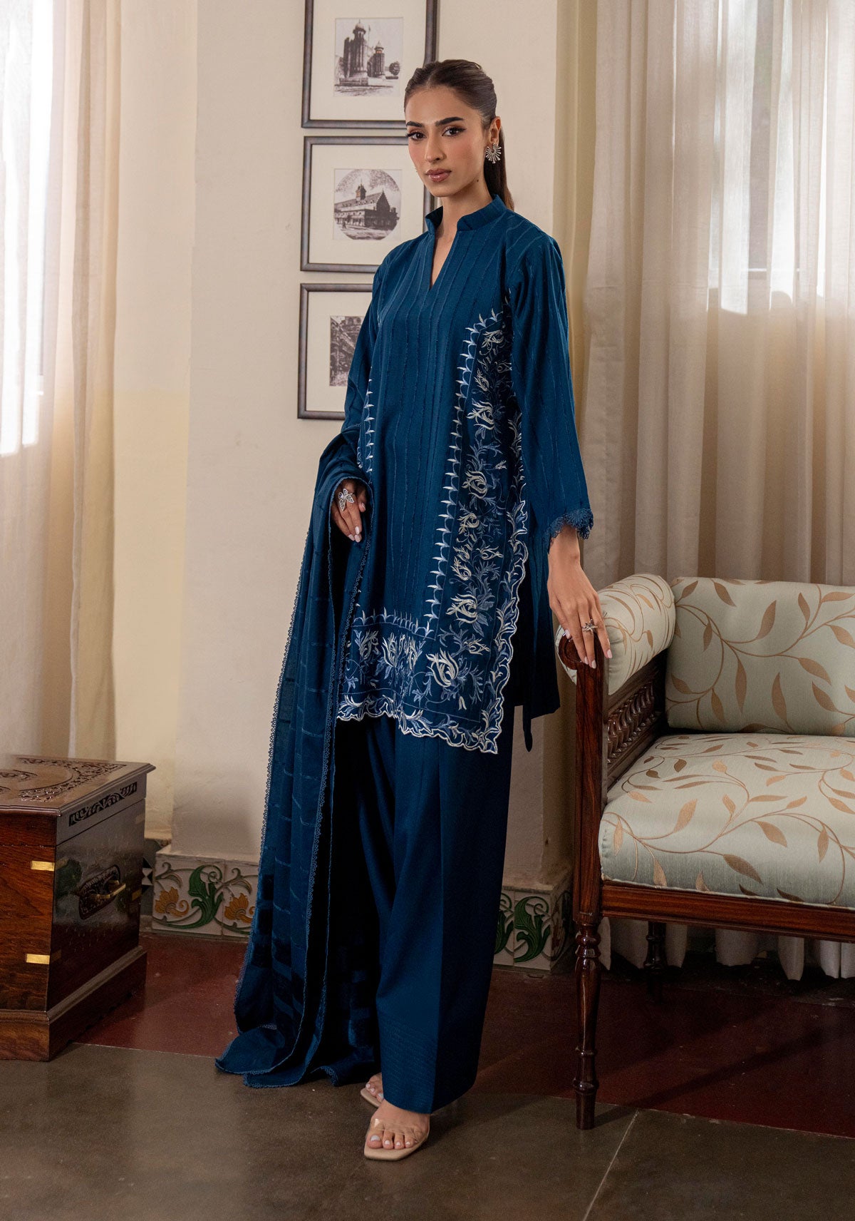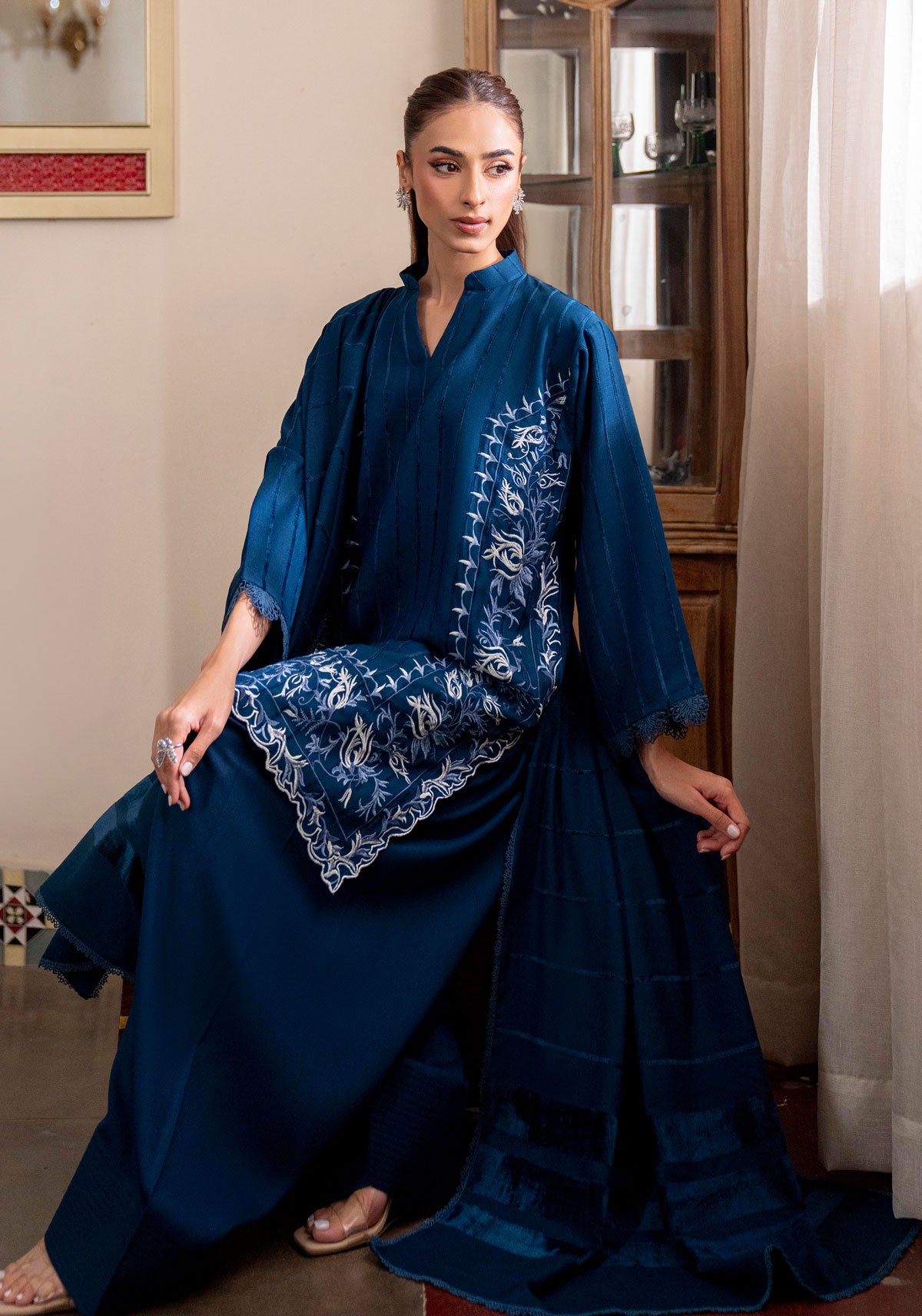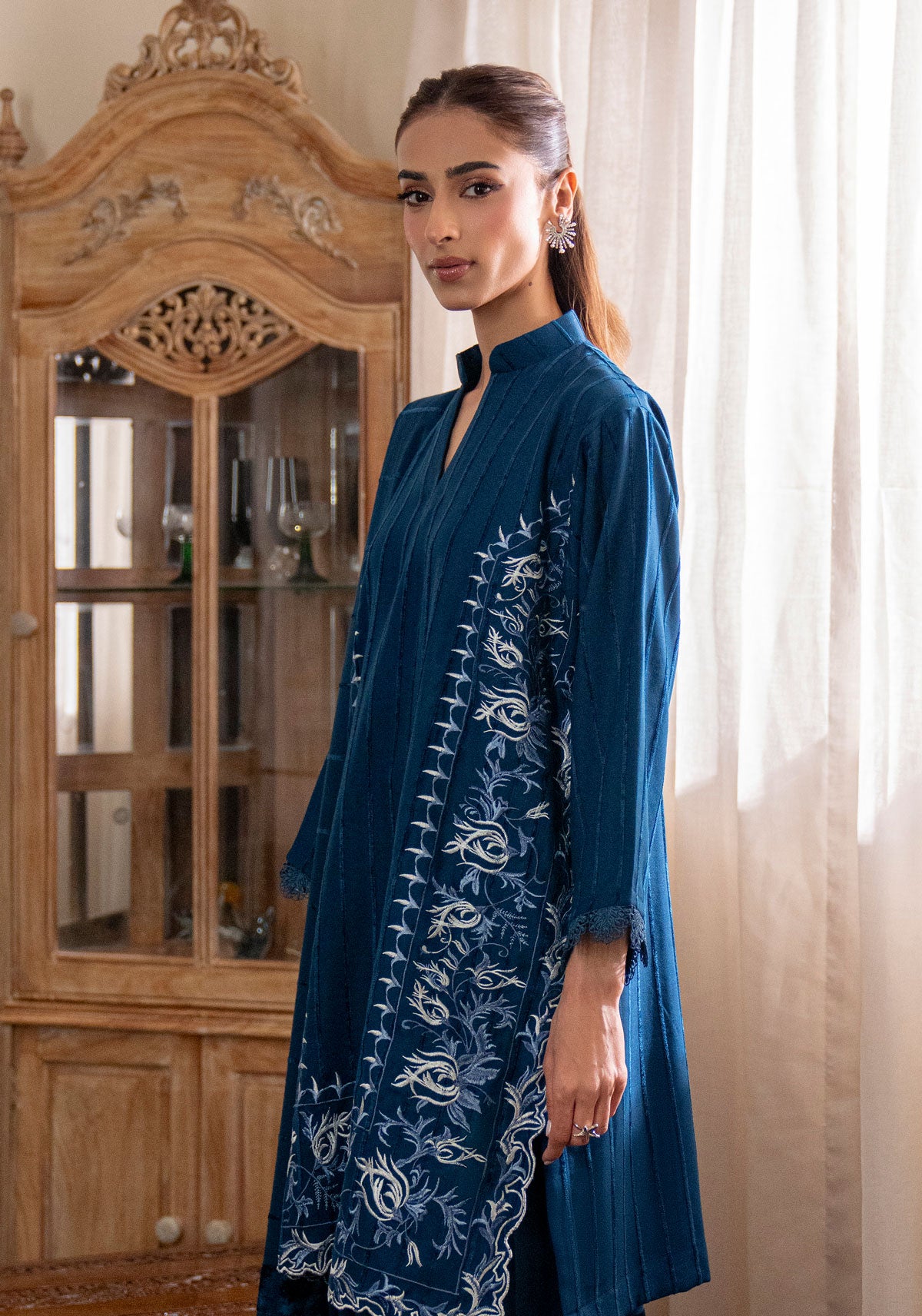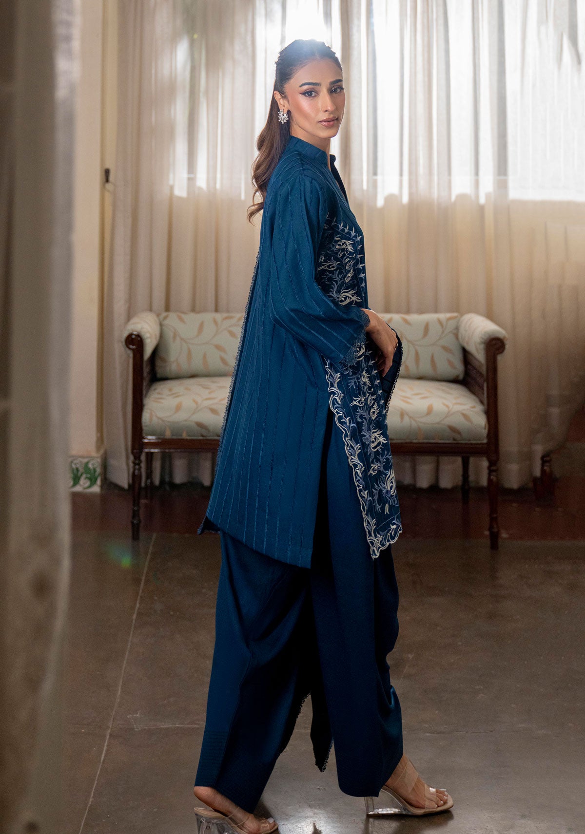 Lean into a romantic mood this season. This deep blue tunic is cut to a short boxy-kurta silhouette with embroidered detailing along the chalk and daman in hues of off-white, light blue. Paired with a silk karandi shawl adorned with a velvet finish.