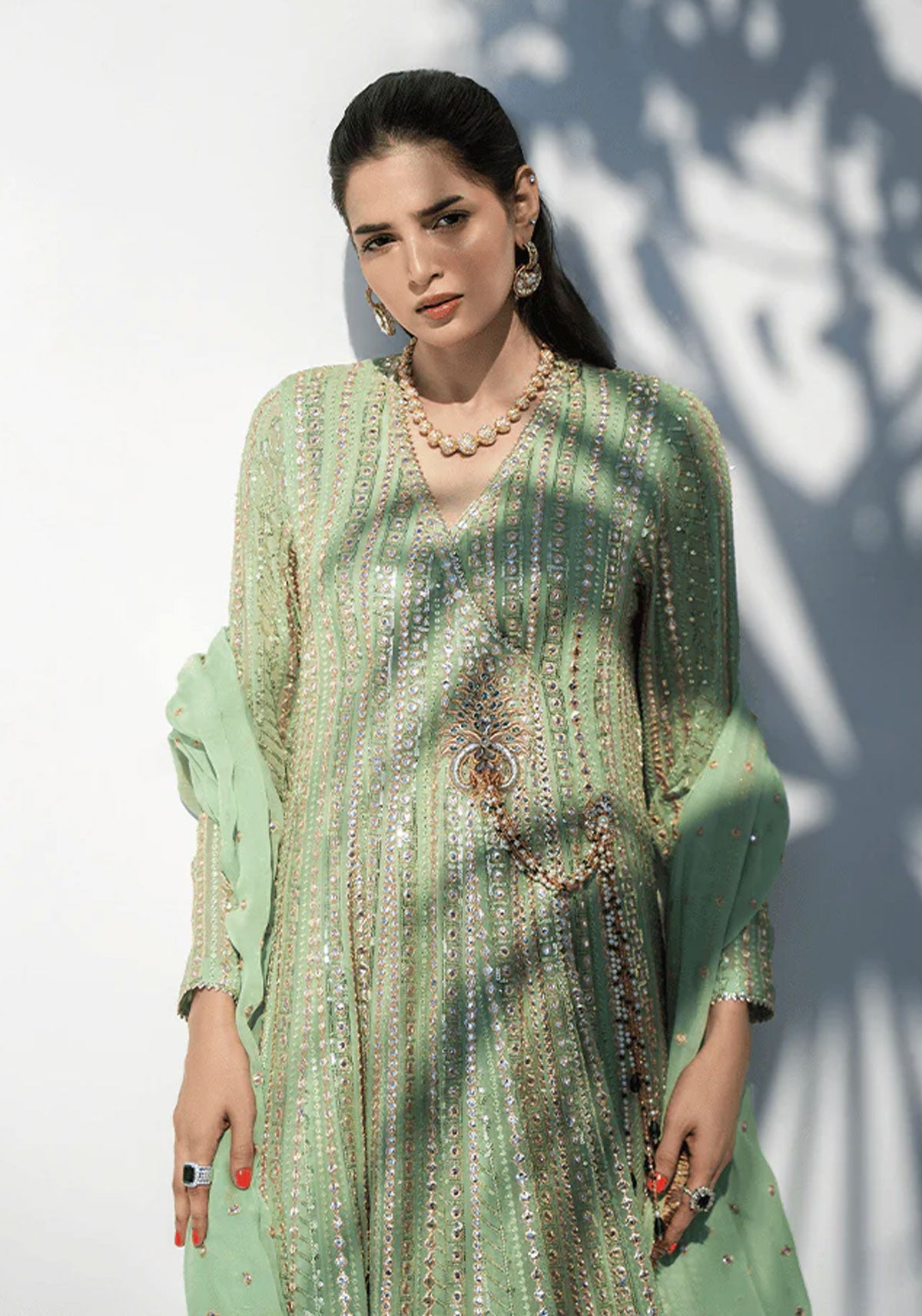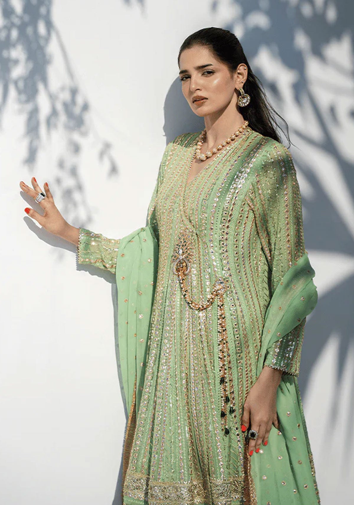 This elegant ensemble features a mint green angarkha crafted from mirrored fabric that lends a subtle, luminous shine. The silhouette is elevated with hand embellished lacha detailing and refined gold lace accents. Paired with a chiffon dupatta adorned with mirrored chan all over and finished with gold lace on all four sides, this outfit is a graceful blend of tradition and festive sophistication.