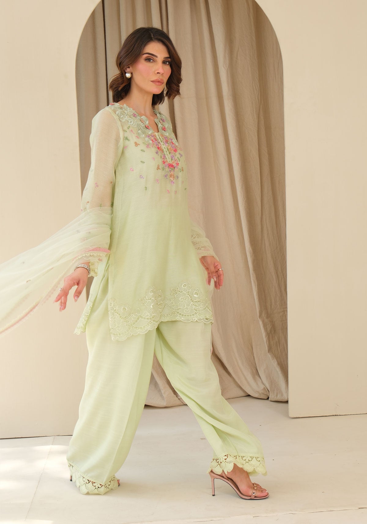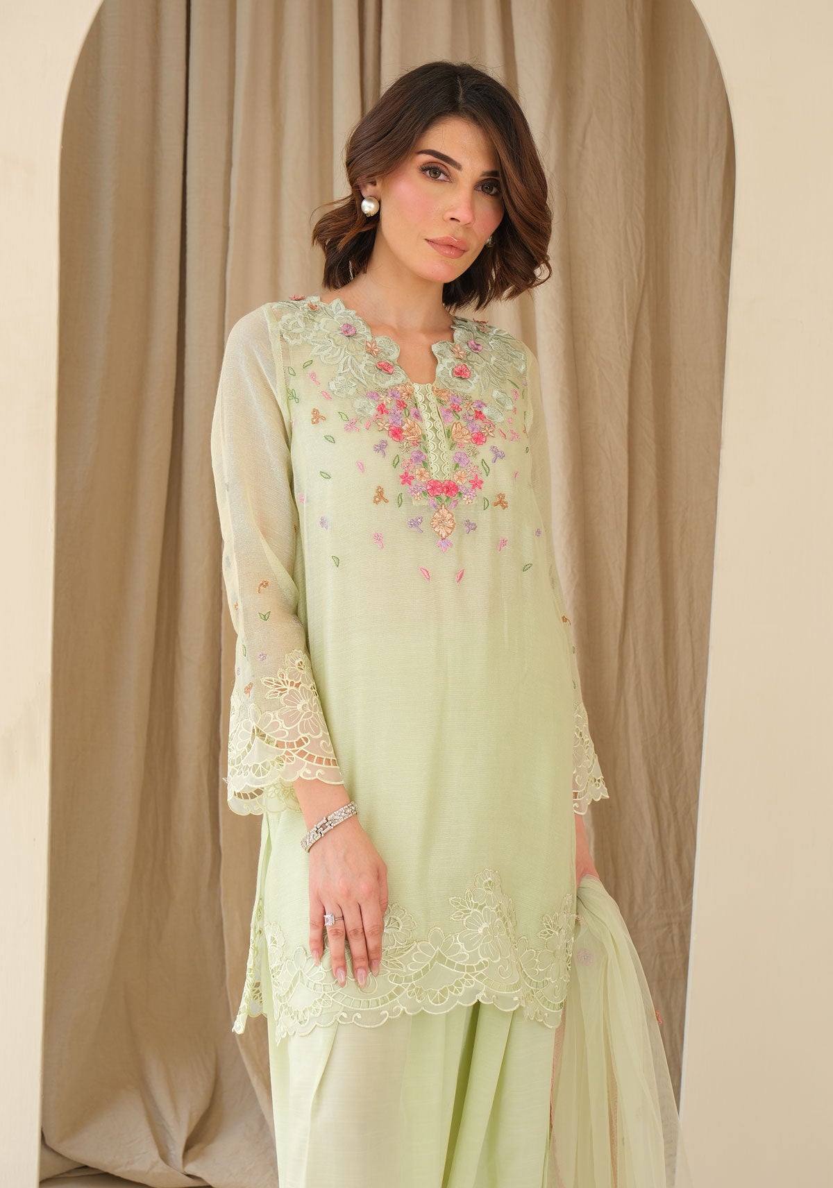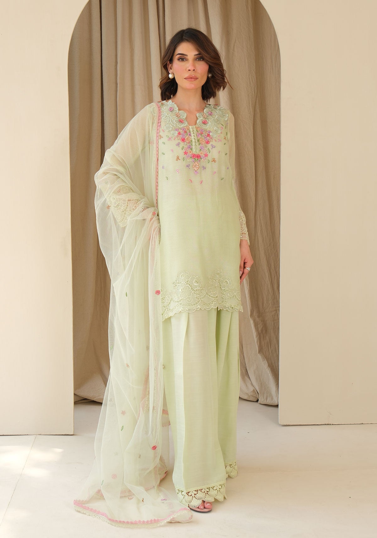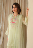 In the freshest shade of pastel mint, this cotton net ensemble is adorned with delicate florals and lace applique. Comes with a soft net dupata with tiny 3D floral and an elvish farshi shalwar to make it right on trend.