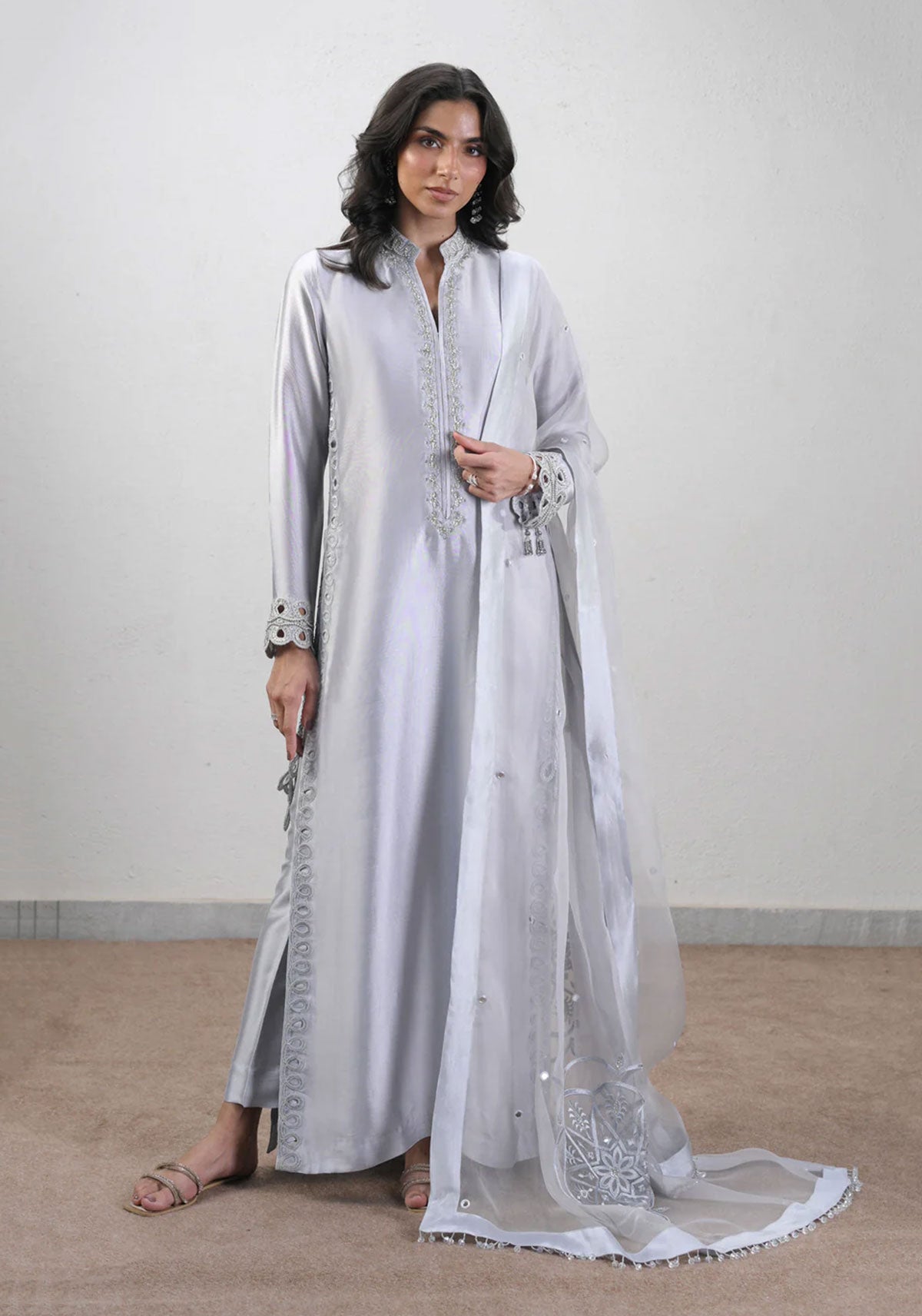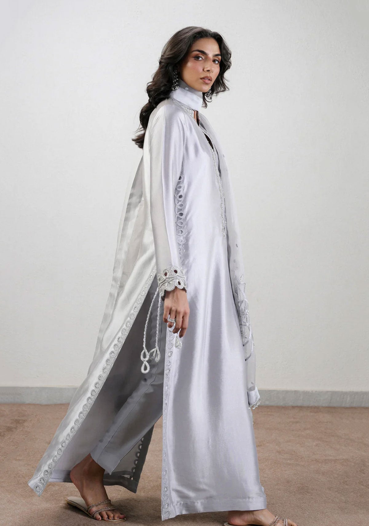 Paired with straight-cut pure silk pants and a pure organza dupatta, the ensemble is elevated with a subtle spray of mirror work and delicate floral motifs at the corners, finished with pearly dangling. Misra is perfect for festive gatherings, intimate celebrations, and elegant daytime affairs.
