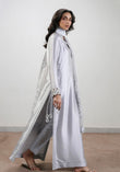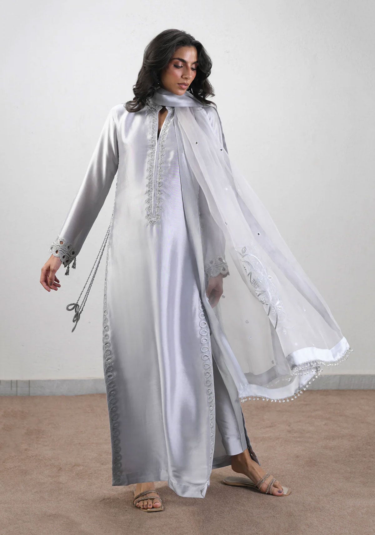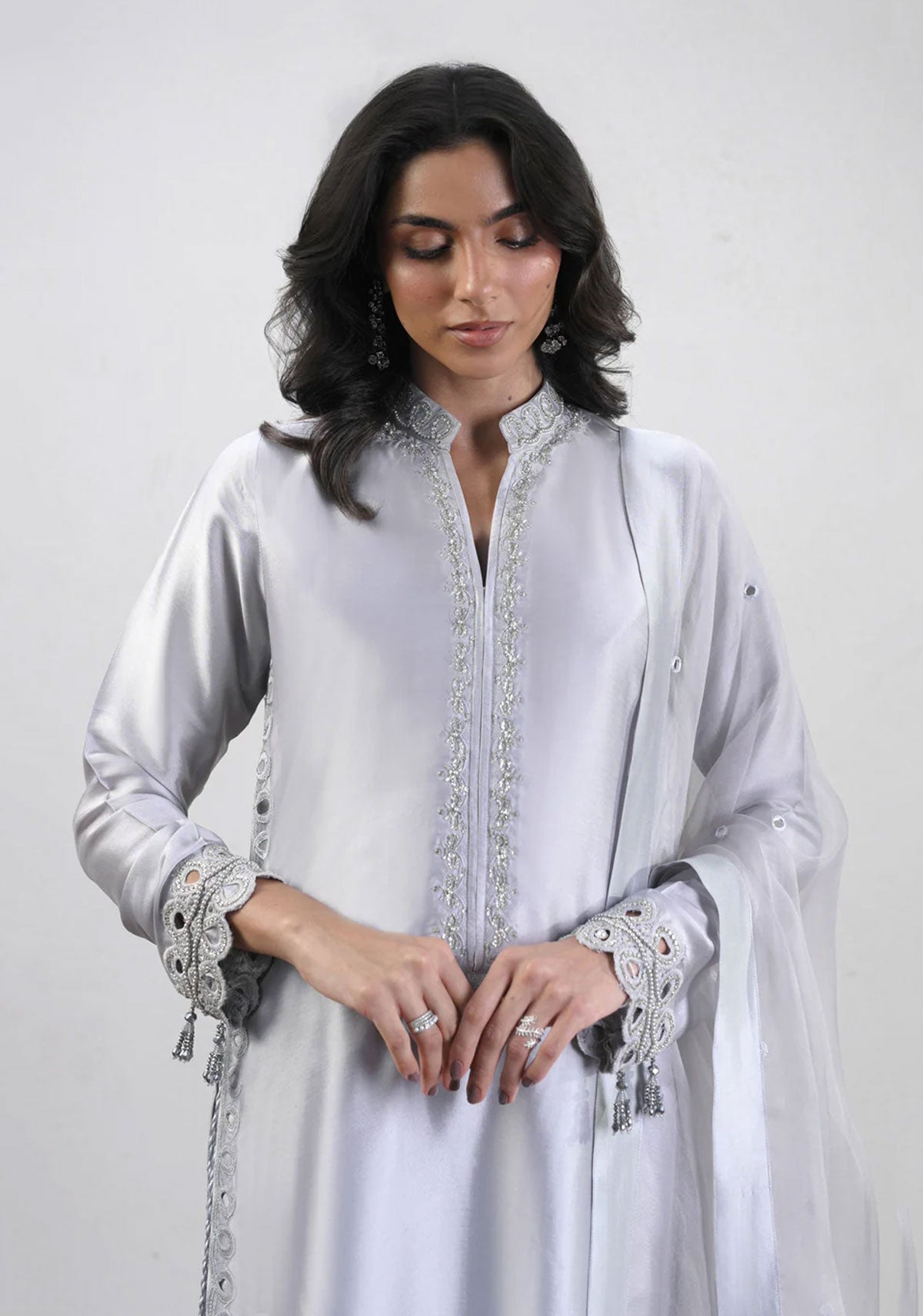 The straight, sleek-cut shirt features a neckline adorned with shimmering stones, complemented by long side slits and delicate embroidered cut work lace paired with tassels on the chaak. Flowing sleeves are enhanced with intricate cut work, embellished with crystals, pearls, and shimmering stones for a refined finish.