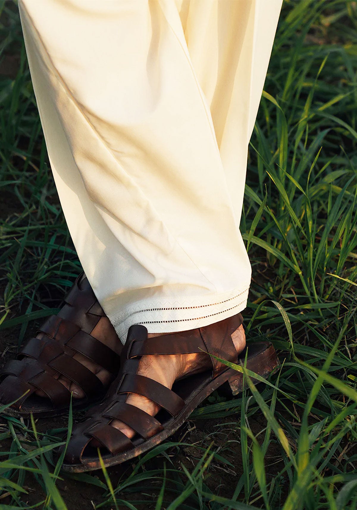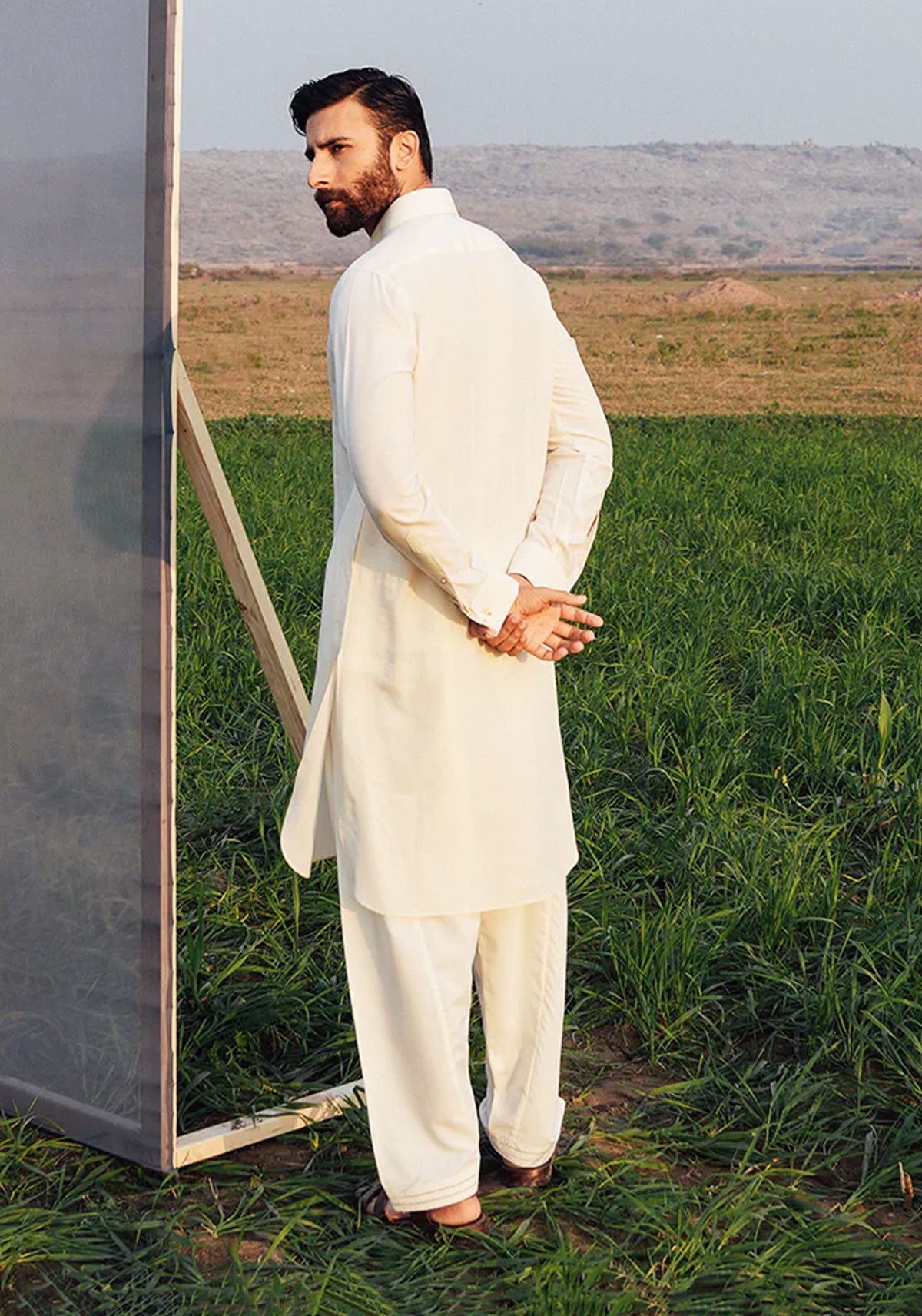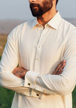 'A classic cream toned shalwar kameez in a premium boski fabric detailed with a French collar and gold buttons.
