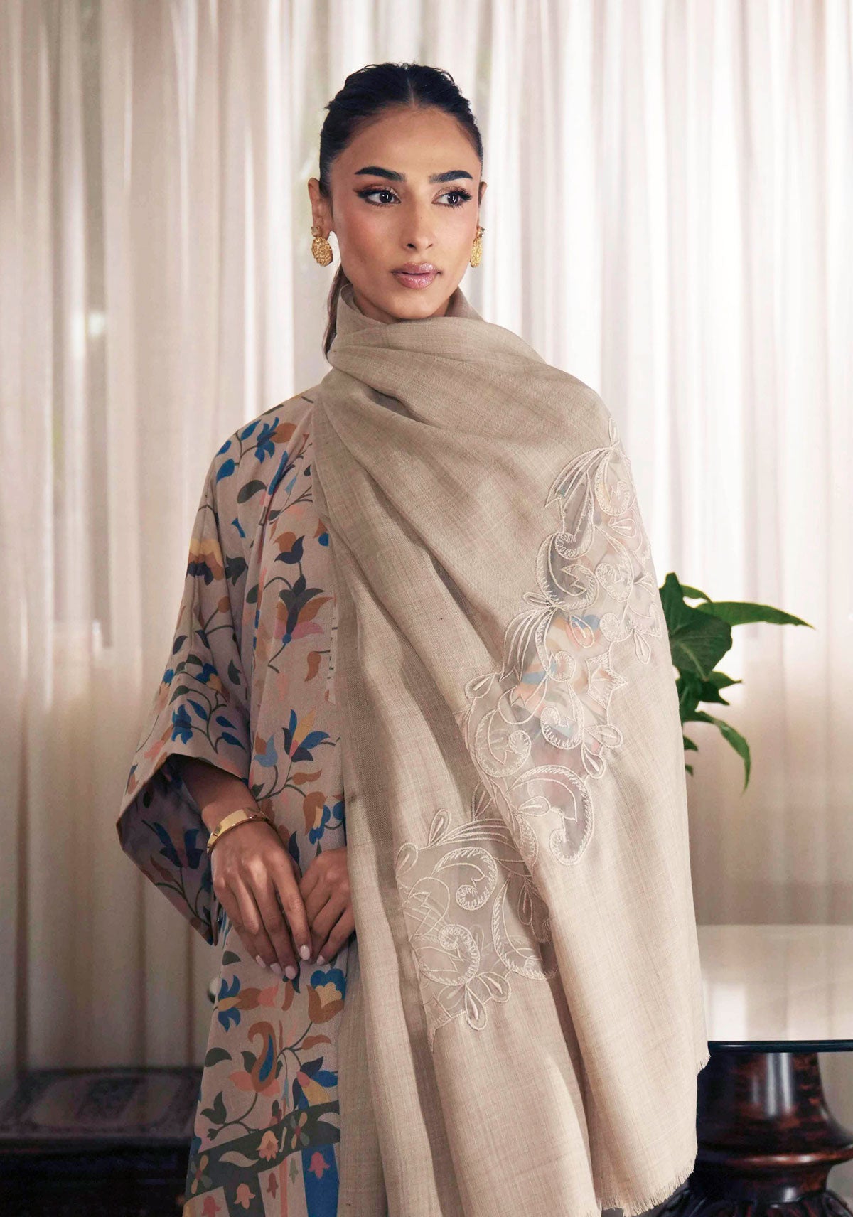 The 'misha' boxy printed kurta is crafted from a woollen canvas, tailored for an exceptionally soft and luxurious handle. dropped shoulders and subtly voluminous sleeves shape a slightly relaxed silhouette, elegantly finished with tailored trousers and a finely hand crafted applique shawl.