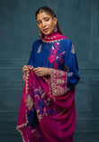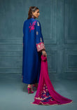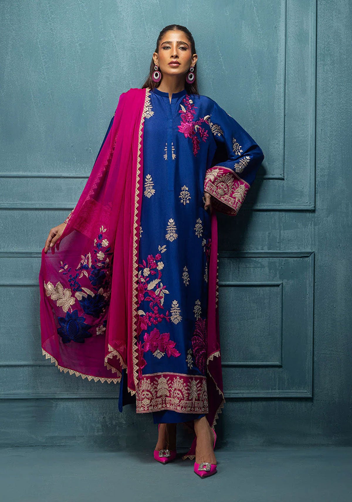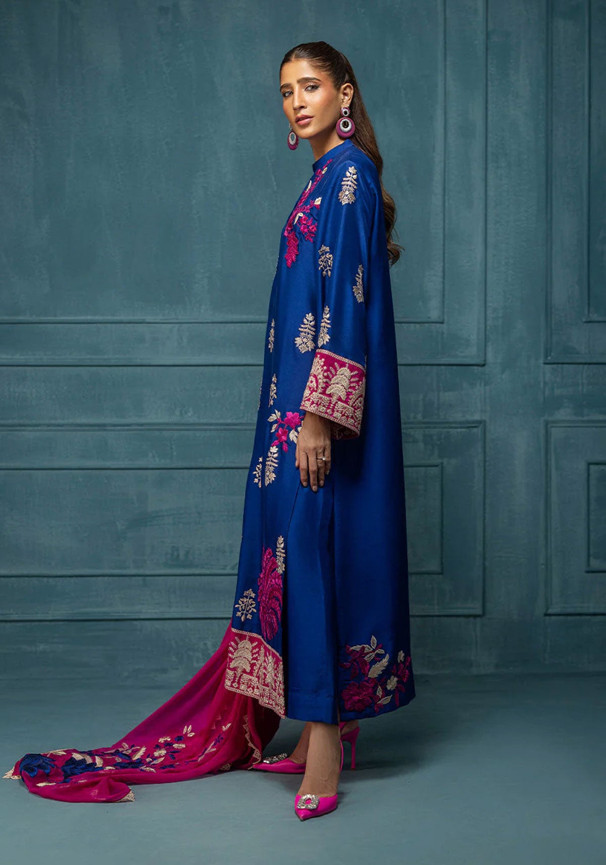 Mishyl, a stunning three-piece ensemble in a beautiful royal blue raw silk. The classic silhouette is brought to life by exquisite embroidery and ink motifs creating a magnificent visual contrast. The shirt is richly detailed with intricate floral bunches that cascade gracefully down the front with a nice bold border. The look is completed by a magnificent pink dupatta, which features its own beautiful floral embroidery and adds a layer of depth and sophistication. The show stopping detail is the delicate floral spray that adorns the back.