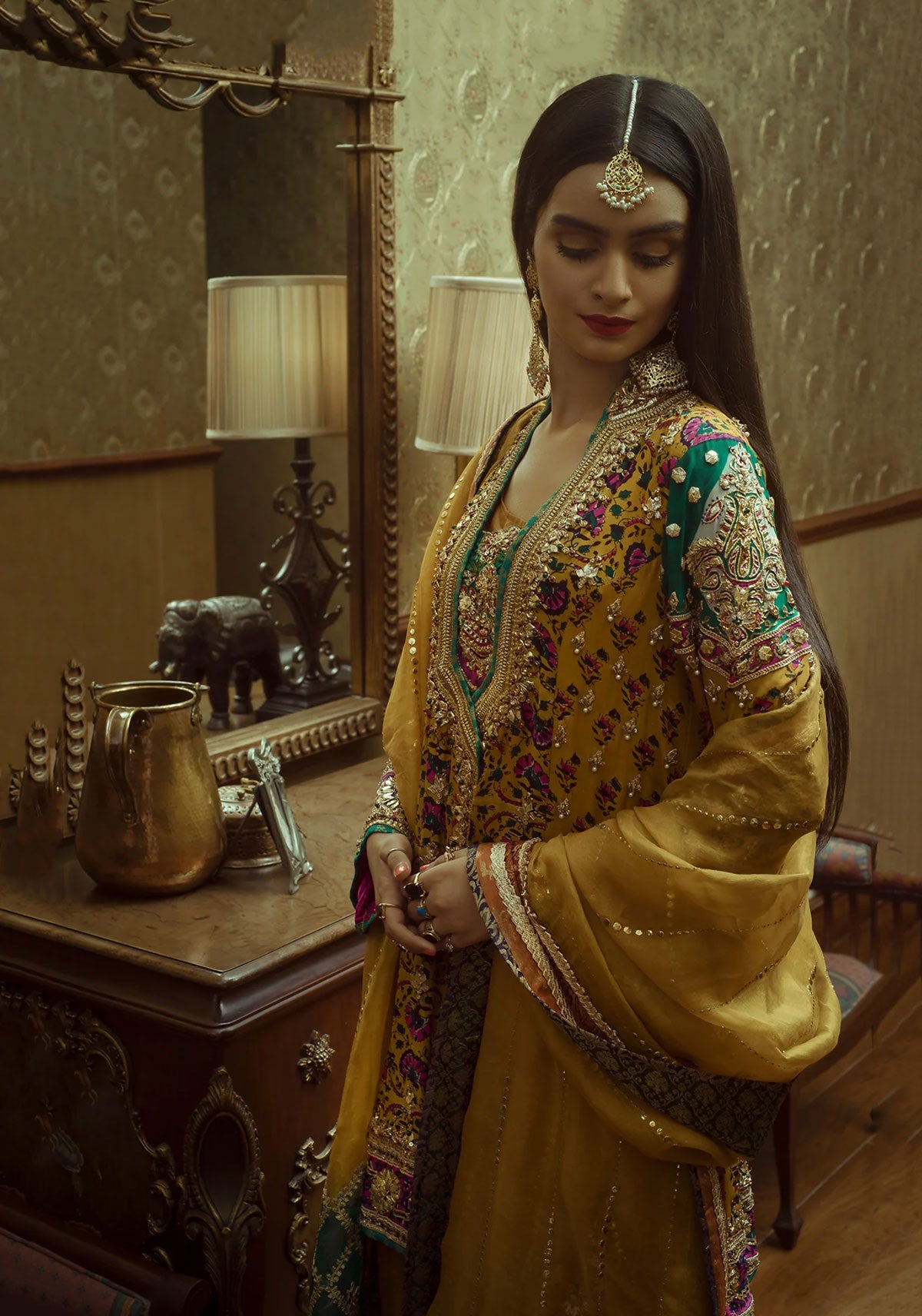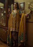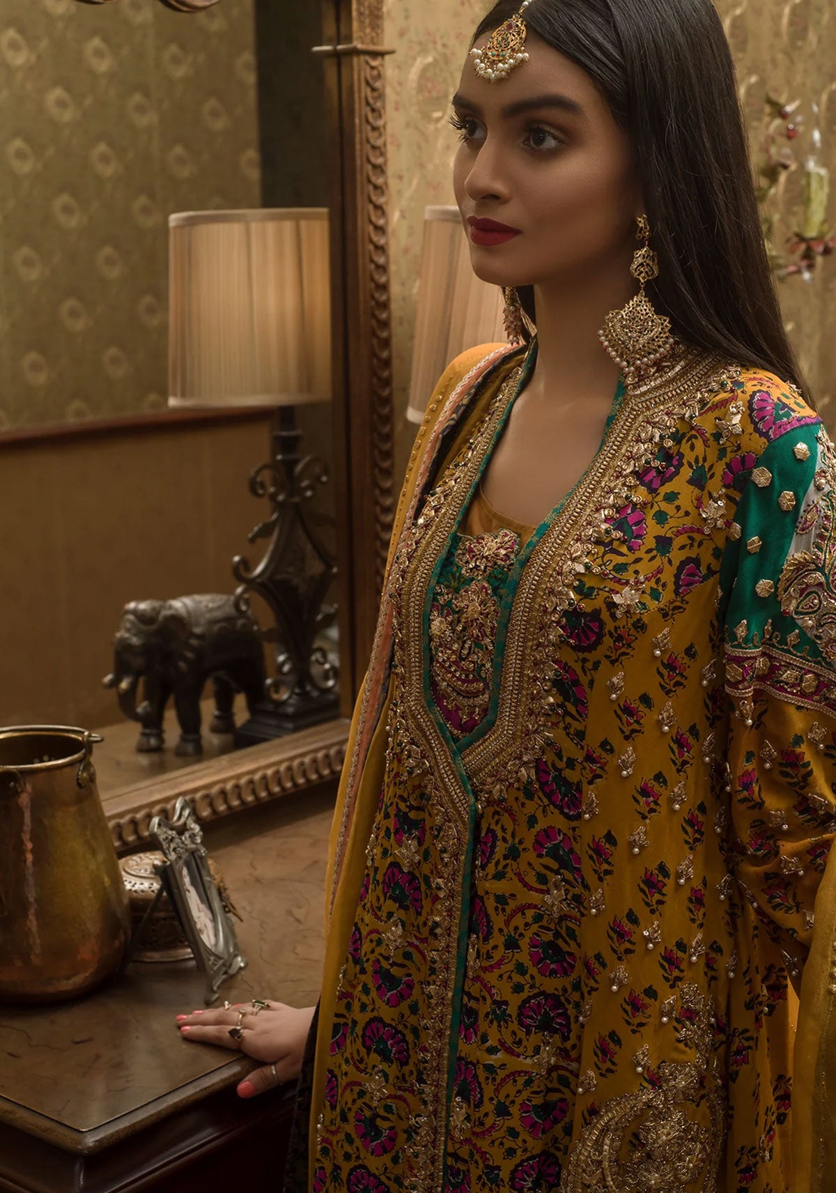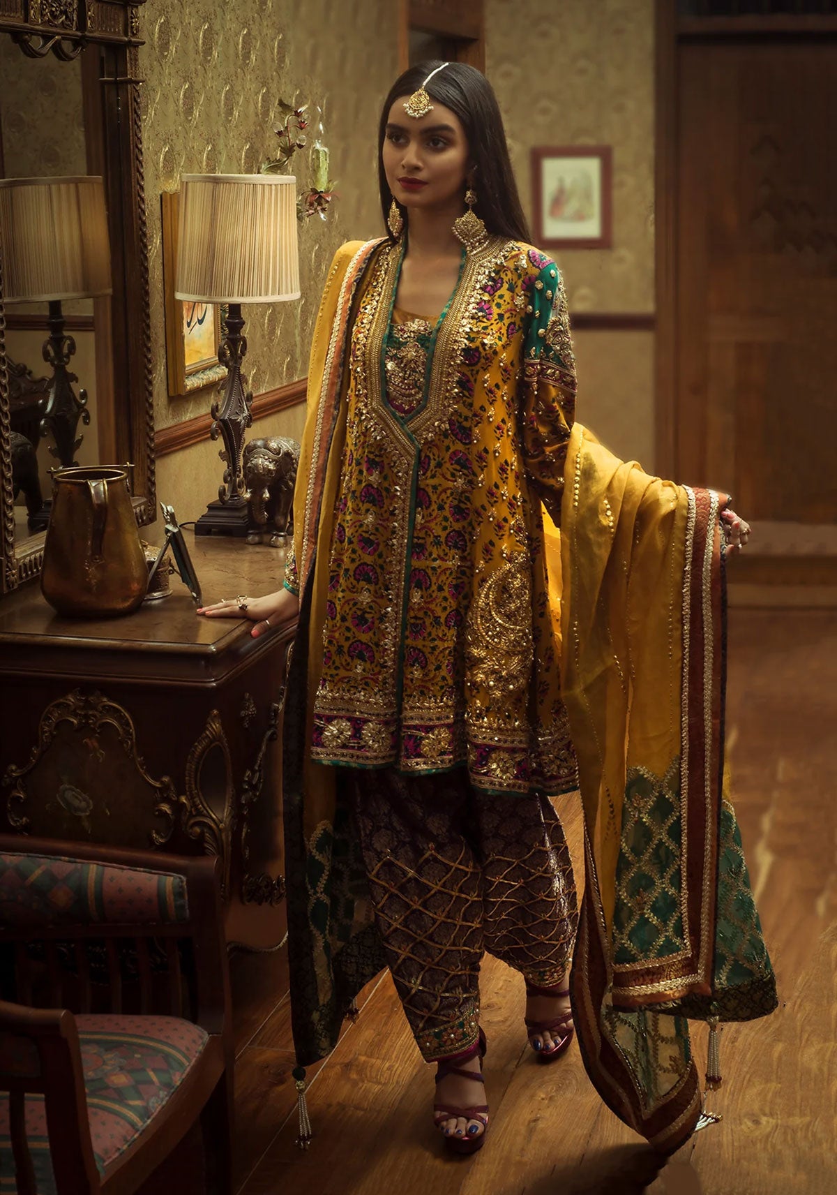 Block printed grip base angrakha cut short kurta paired with jacquard shalwar with gota and resham work.