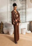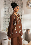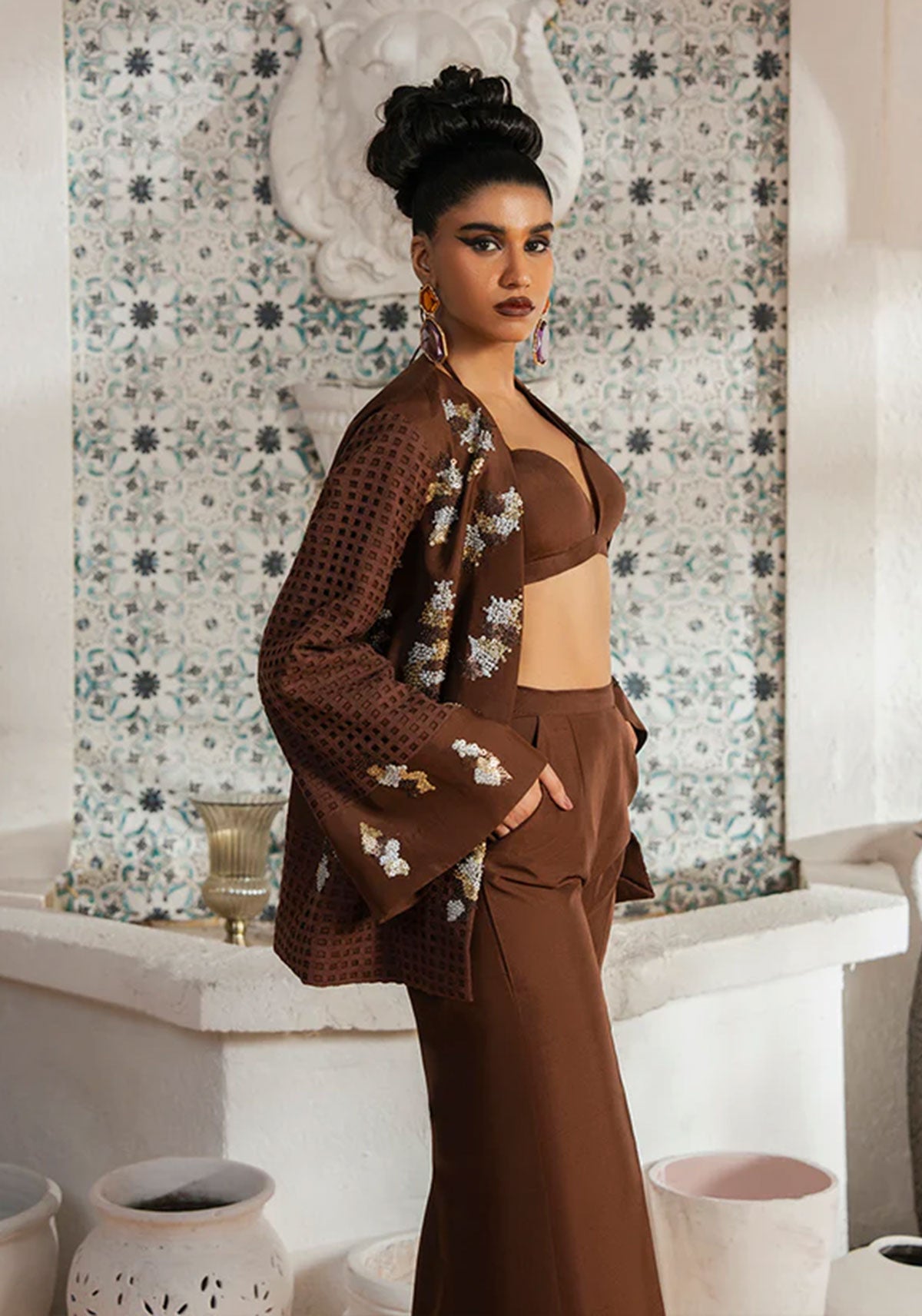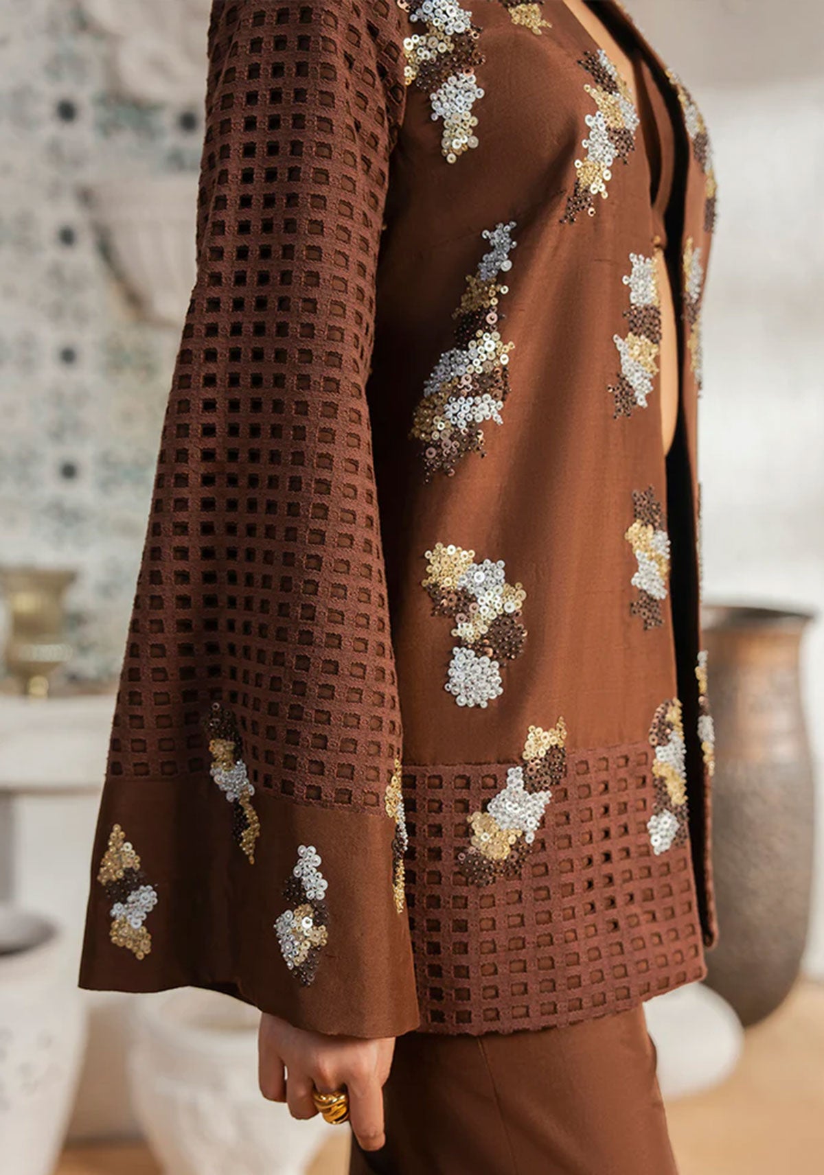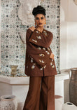 The highlight of the set is a richly hued dark mocha raw silk jacket, adorned with intricate crystal work and contrasting sequin embellishments that lend a touch of refined glamour. The fabric features a delicately textured finish, creating depth and visual interest in harmony with the embellishments. Paired with a coordinating piece raw silk pants this ensemble is perfect for festive events, semi-formal occasions, or refined evening gatherings.