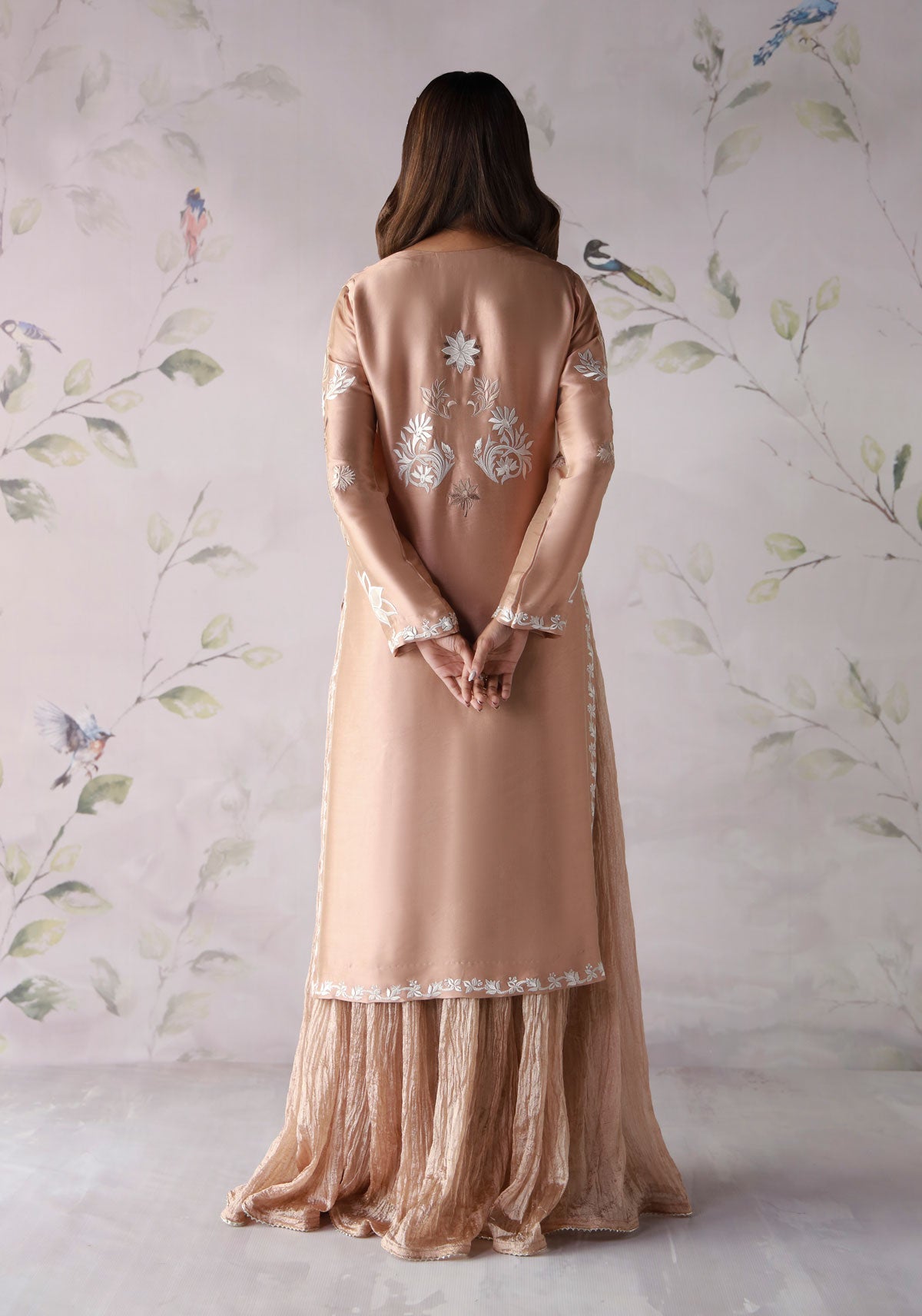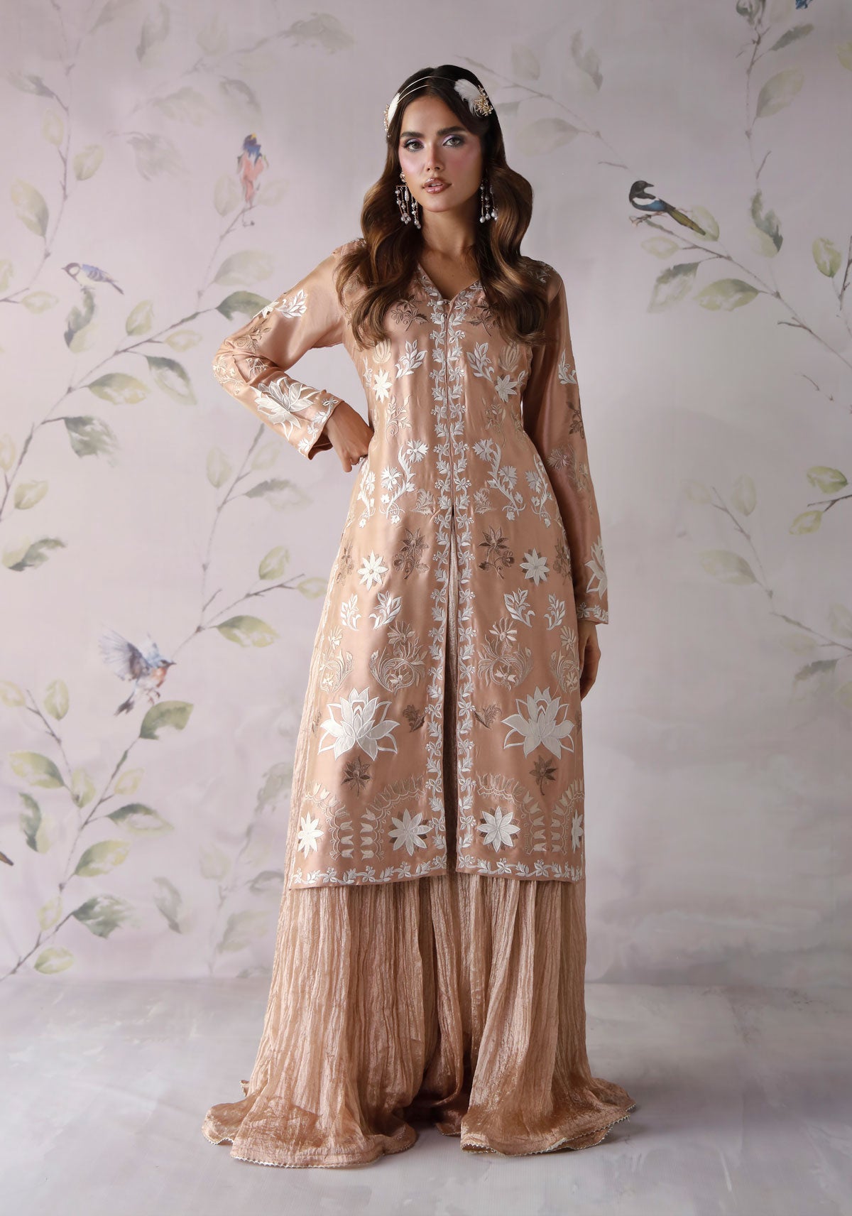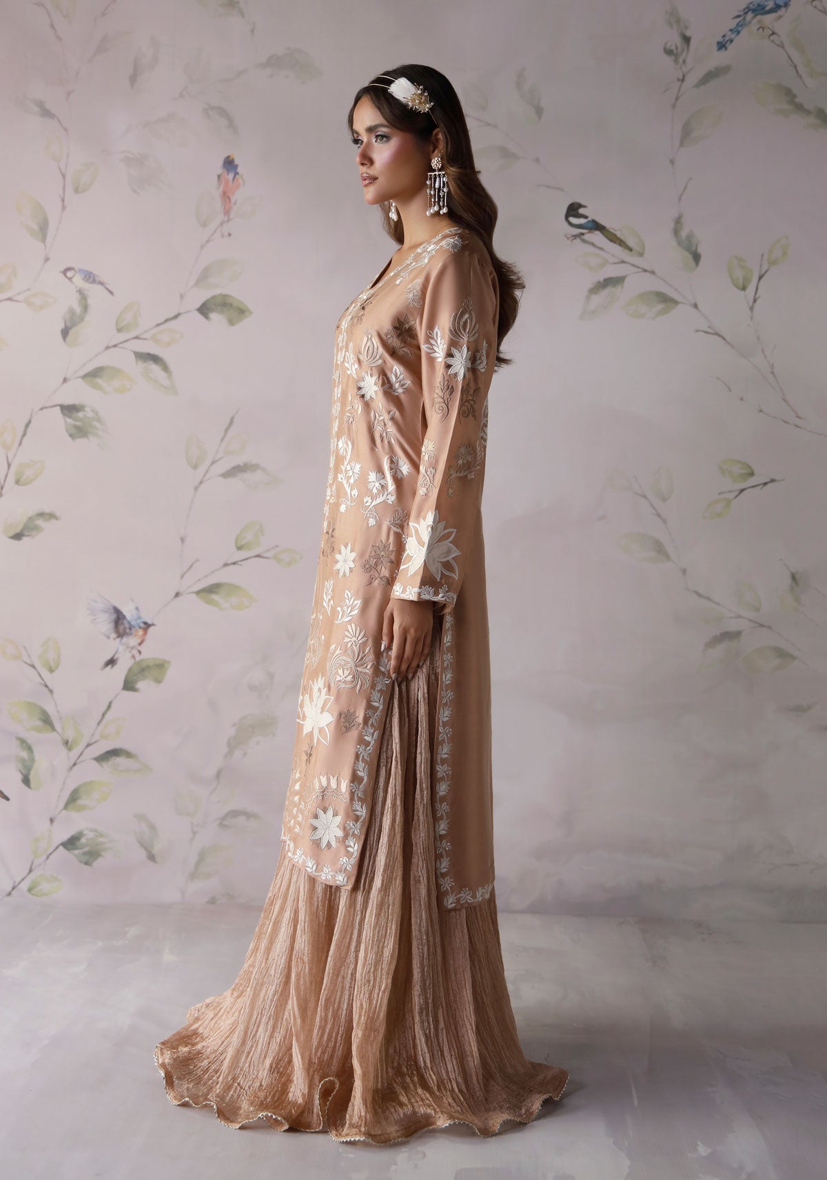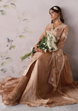A vision in warm earth tones — this pure butter silk shirt, crafted in rich shades of brown, is adorned with delicate ivory floral embroidery. Paired with crushed silk pants that mirror the golden undertones, the ensemble merges softness with structure, embodying quiet elegance and timeless charm.