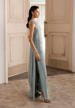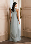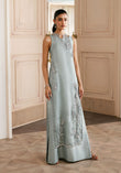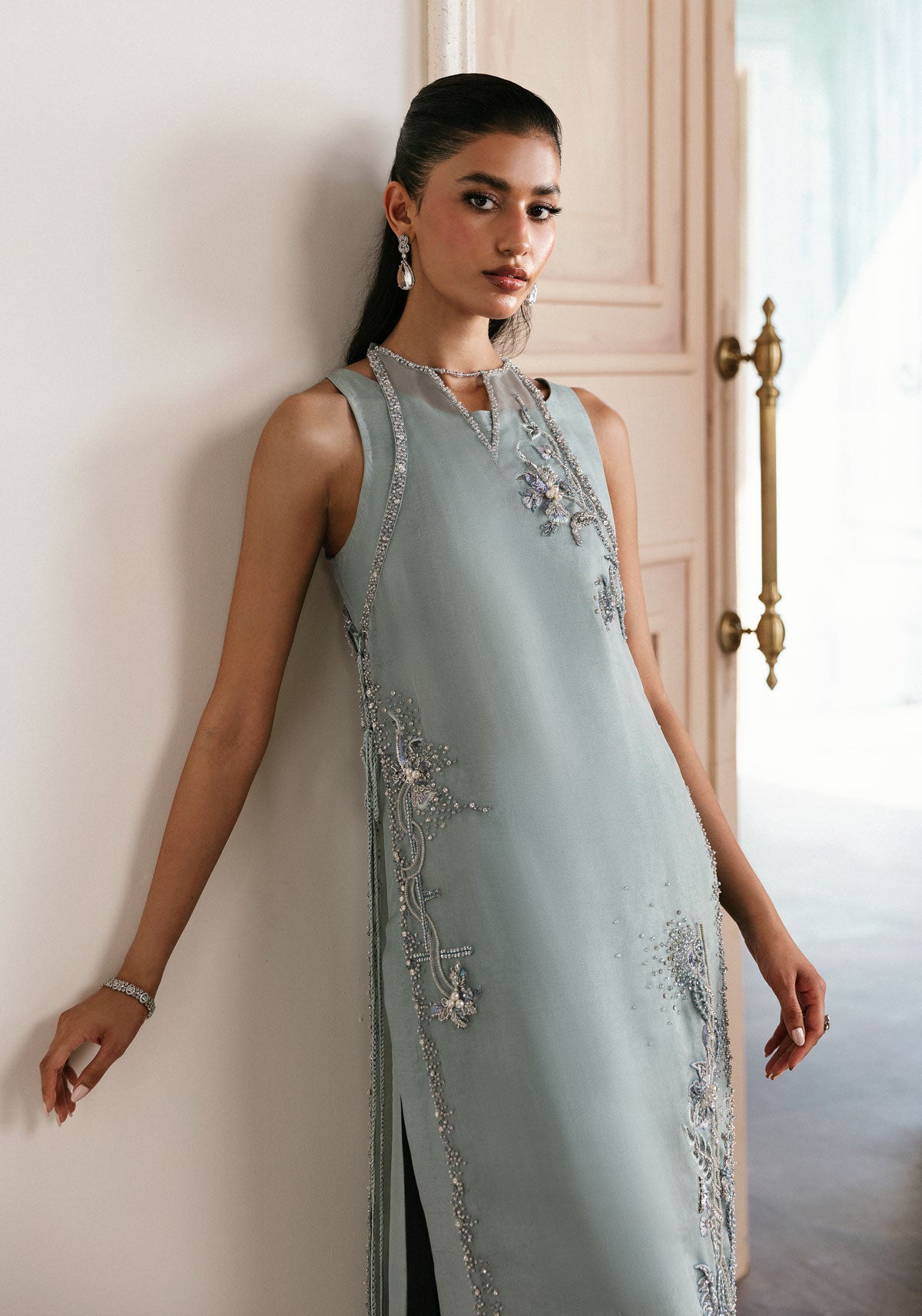 Exquisite organza and raw silk creation, masterfully embellished with tilla, naqshi, and dabka. Enhanced with pearls, crystals, sequence, and bethki, showcasing intricate fabric manipulation and embellishment techniques. Further paired with raw silk straight pants makes it a perfect fit for any formal occasion.