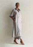 The Moonlit Bloom ensemble features a long shirt paired with intricately embroidered pants, crafted from pure cotton silk in a refined silvery grey hue. This sophisticated design highlights scalloped collars, kurta patti, sleeve cuffs, and pocket areas adorned with vibrant multi-colour embroidery. The shirt's subtly dropped corners and delicate fringe detailing on the daaman add an elegant finishing touch.