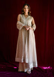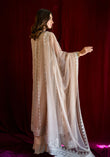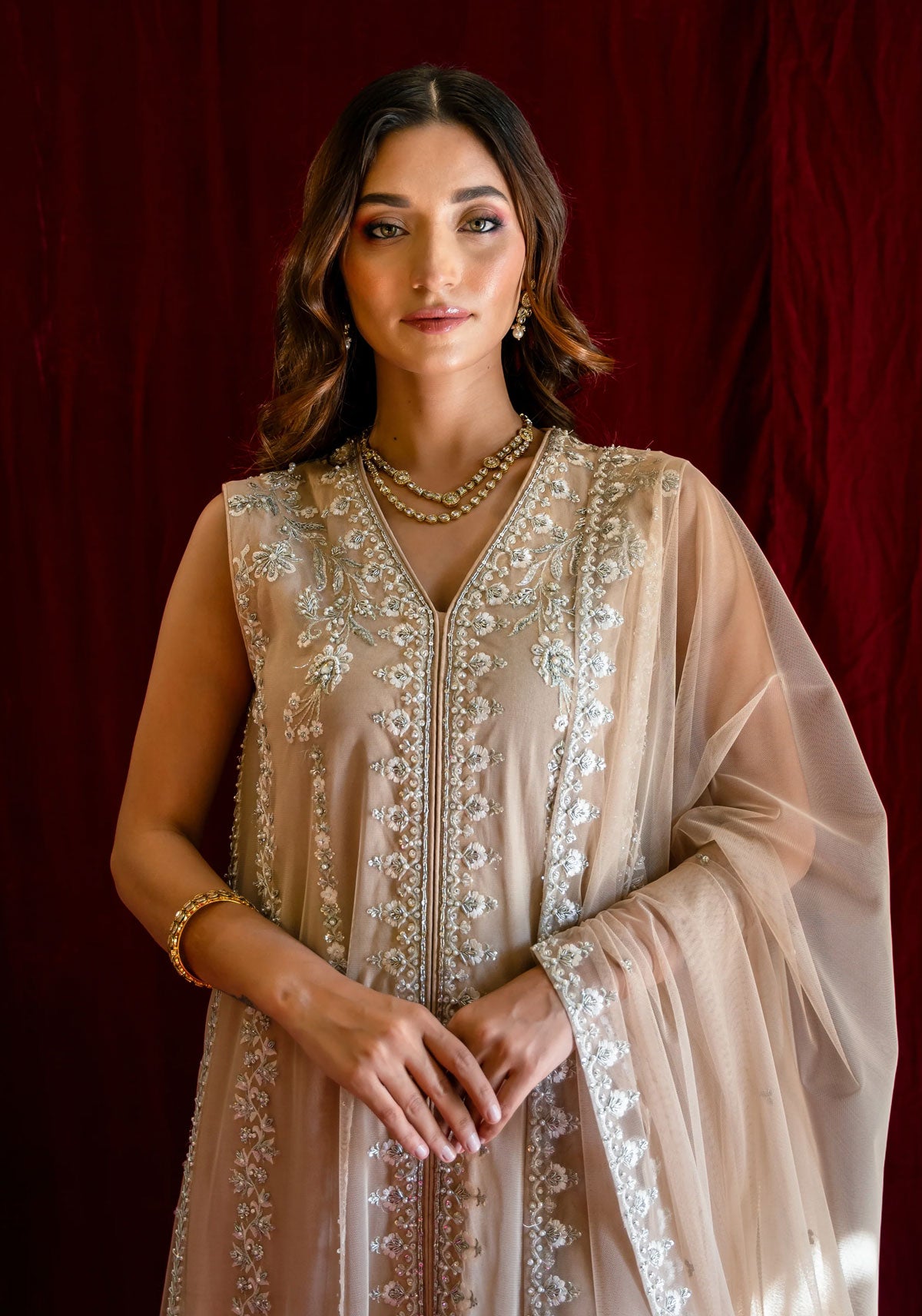 A breathtaking, long, front-open kameez that embodies luxury and refinement. Crafted from exquisite net fabric, intricately embroidered with resham and silver zardozi, and adorned with luminous pearls, glittering sequins & jewel accents, exudes a soft, ethereal radiance. This stunning ensemble includes an embroidered net dupatta with narrow borders & enhanced palu with dispersed chan, and flowy silk pants, providing a comfortable and elegant silhouette. Perfect for any occasion, Mystique blends traditional craftsmanship with modern elegance, leaving a lasting impression.