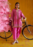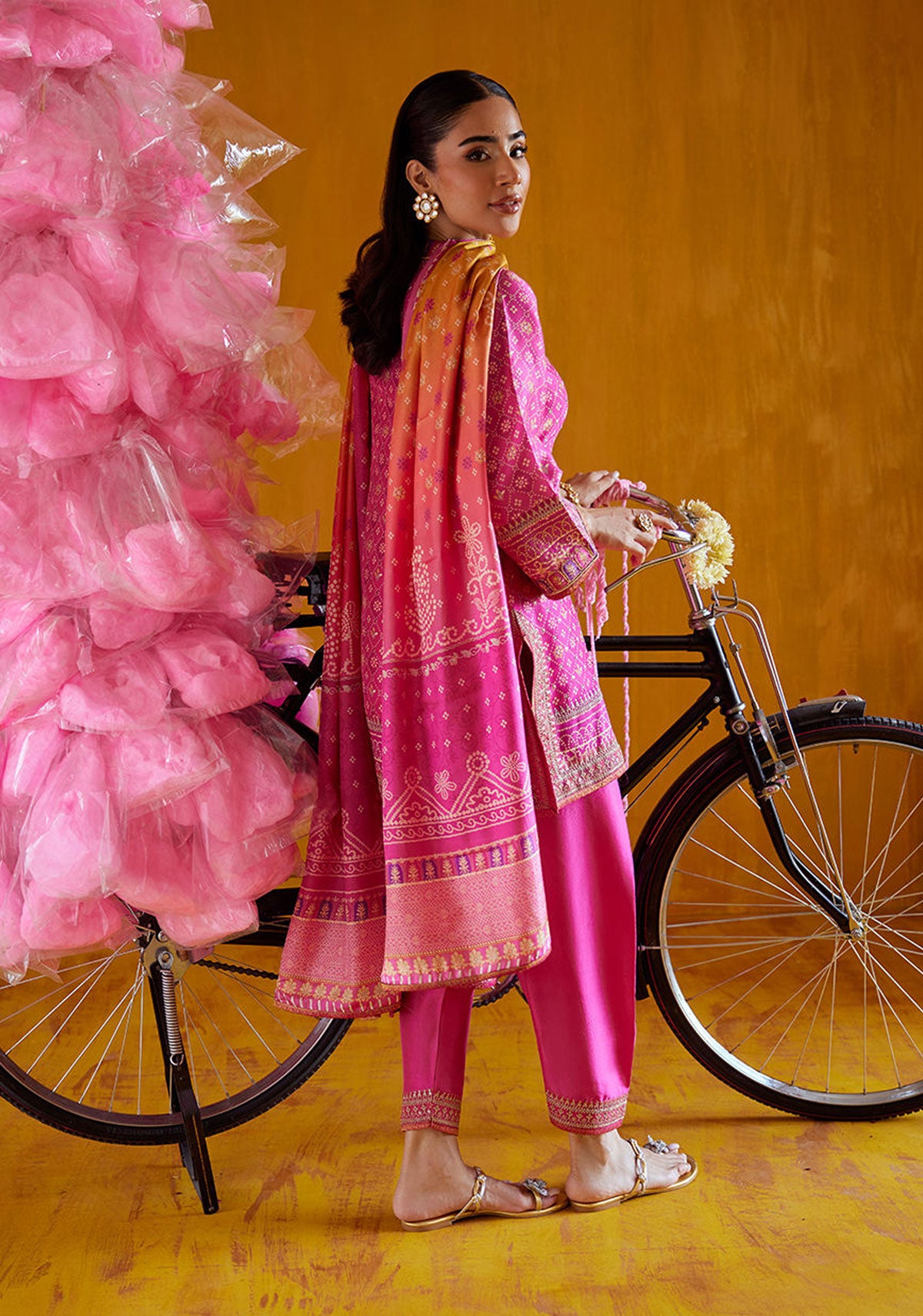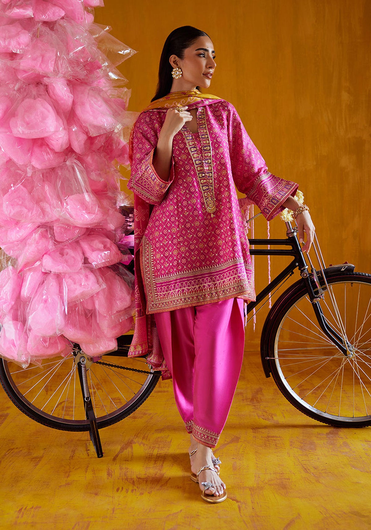 A vibrant nod to modern-day glamour, this digitally printed, hot pink raw silk ensemble is designed to flatter and endure. The thigh-skimming shirt, richly hand-embellished with sequins, gota, and aari, is universally flattering, while the tapered raw silk shalwar ensures timeless versatility. The pure medium silk dupatta is given an eye catching ombre treatment