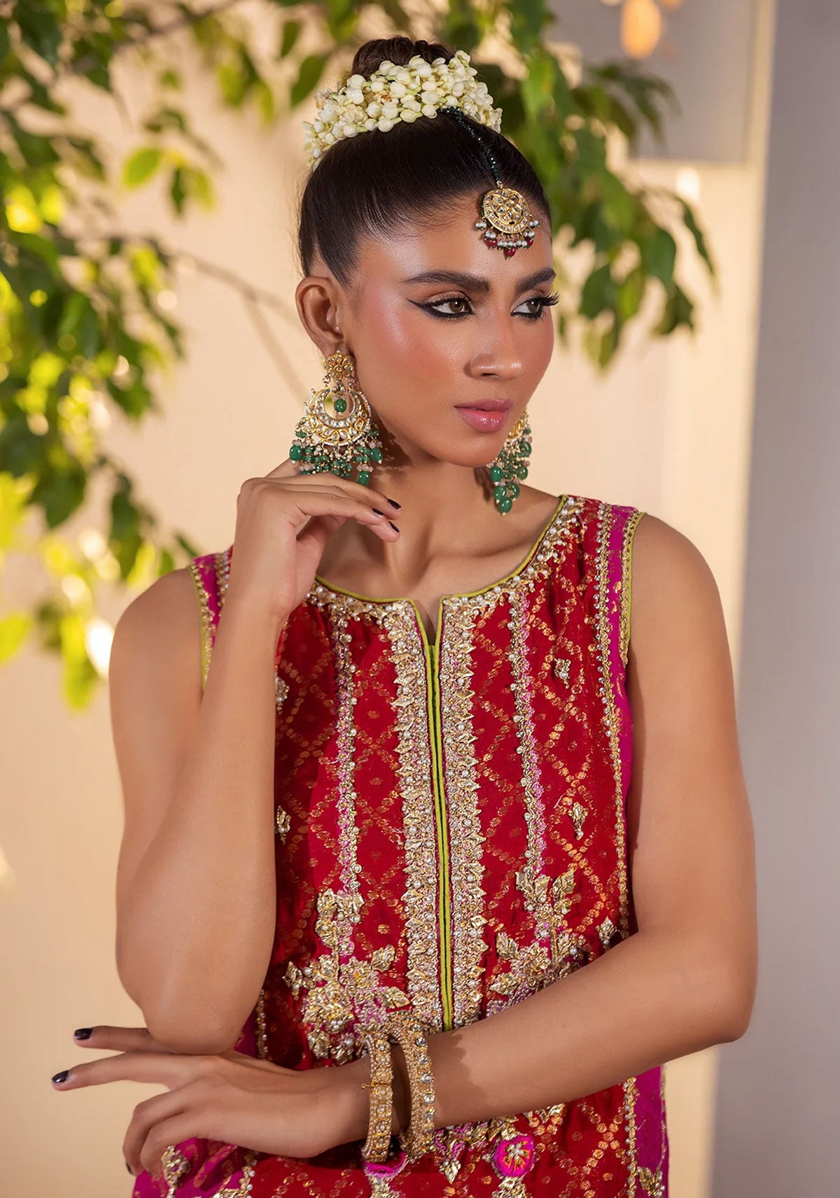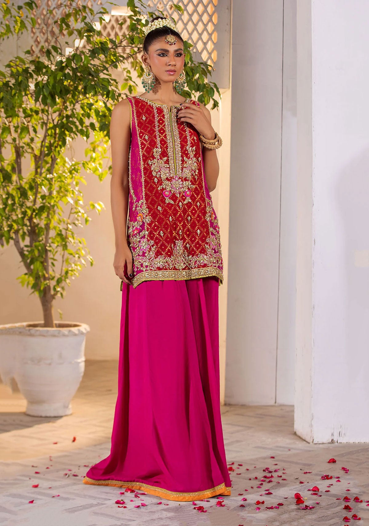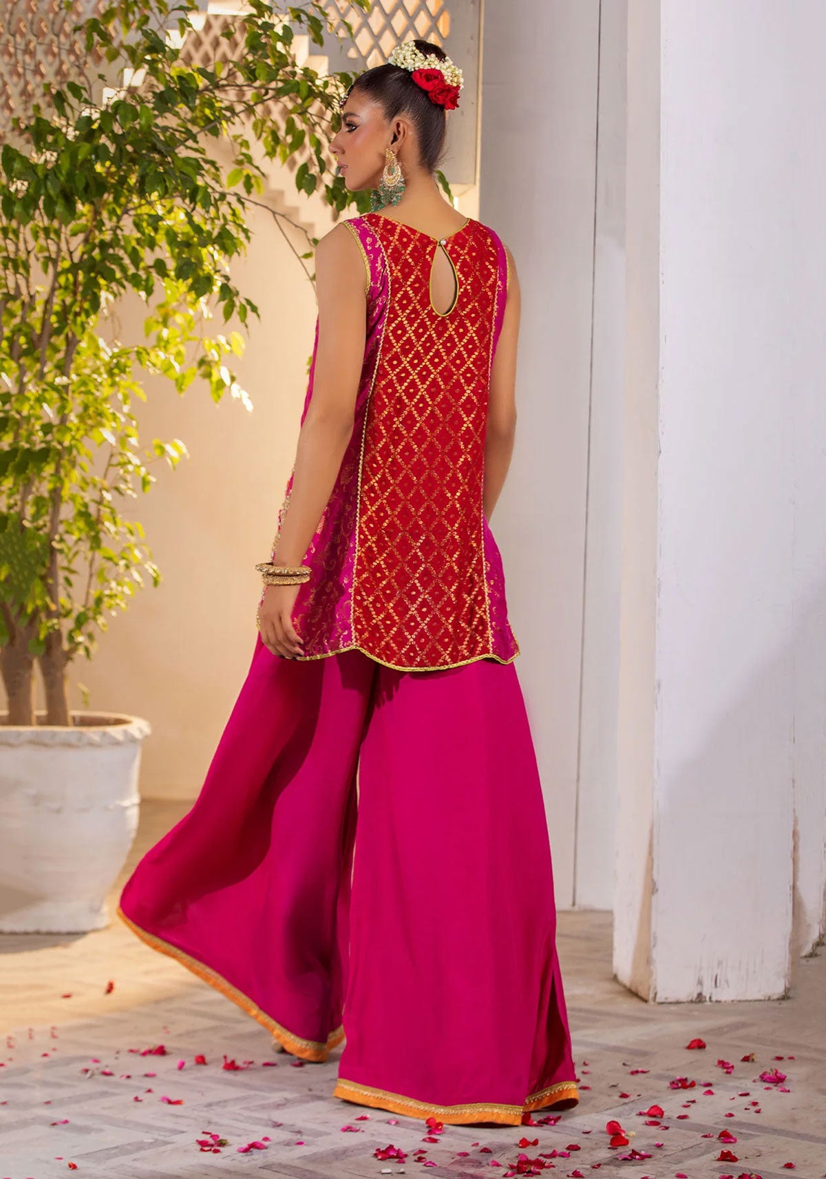 Effervescent allure meets intricate craftsmanship in this sleeveless sensation, adorned with a medley of tilla, resham, gota, and zari handwork. Enhanced by the grace of jamawar and organza pipings, it's paired with a hot pink sharara.
