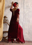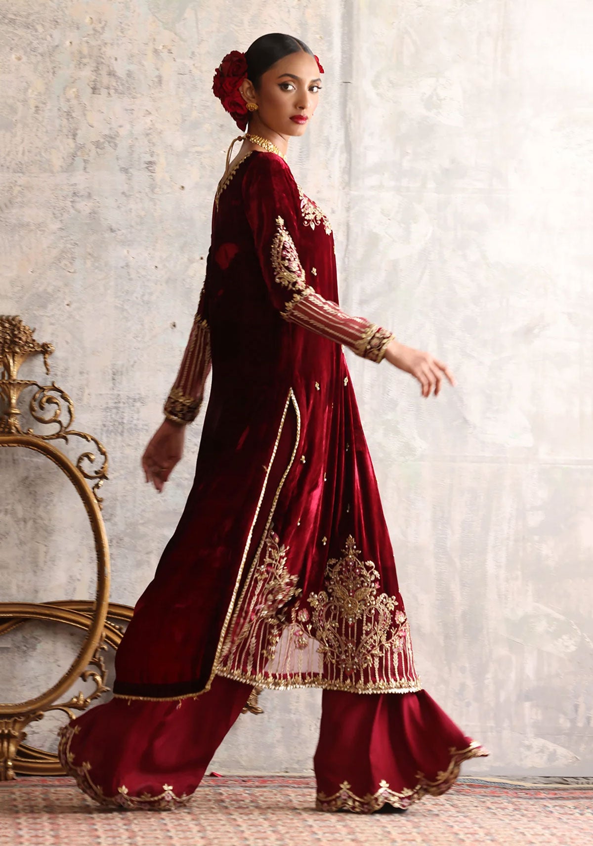 Embrace timeless elegance with this regal red ensemble, featuring a luxurious velvet kameez adorned with golden gota work and intricate resham thread embroidery. The neckline dazzles with zardozi, colored stones, and pearls, while organza patches add texture and grace. Paired with sleek silk wide-legged pants embellished with resham embroidered borders and finished with rich jamawar detailing, this outfit exudes royal opulence, a true ode to heritage craftsmanship.