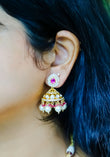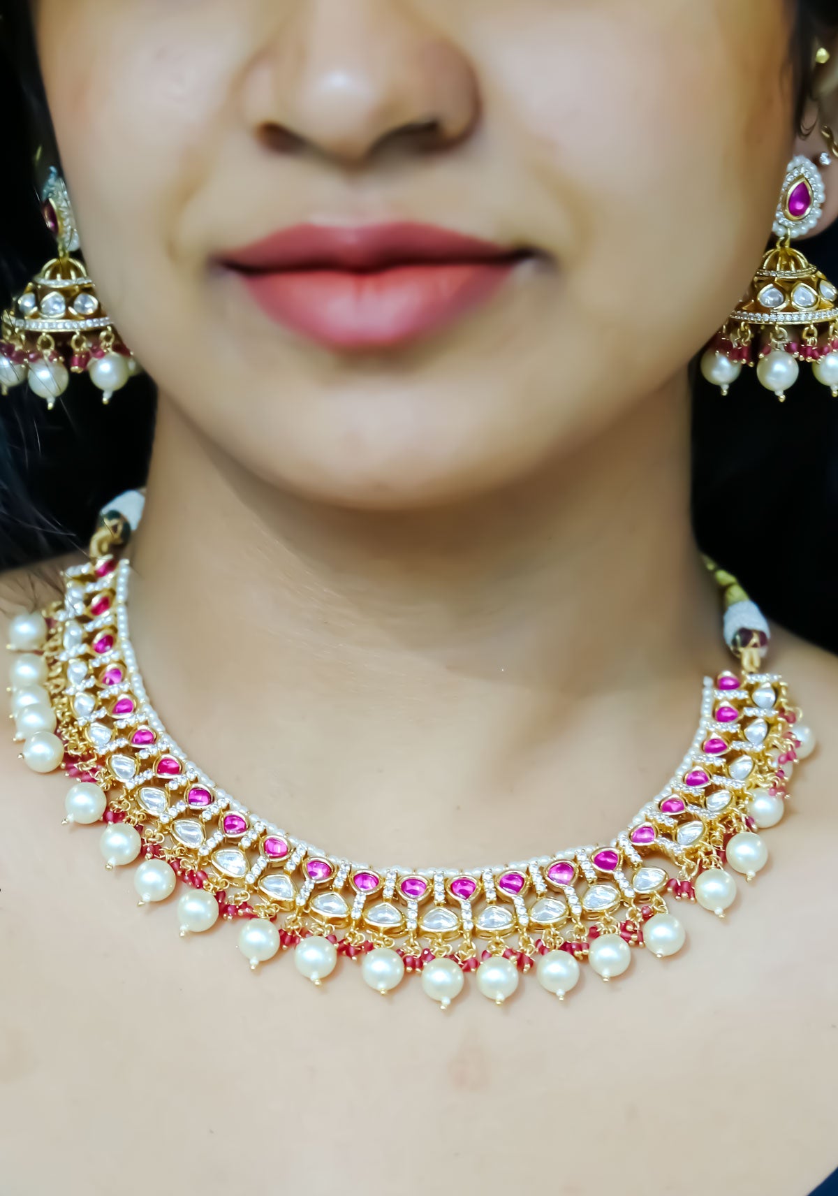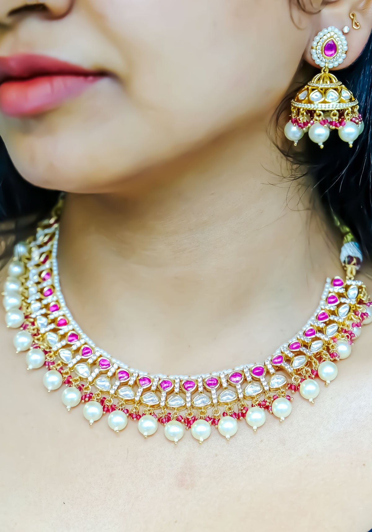 The matching earrings mirror the necklace’s grandeur, showcasing red polki stones paired with pearl drops, creating a coordinated and sophisticated look.