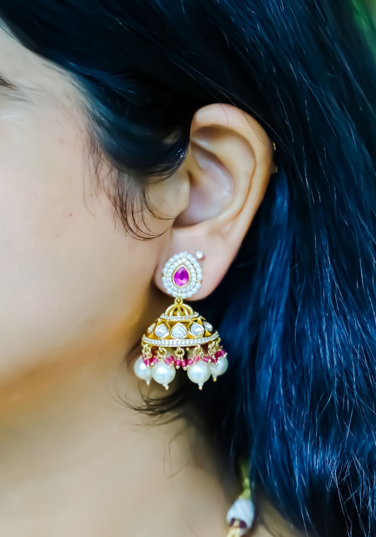 A larger central polki or pearl drop may serve as the focal point, often surrounded by delicate gold beading or micro-enamel work for added richness.