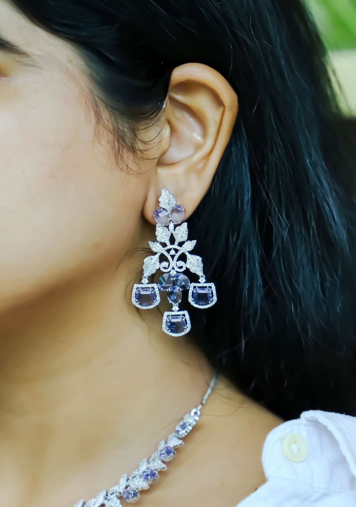 The matching earrings carry the same graceful aesthetic, each showcasing an amethyst Swarovski centerpiece framed by sparkling clear crystals, creating a harmonious and coordinated look.
