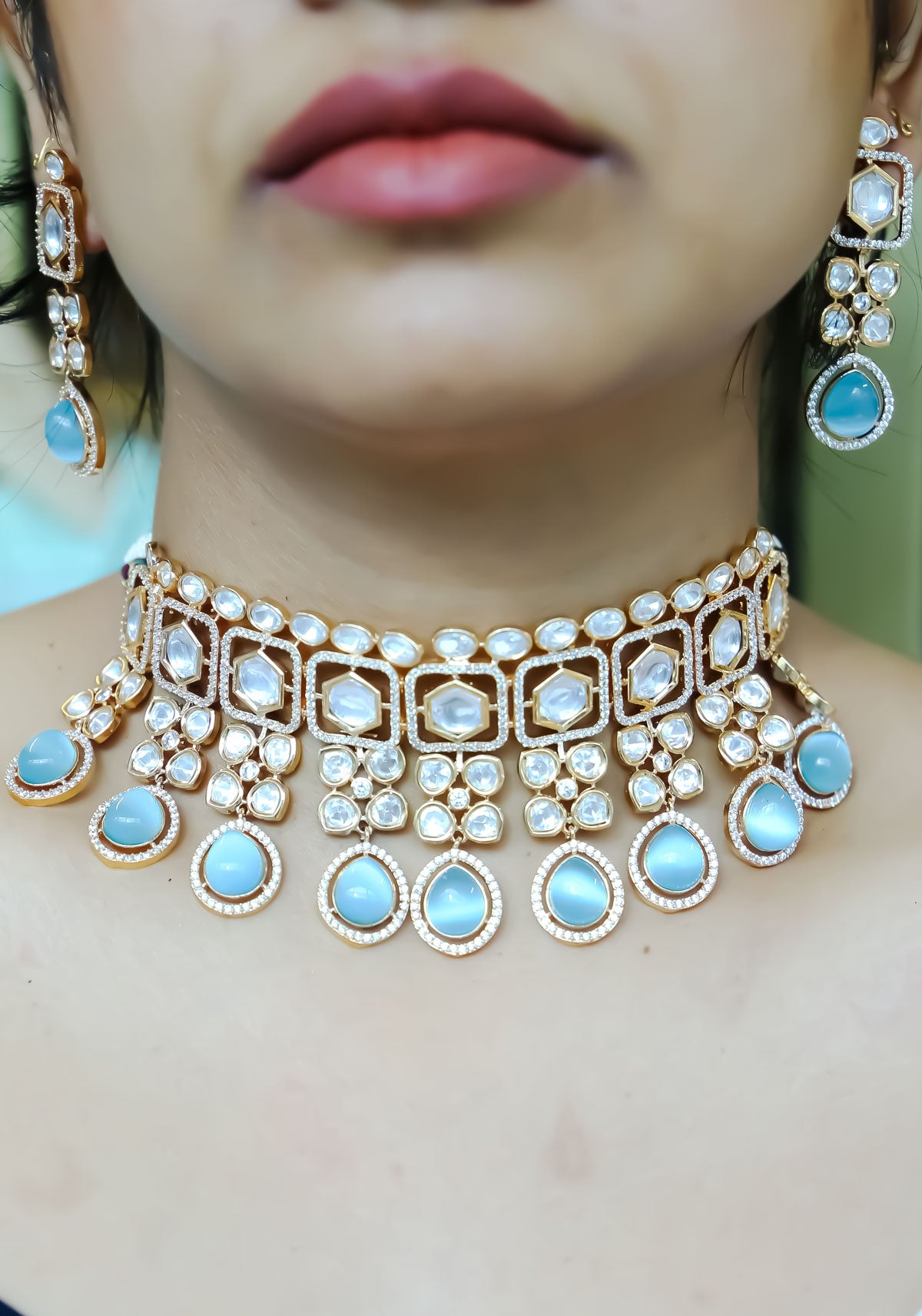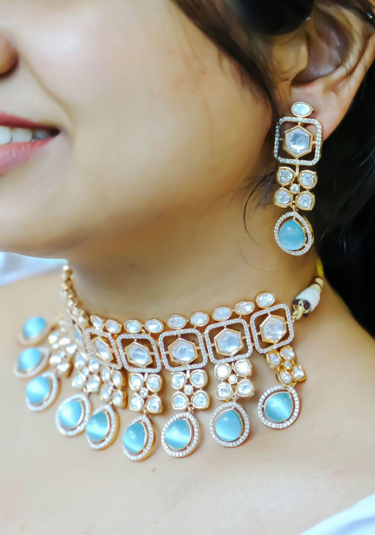 This aquamarine polki necklace set is a breathtaking blend of pastel elegance and timeless heritage design.