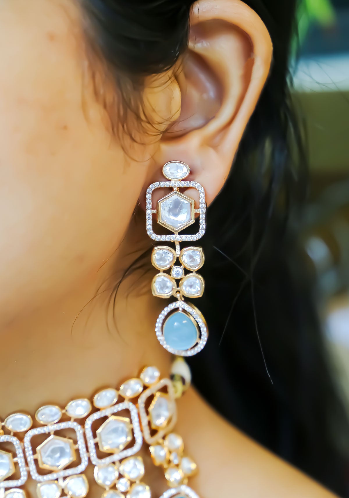The matching earrings echo the same artistry, featuring a central aquamarine stone surrounded by a halo of polki, creating a harmonious, coordinated look.