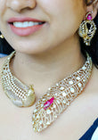 This peacock-inspired necklace set is a stunning fusion of regal charm and intricate craftsmanship, designed in a silver base and adorned with brilliant zirconia and rich ruby accents.
