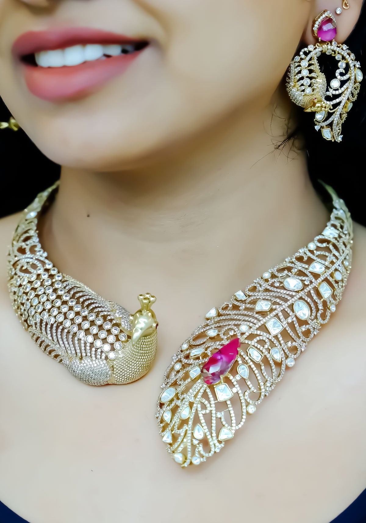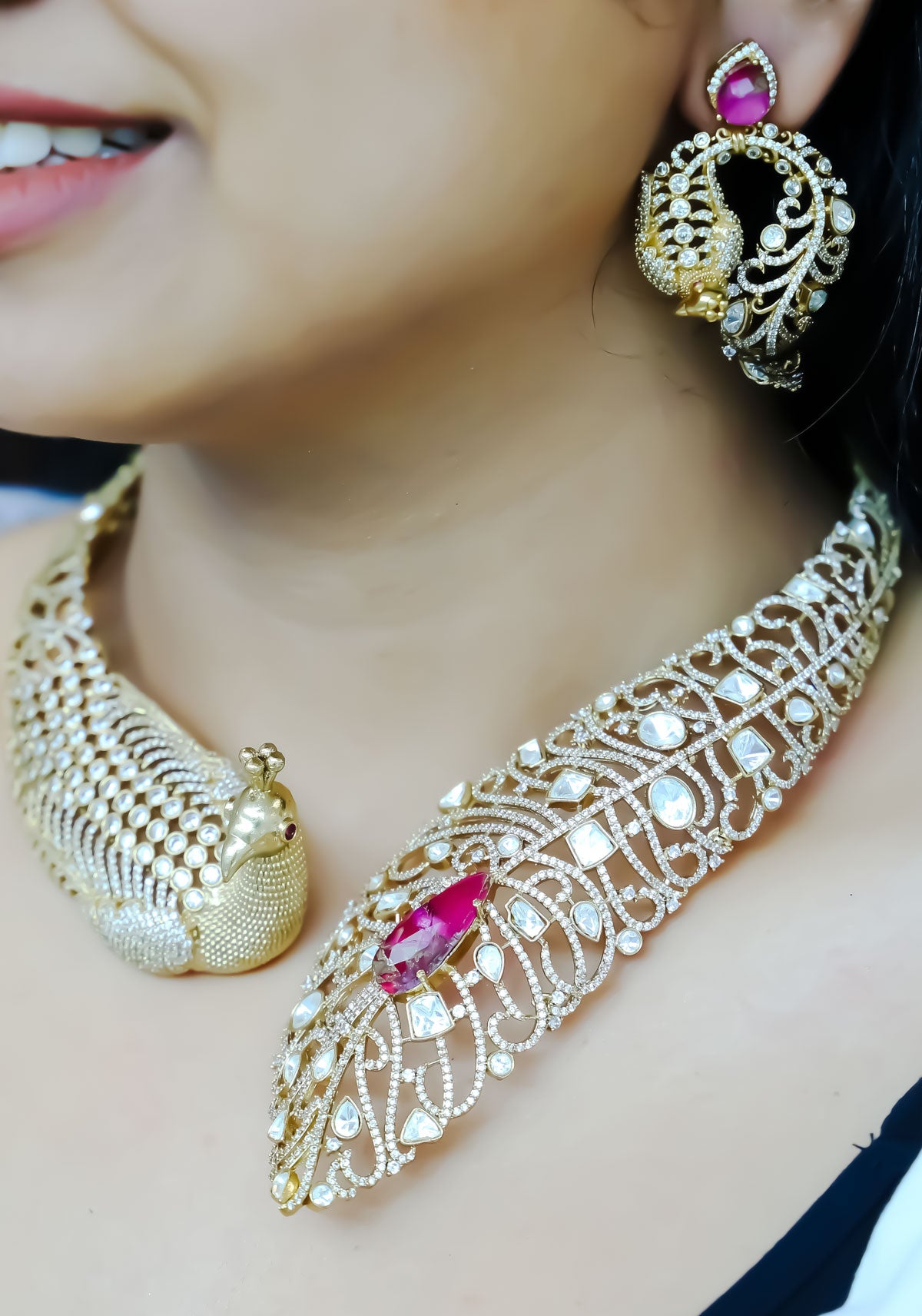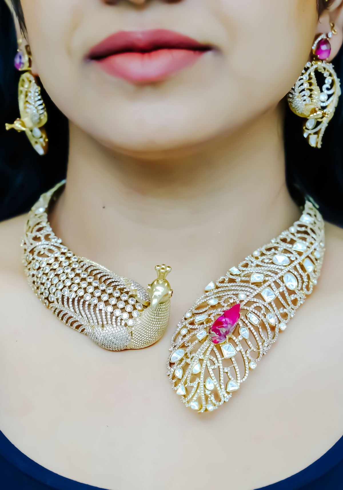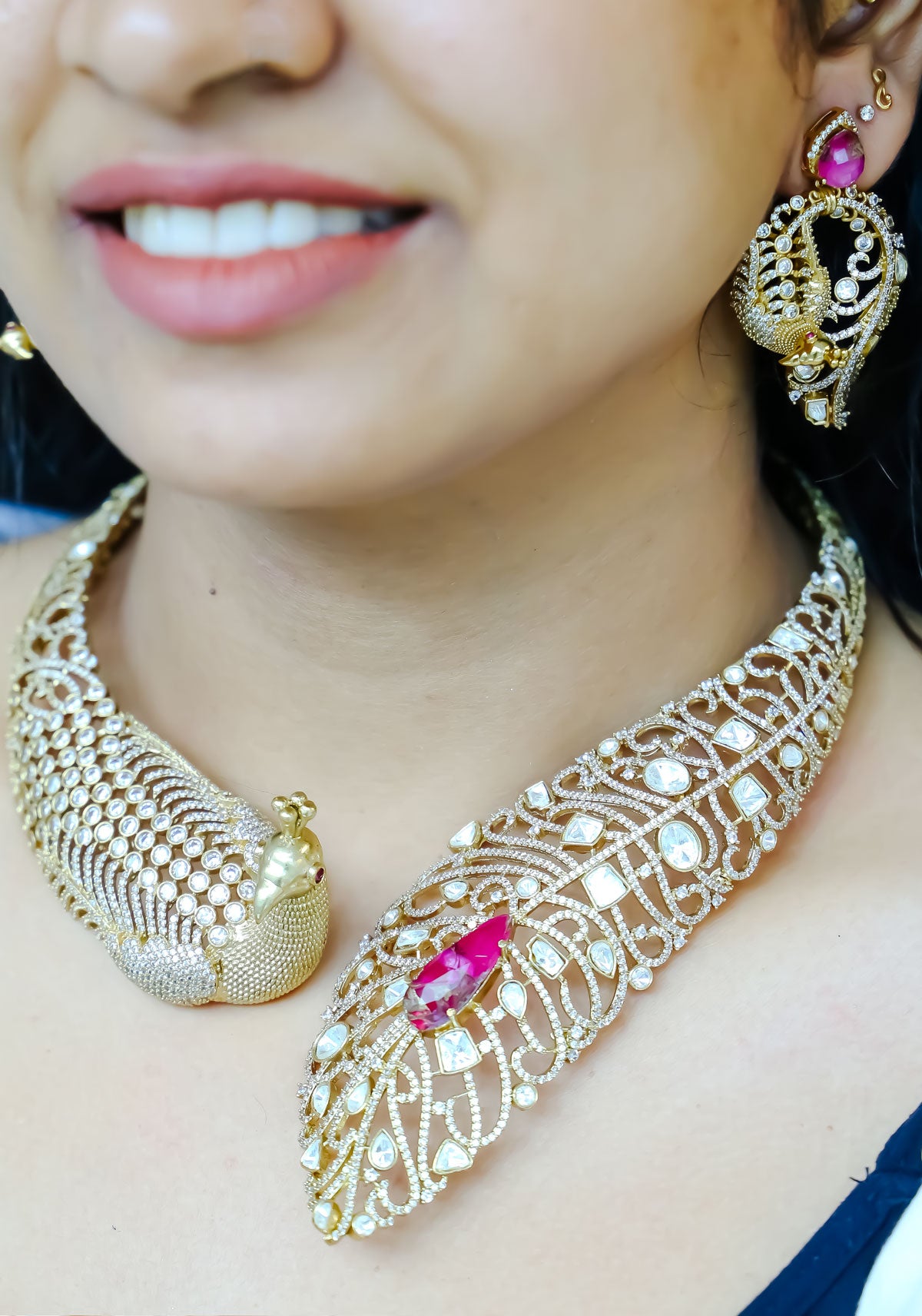 The matching earrings mirror the same peacock-inspired artistry, with cascading zirconia stones and ruby accents that echo the necklace’s central theme. Their elegant drop silhouette frames the face beautifully, making them perfect for statement styling.