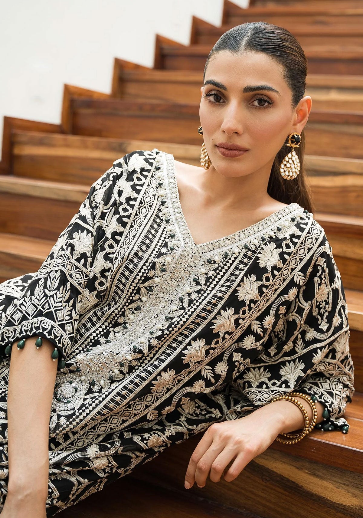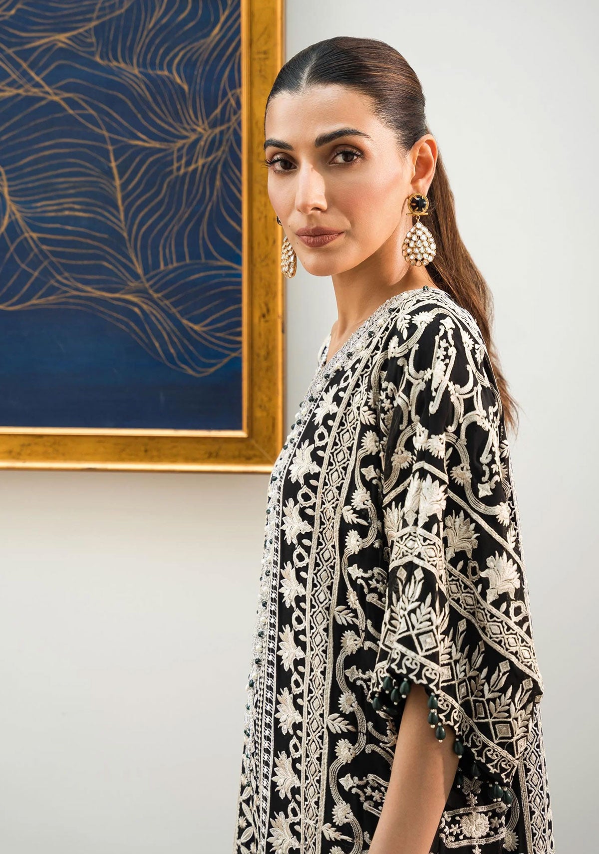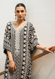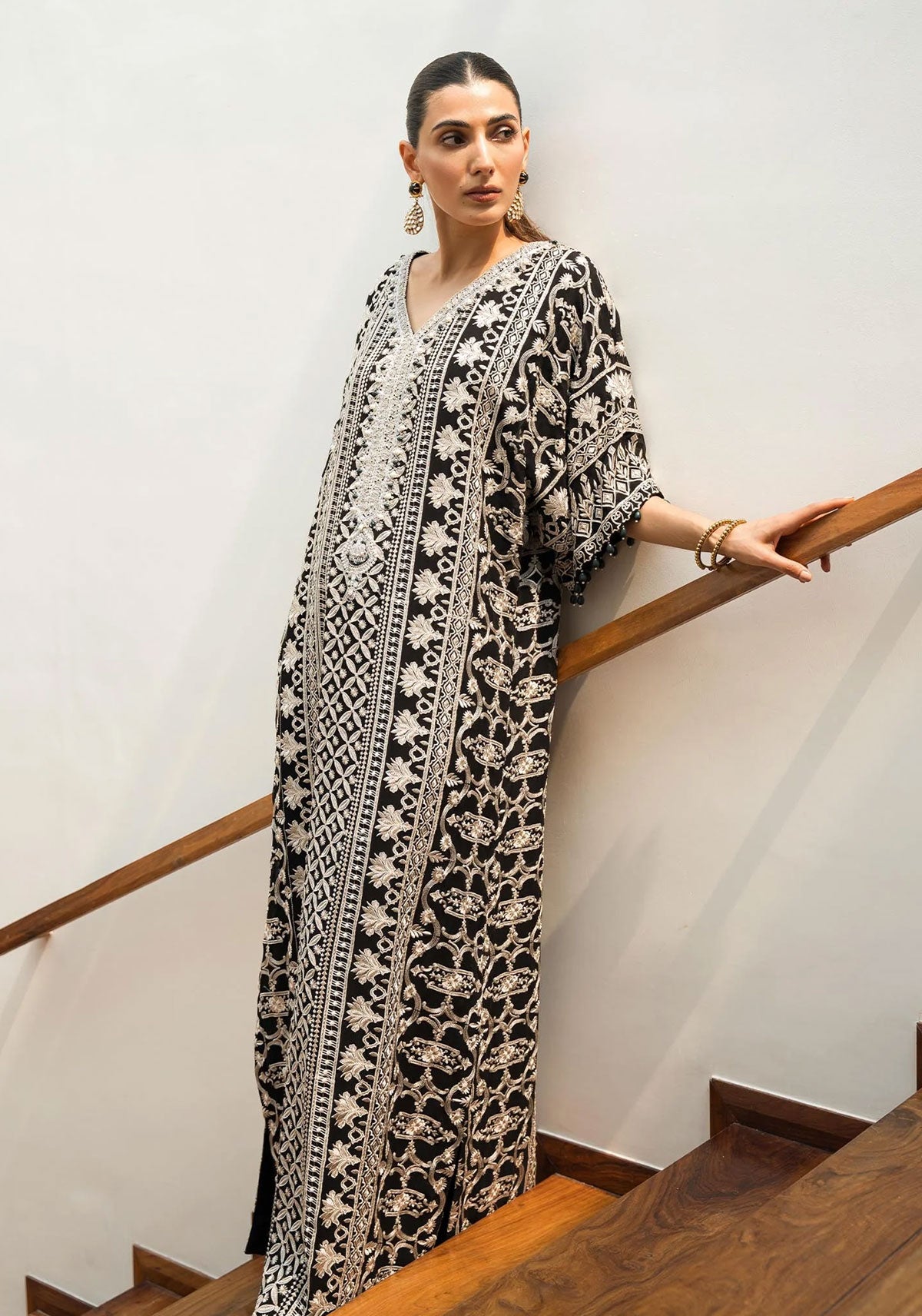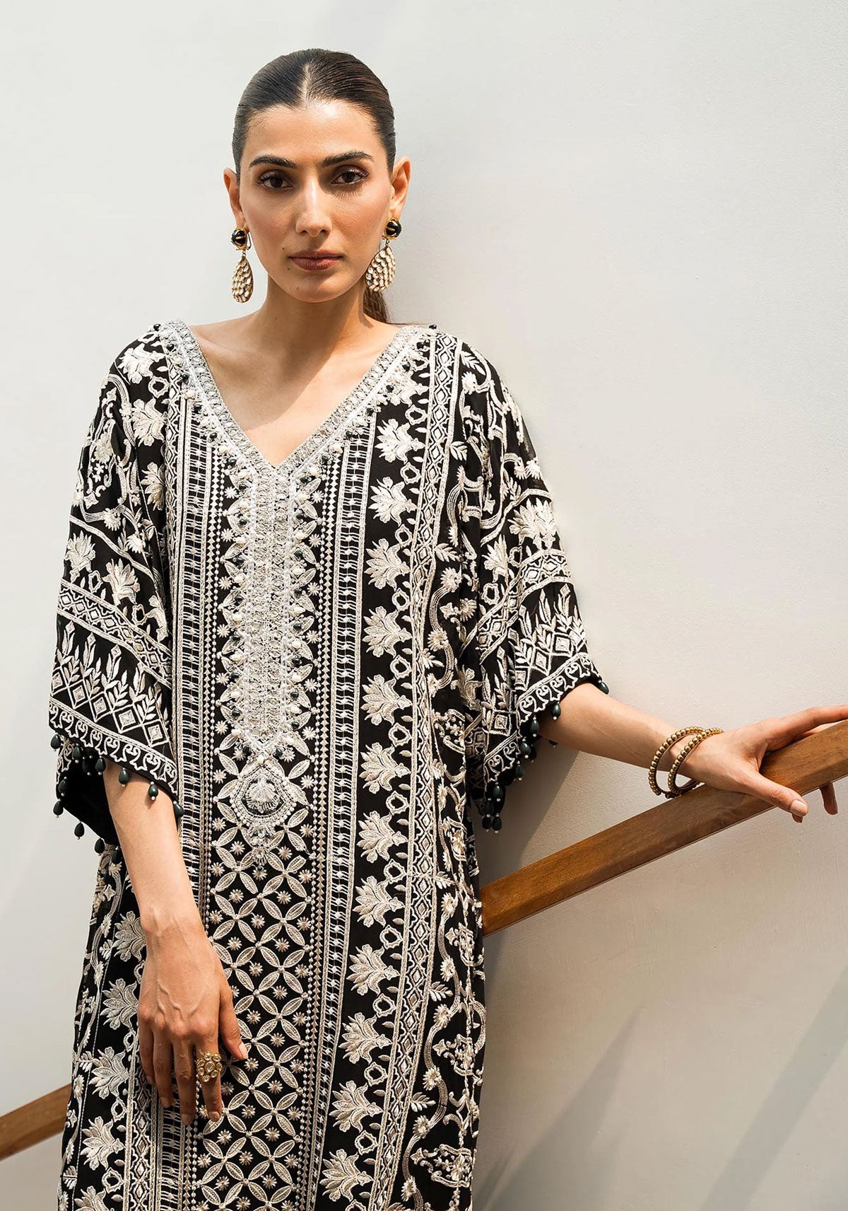 'Quintessential MAHGUL style encapsulated in this beautifully embroidered kaftan with an intricately hand embellished neck featuring signature zardozi and gota work.