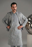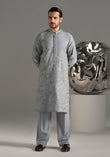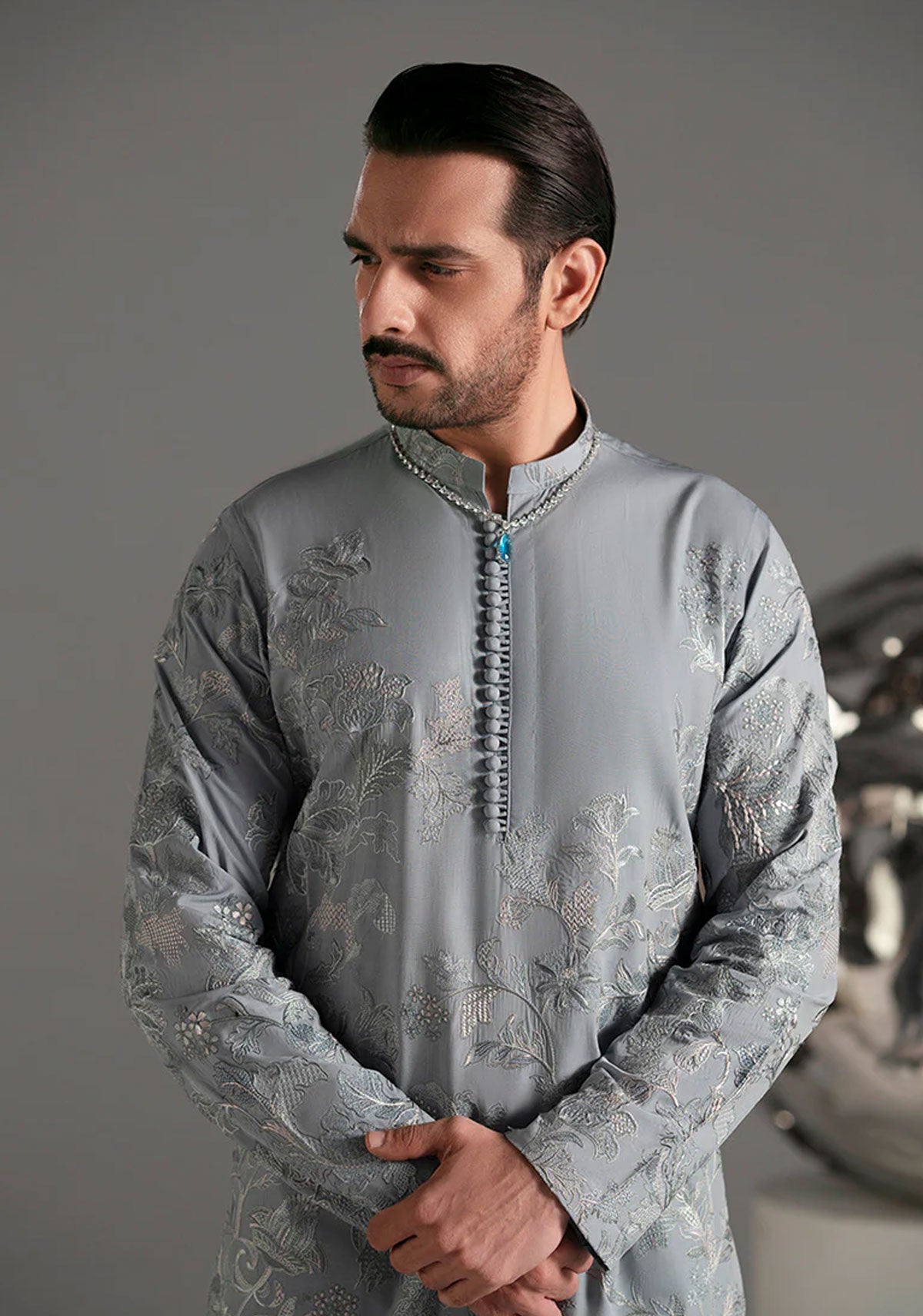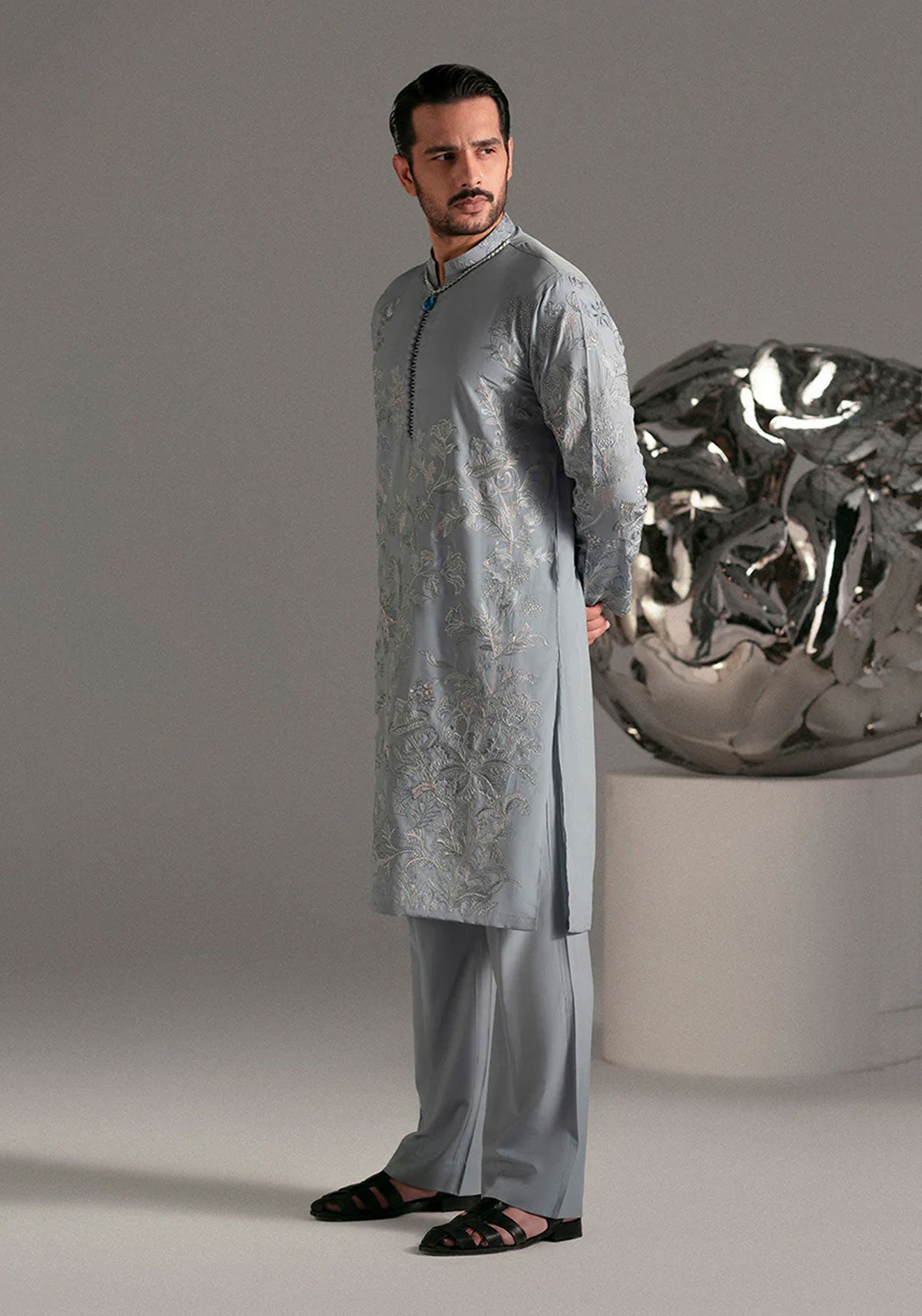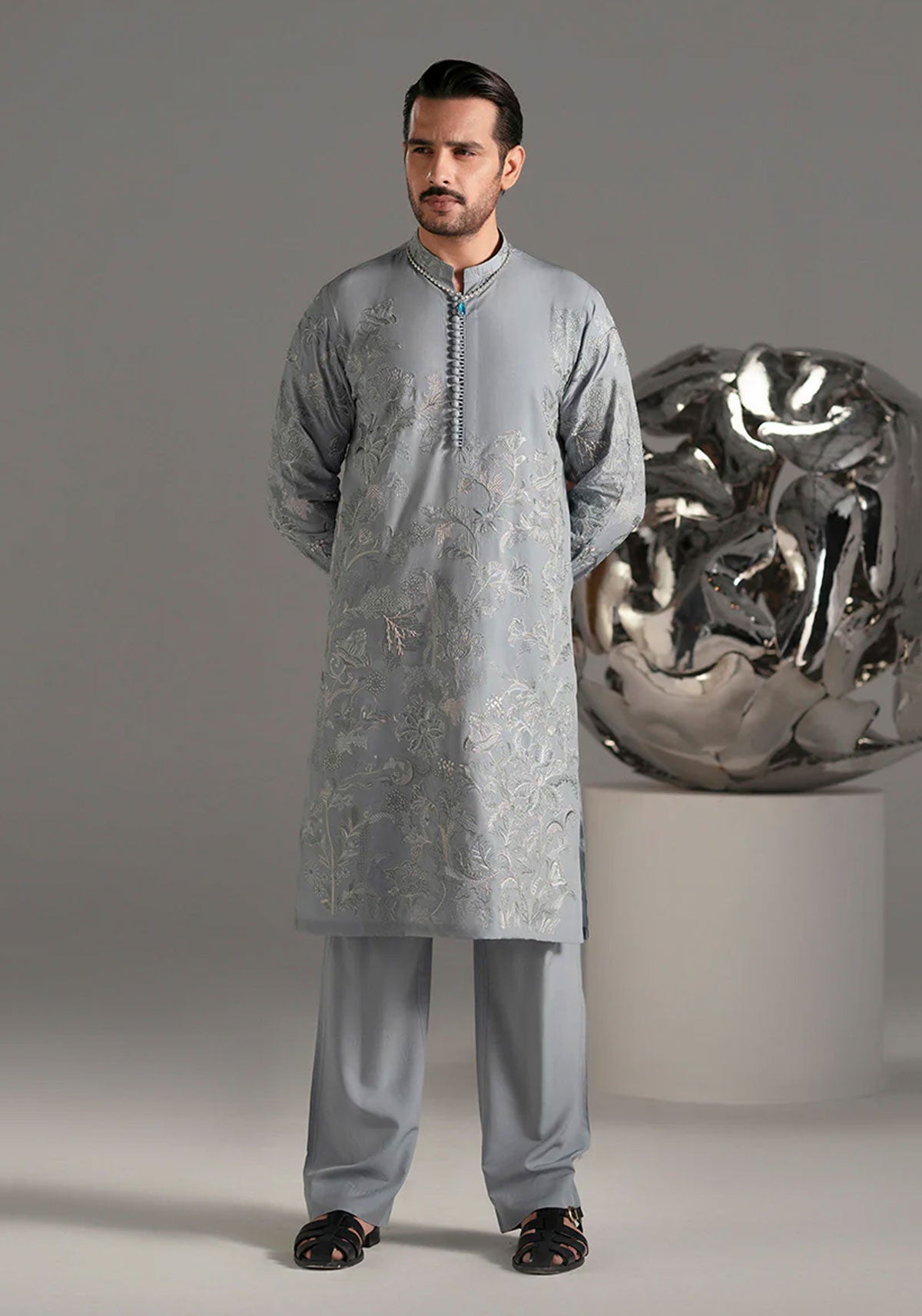 An ice blue kurta and pajama set detailed with all over patterns of Tree of Life, done in resham renderings for depth.