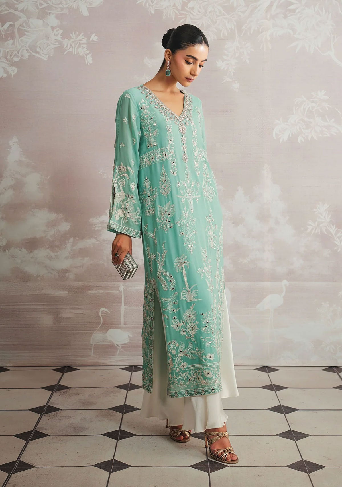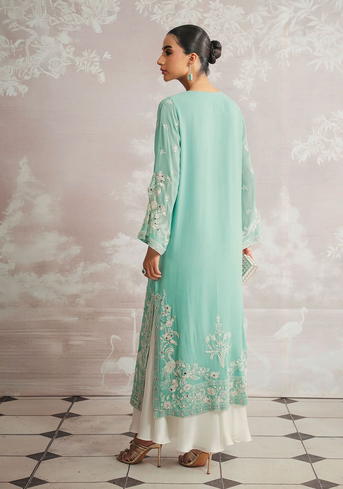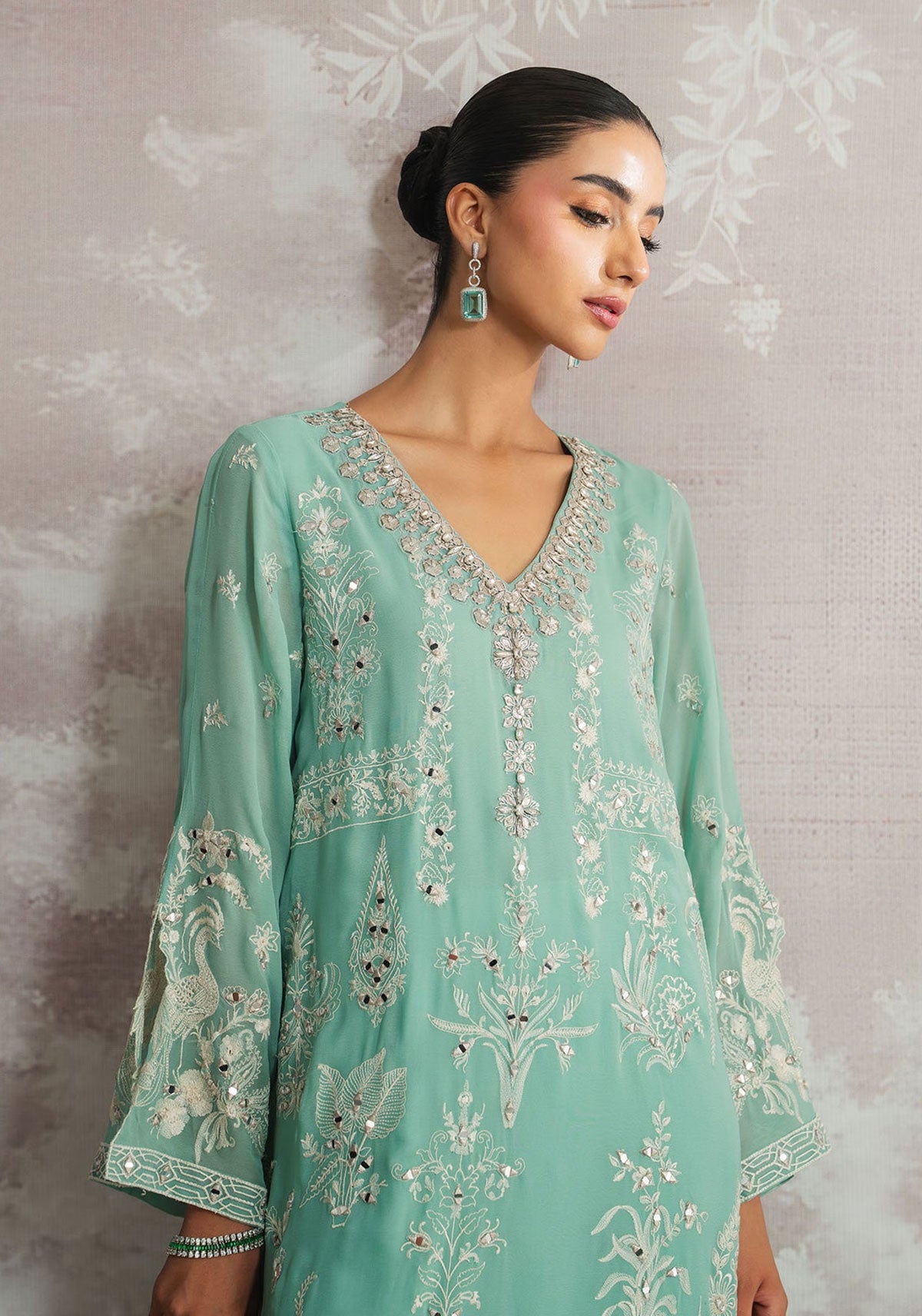 A serene ode to luxury, Nilufar unfolds in a mesmerising turquoise hue, where refined elegance meets artisanal mastery. Intricately embroidered and hand-embellished to perfection, this Luxury Pret ensemble is paired with a delicate plain spray dupatta, adding effortless grace to its silhouette. A timeless statement designed for moments that call for understated opulence.