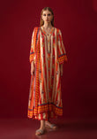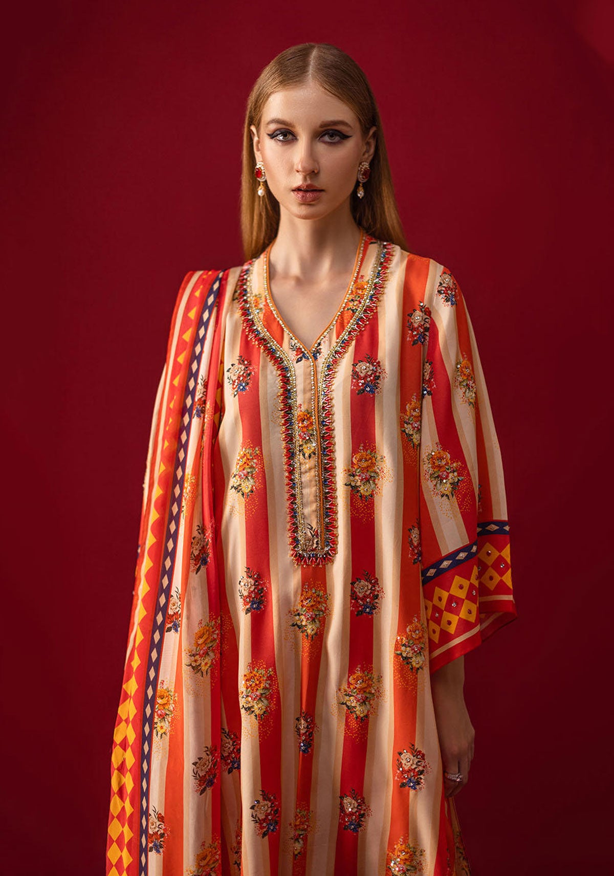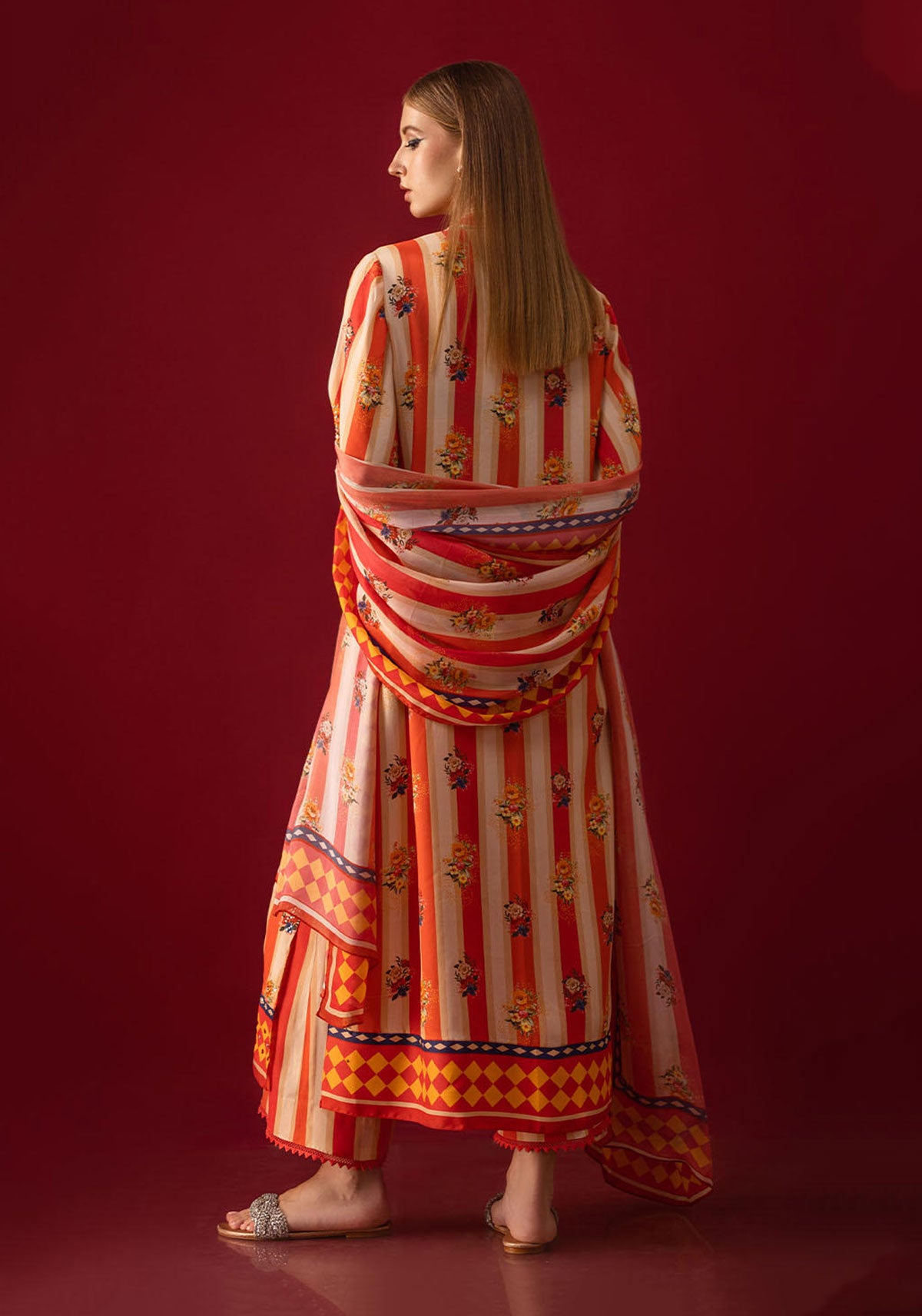 Printed crepe shirt with intricate hand embellished neckline and stunning detailing all over, including the sleeves. Paired with crepe printed pants with a delicate lace border and a beautiful printed silk dupatta.