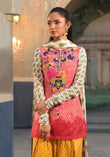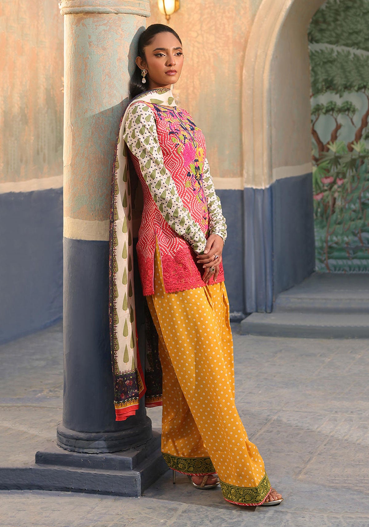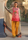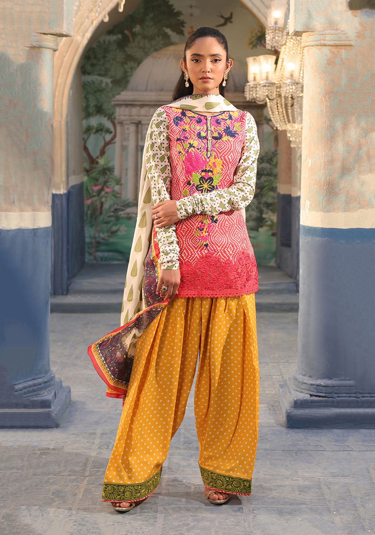 A printed crepe shirt with an embellished neckline is paired with a printed shalwar and a dupatta.