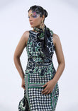 A sleeveless raw silk dress, finished with bold printed detailing.