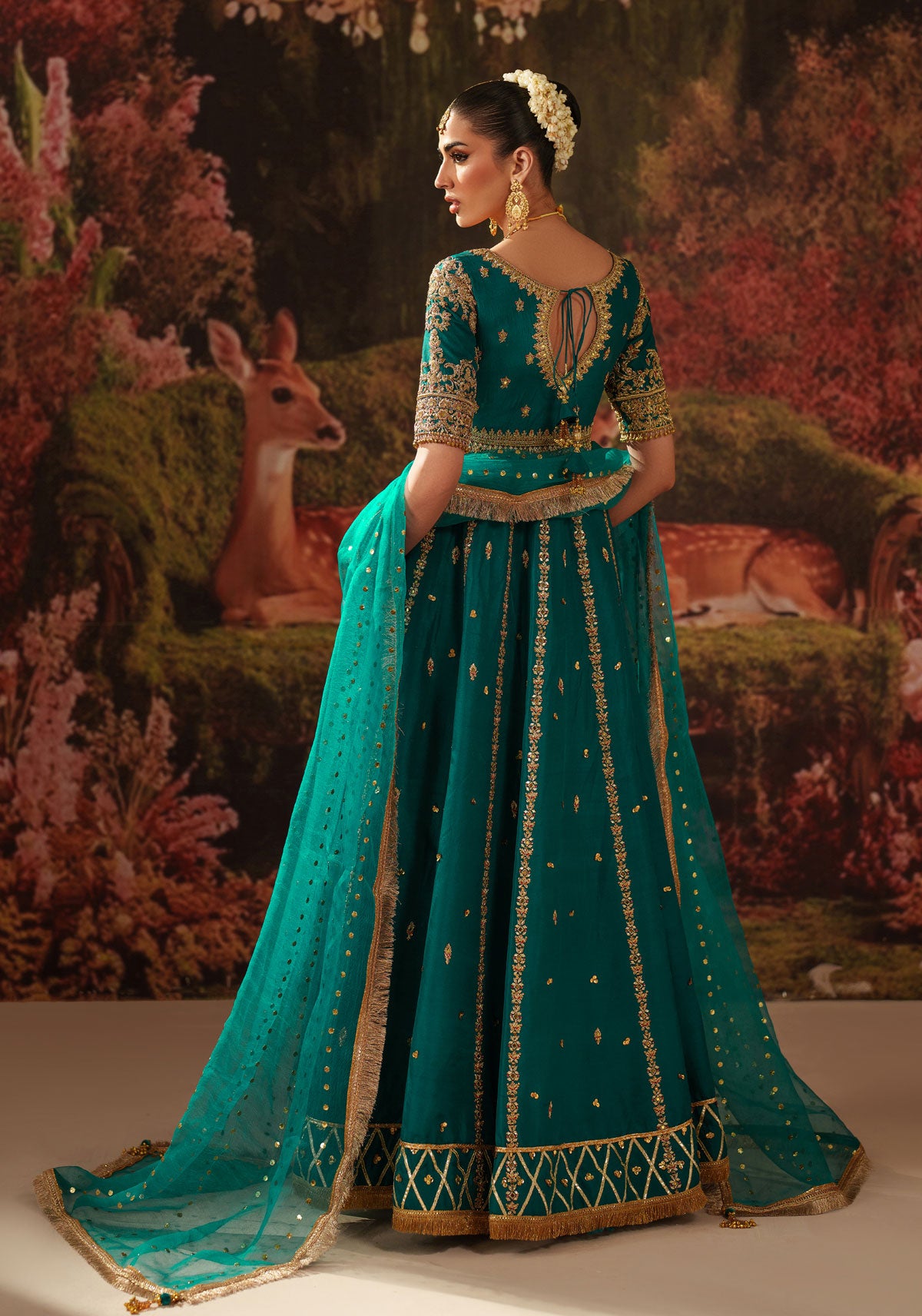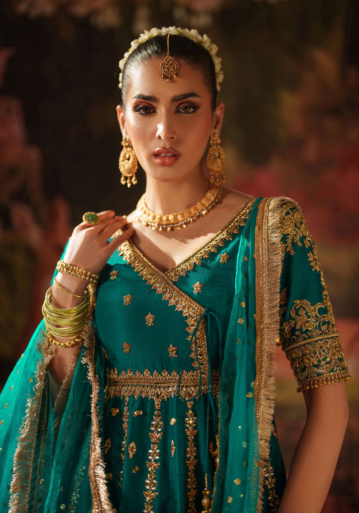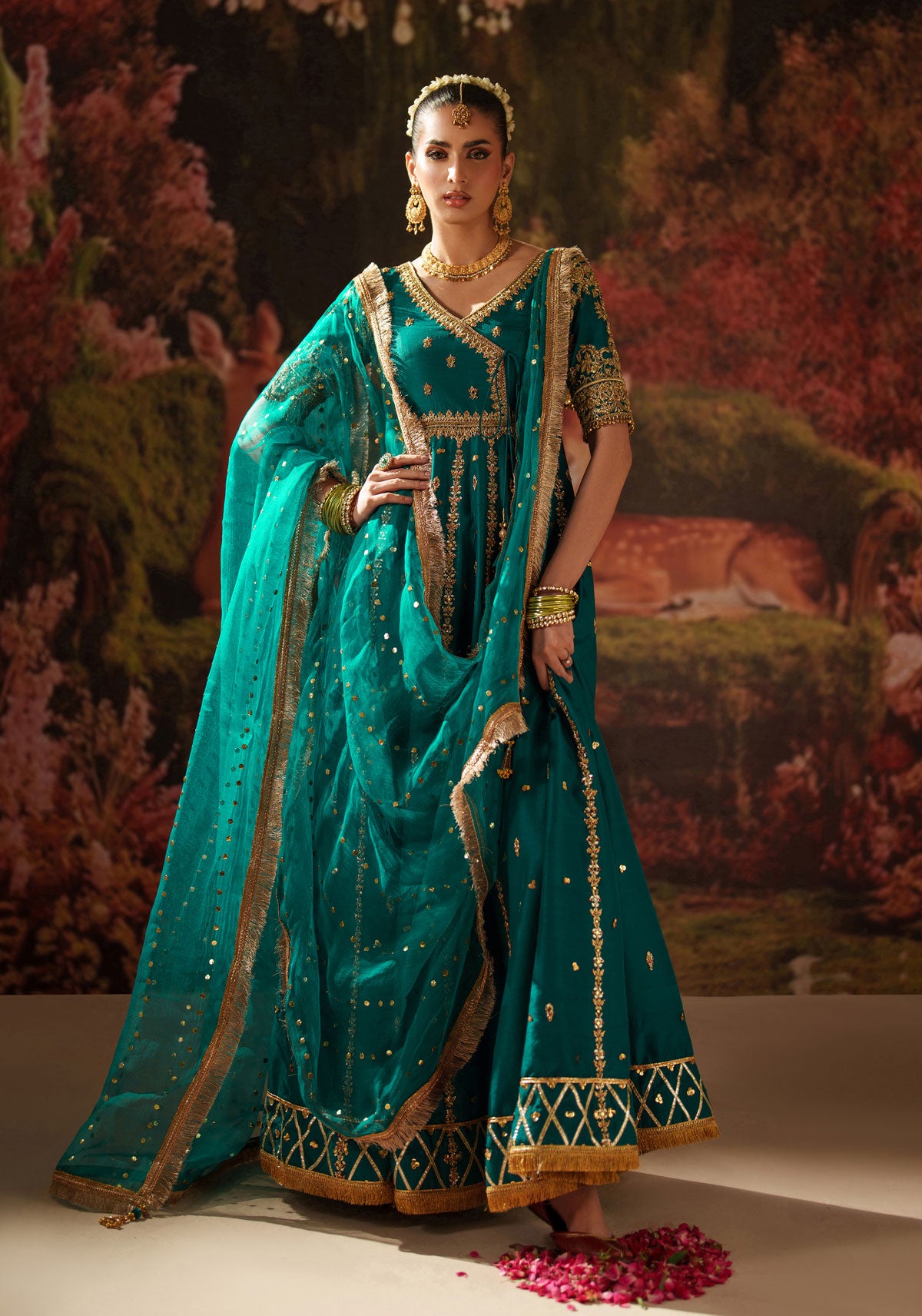 A stunning angharka we are completely obsessed with, in pure raw silk. The richly hand worked bodice has unimaginable detailing’s from the ultra-flattering details, the sleeves have intricate hand detailing’s with ghungro’s. The panels are cut from perfection with hand work and a gota border at the hem to finish the look. Pair it with a Kamdani dupatta with Kiran lace details.