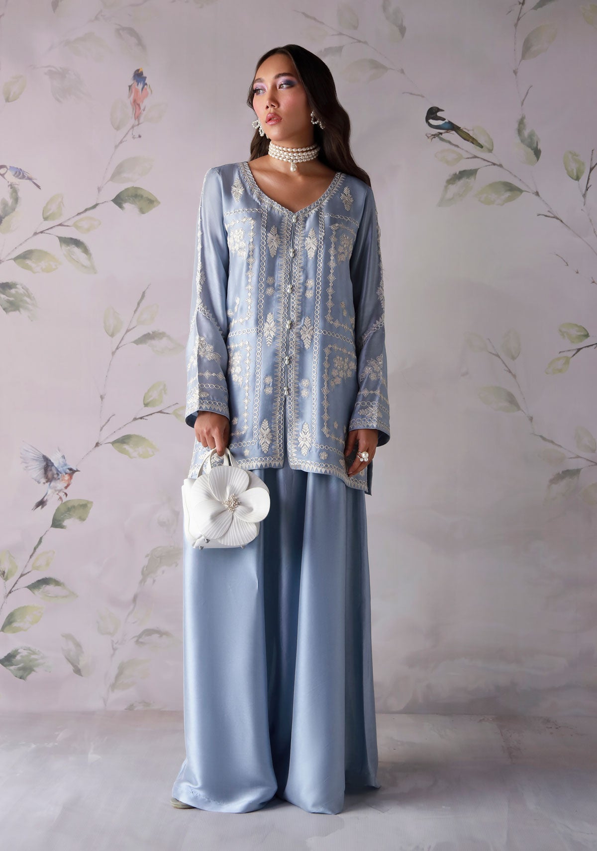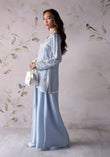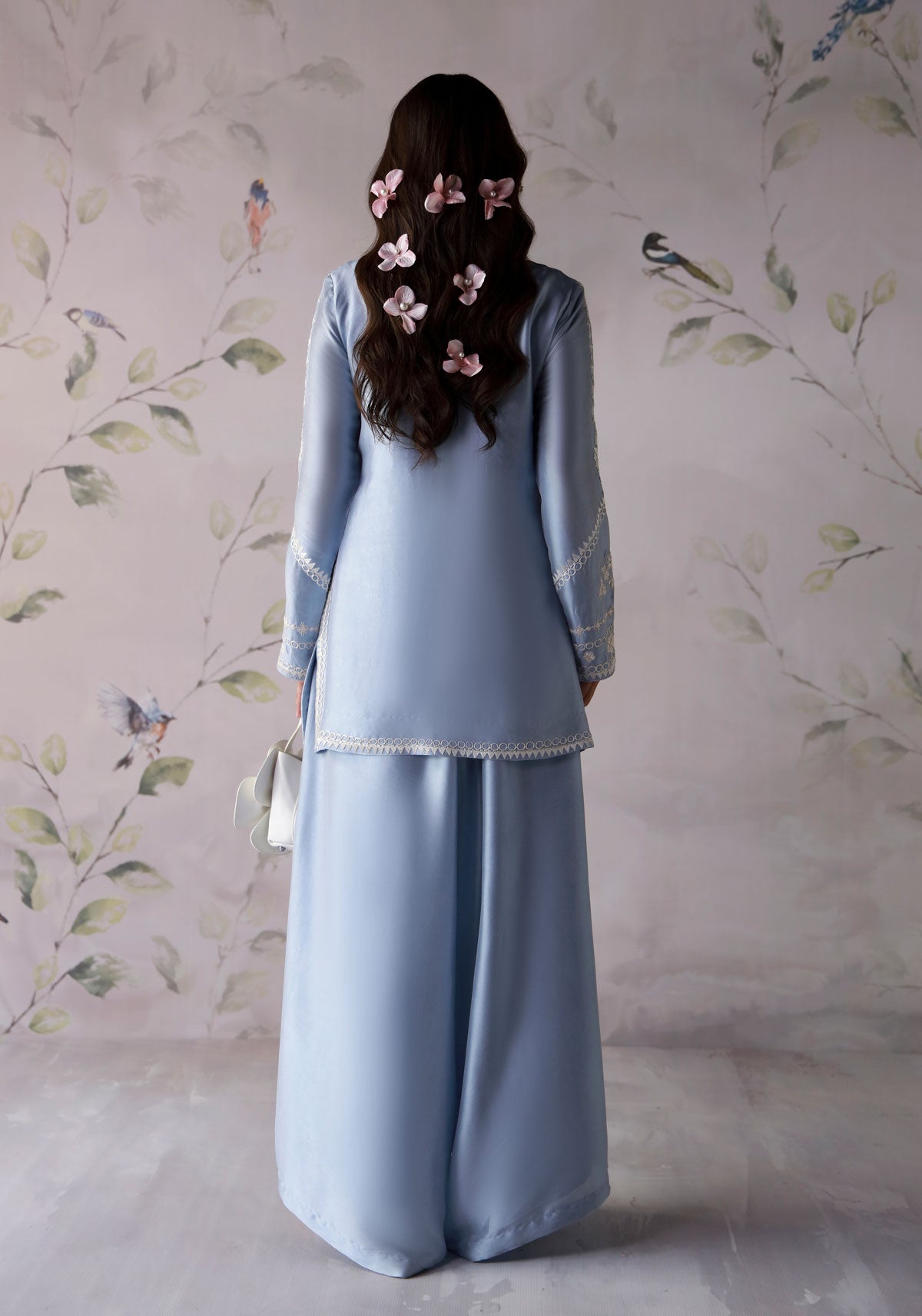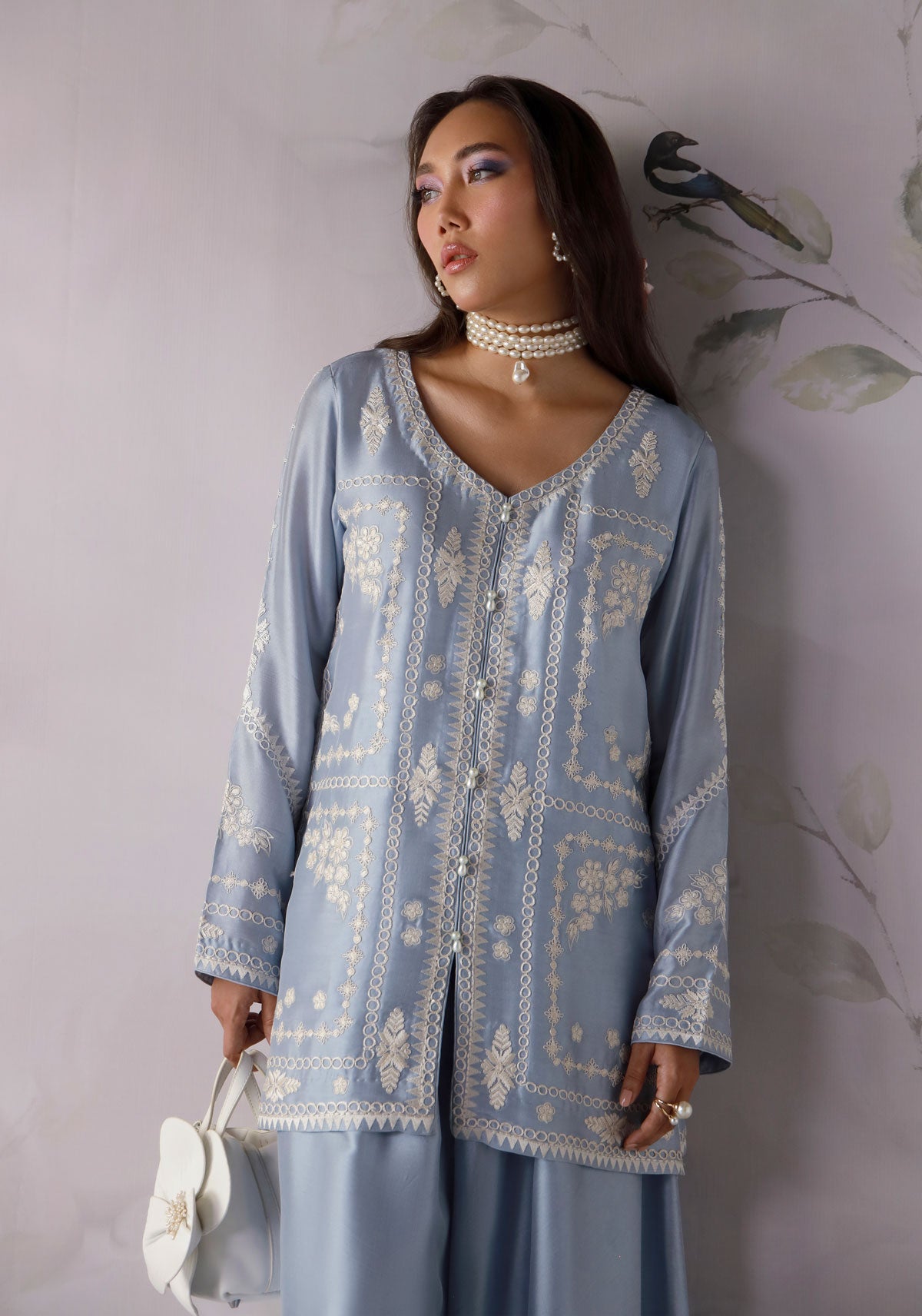 A vision in powder blue — this elegant butter silk jacket is adorned with intricate ivory embroidery and finished with delicate pearl buttons down the front. Paired with structured boxed pants in matching butter silk, the ensemble merges refined tailoring with soft feminine grace. Understated luxury for moments that call for quiet sophistication.