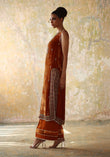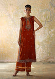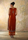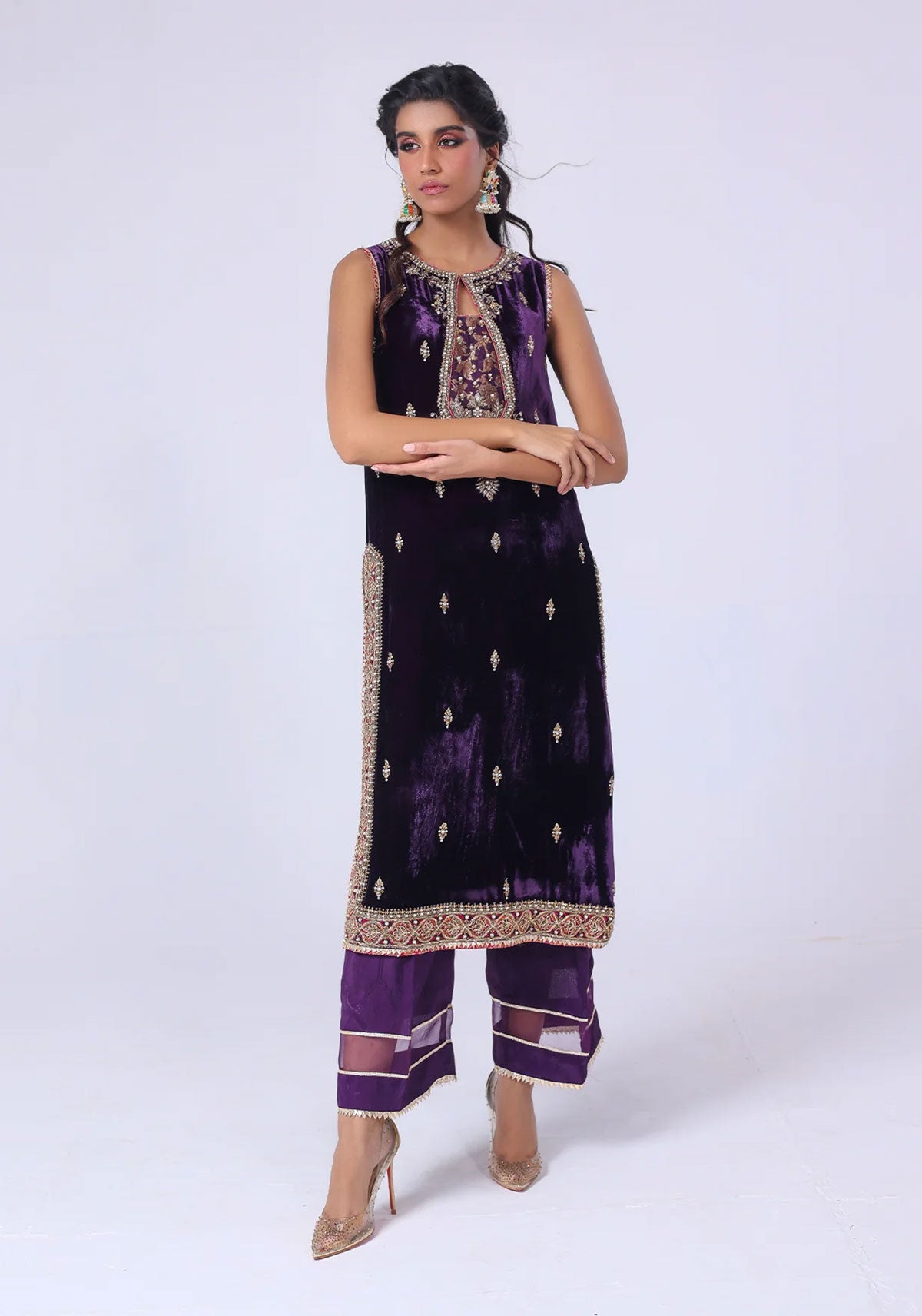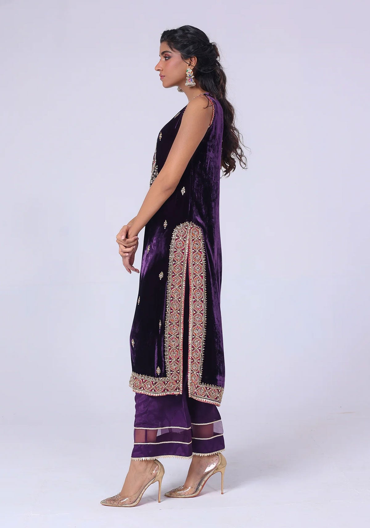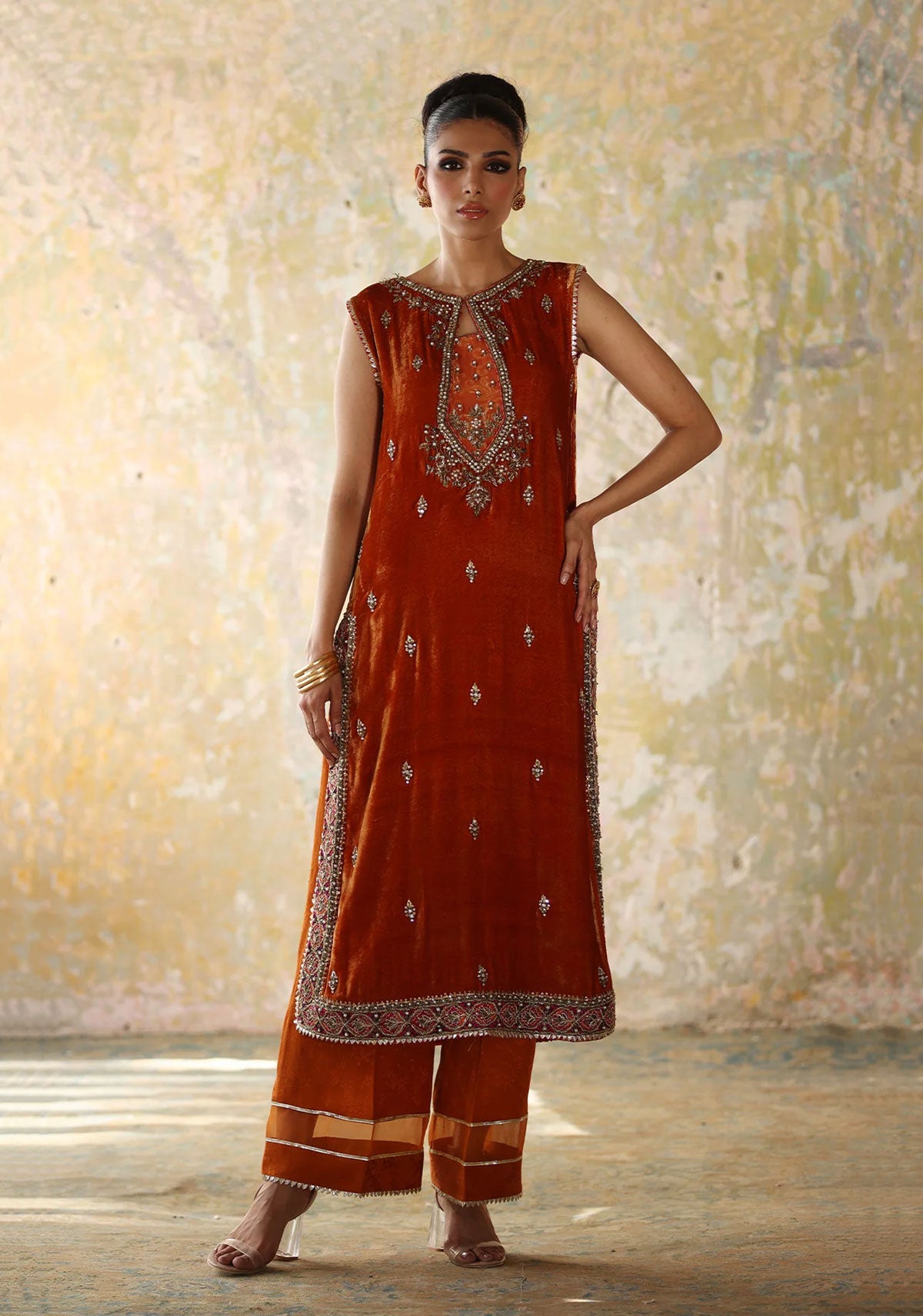 A long velvet shirt features a diamond shape neckline with insertion of cotton net zari accentuated with hand embellishments paired with organza finished silk pants.