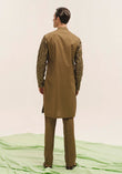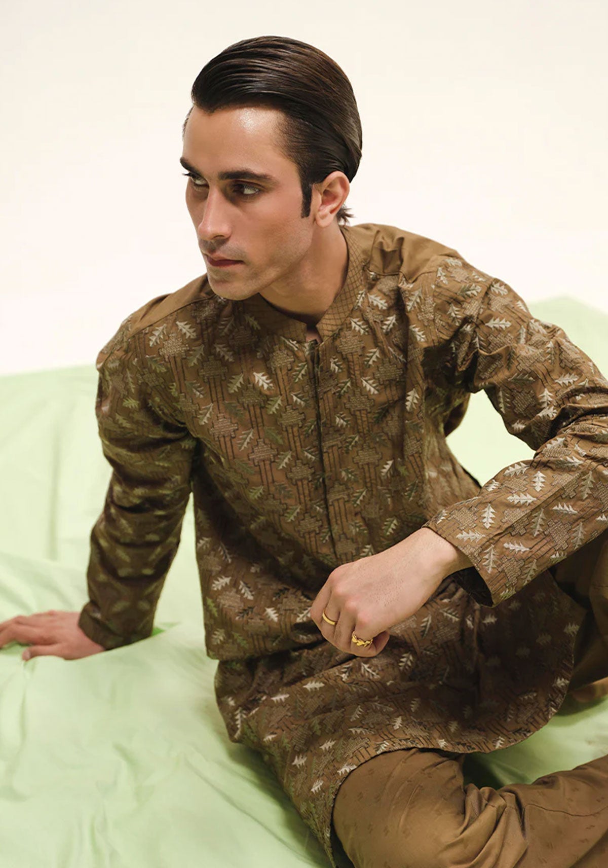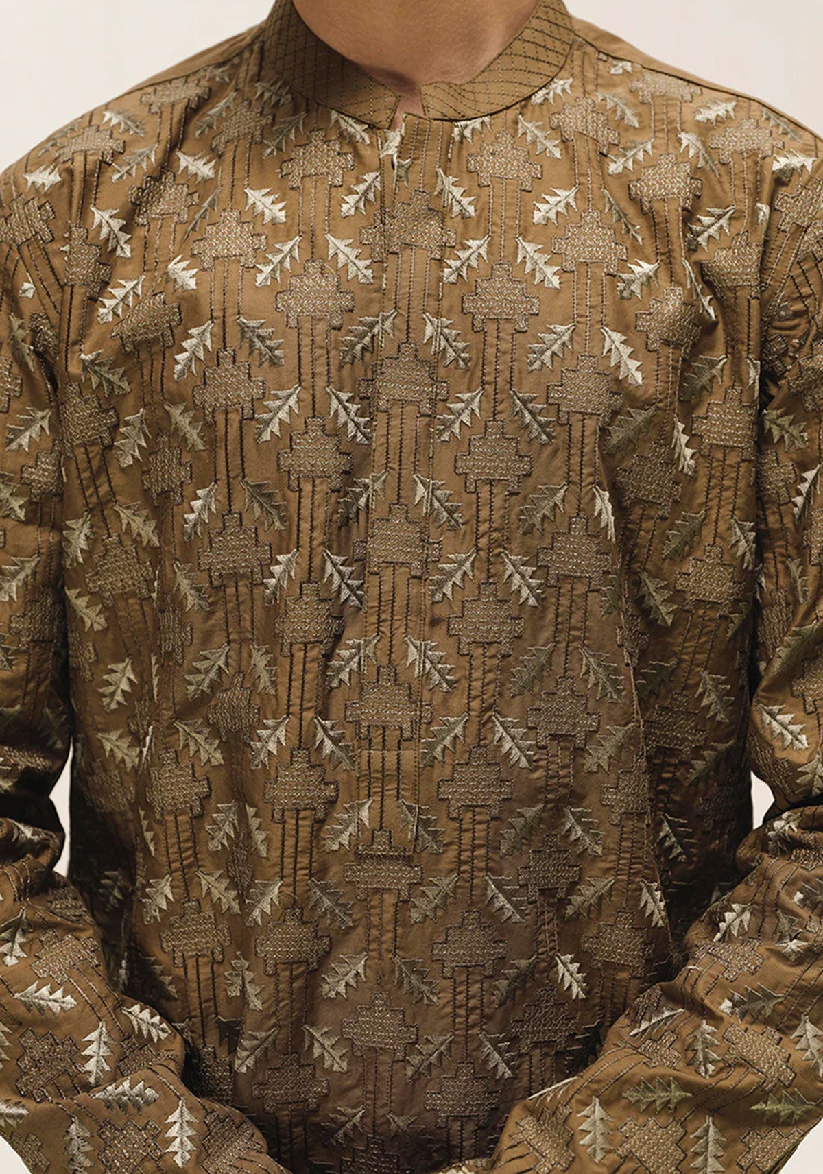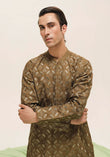 'Olive green self-woven embroidered cotton kurta and pajama set, with geometrical and acanthus-leaves patterns and front hidden placket.