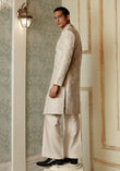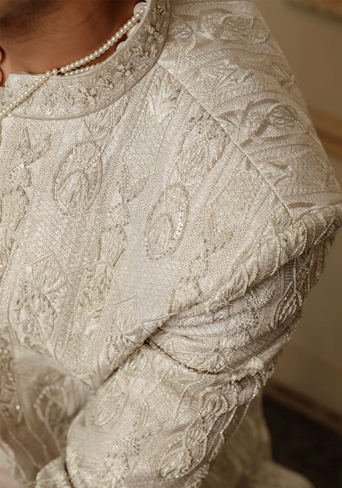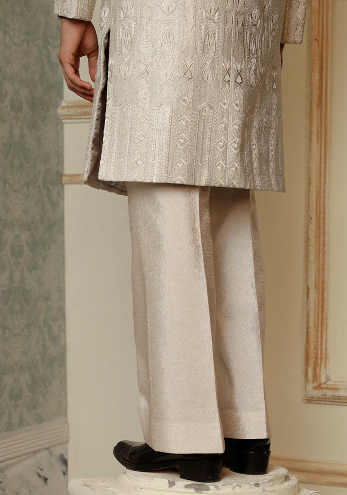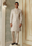 'Taupe toned, handmade jacquard sherwani, with hand embroidered geometric and floral patterns merged with tilla embellishments.