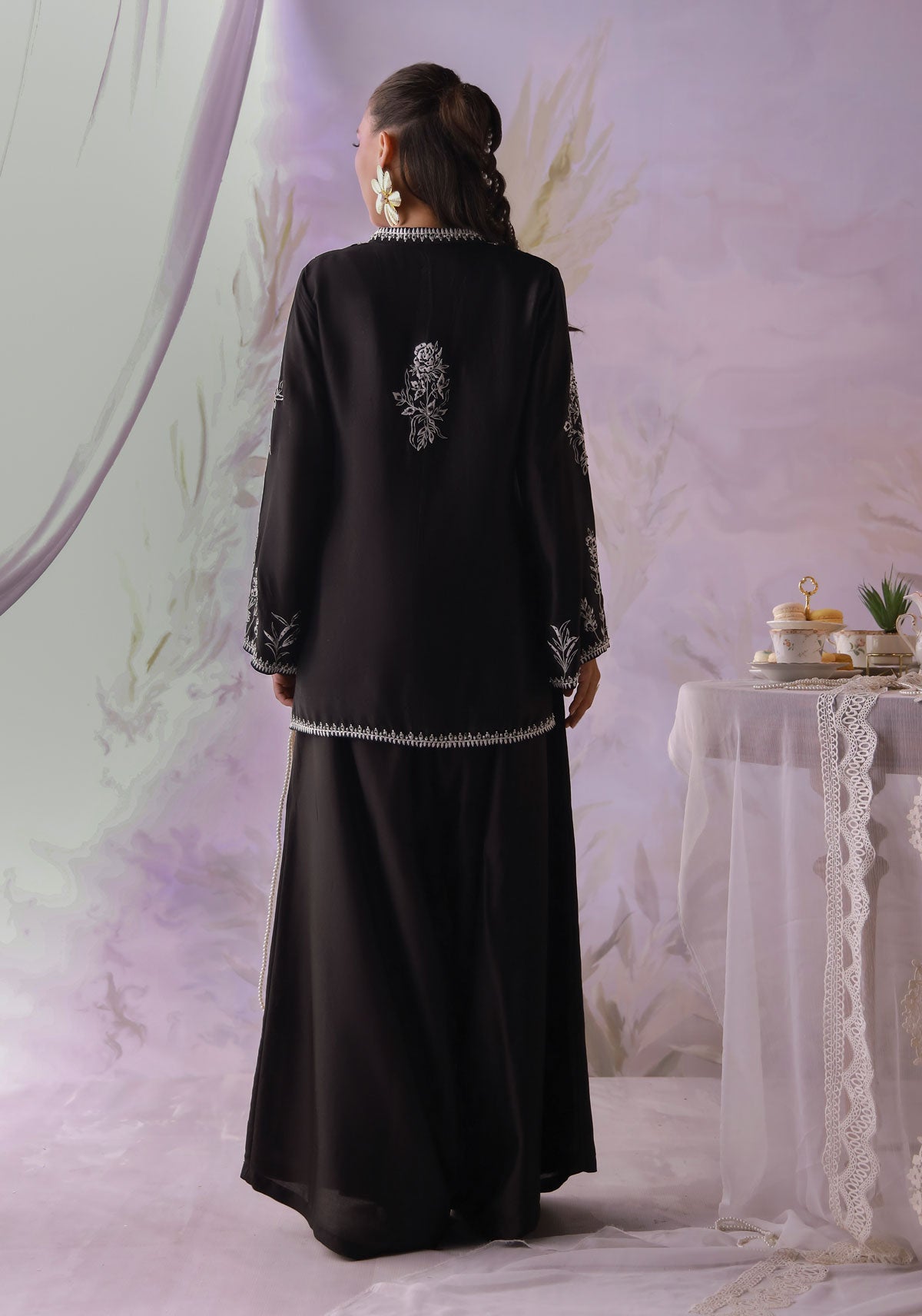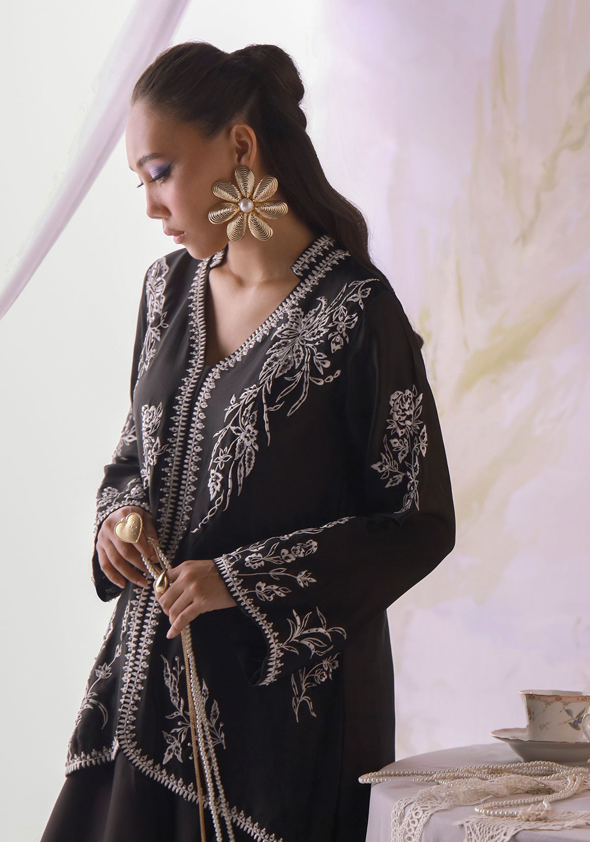 Pure butter silk tailored into a flowing jacket and boxed pants, adorned with intricate embroidery and delicate hand-touching. A timeless ensemble that moves with grace and speaks of effortless sophistication.