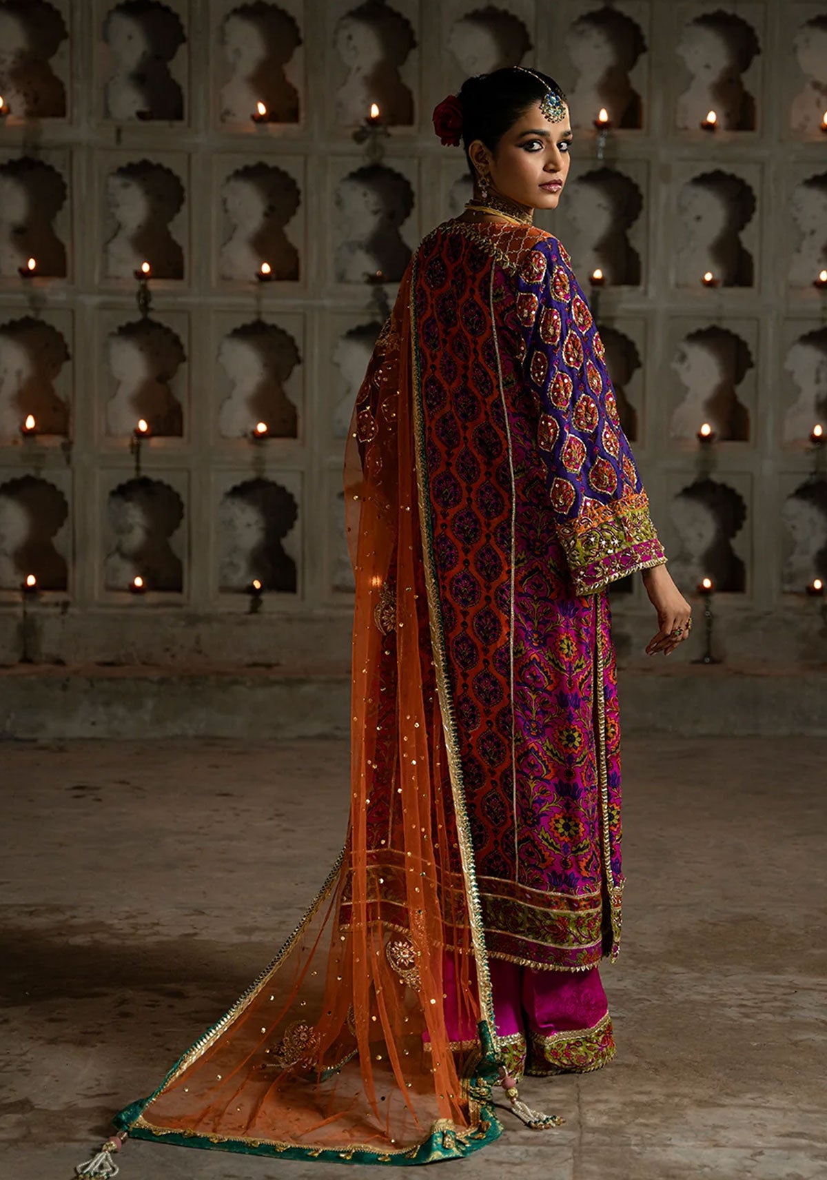 Draped in hues of sunset, this pure raw silk shirt is a canvas of vibrant orange, pink, and purple. Adorned with intricate hand-worked embellishments of gold gota, finished with exquisite jamawar inserts and kingree accents. Paired with hot pink straight pants. Note: Duppata price is not included