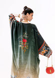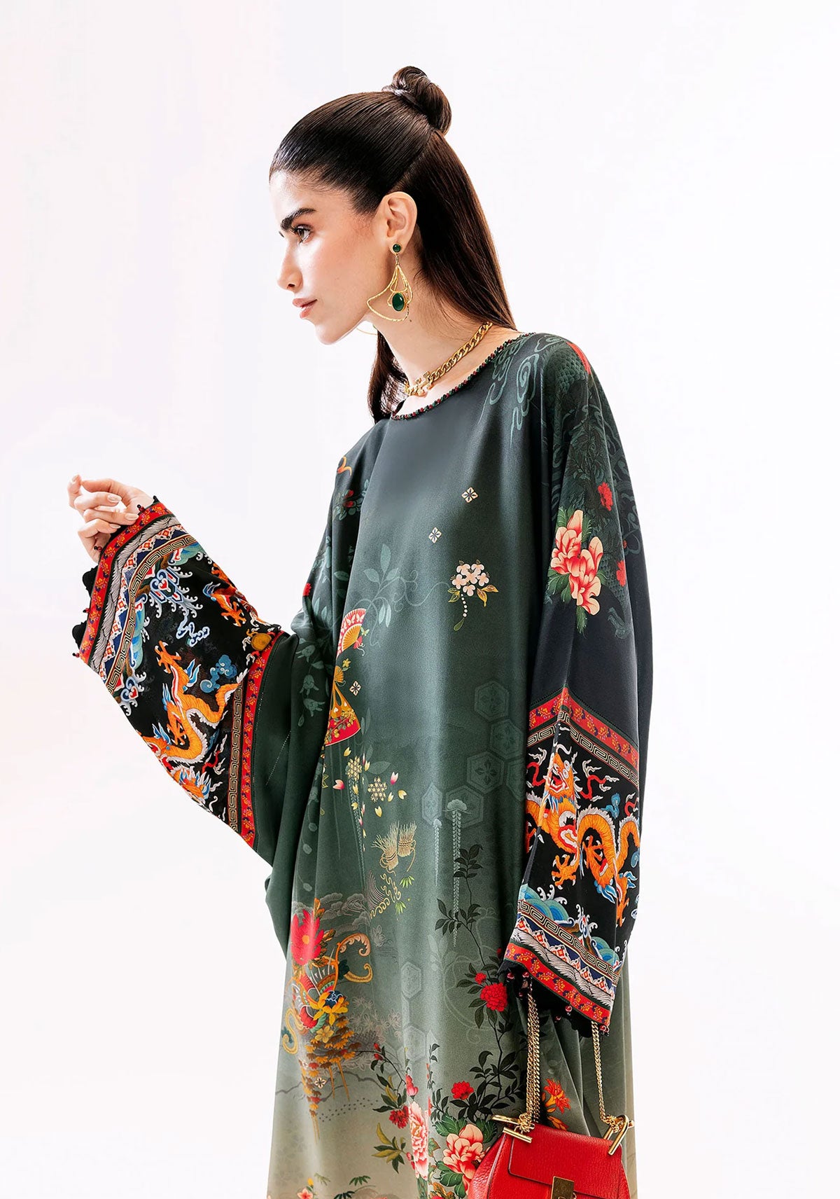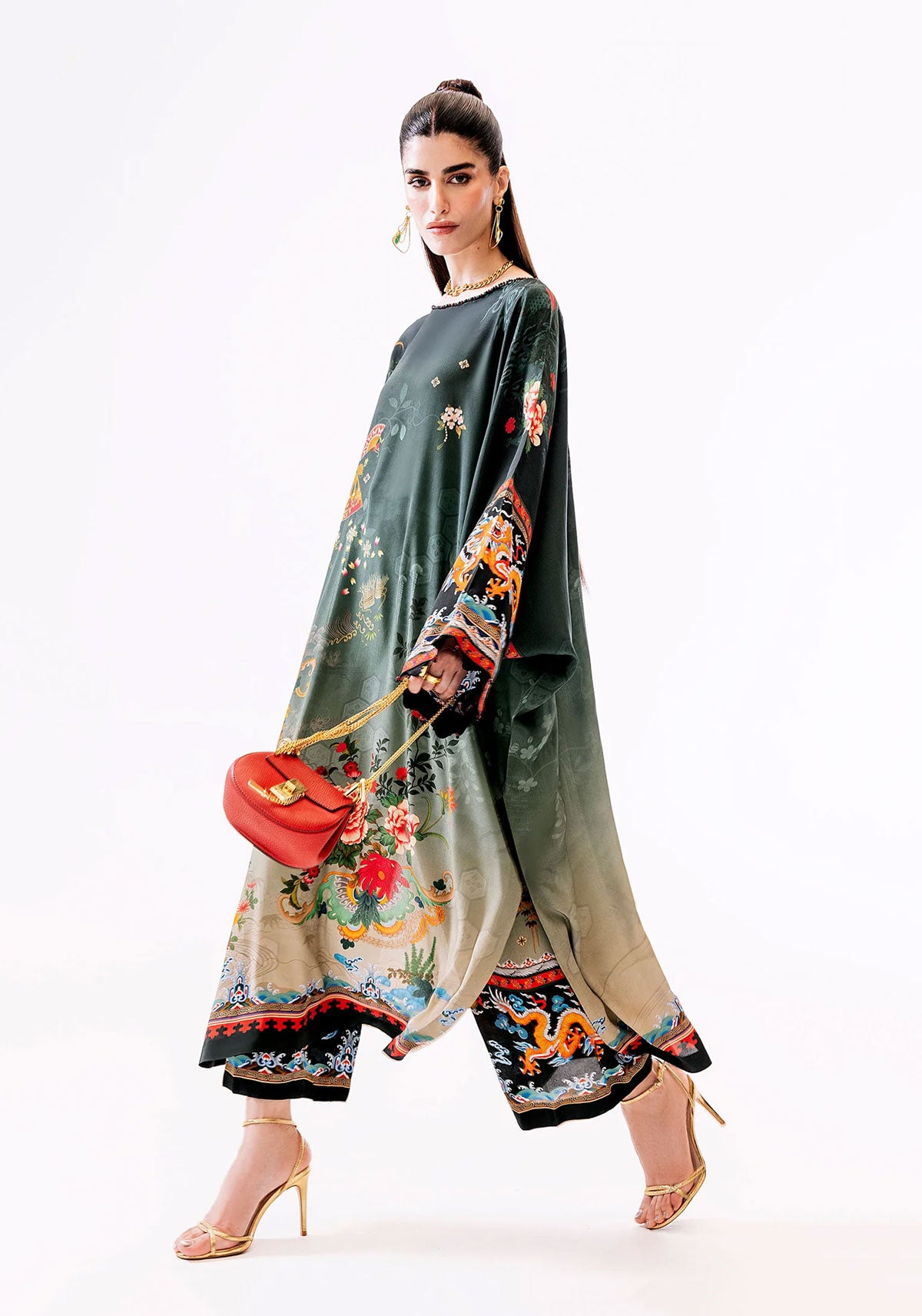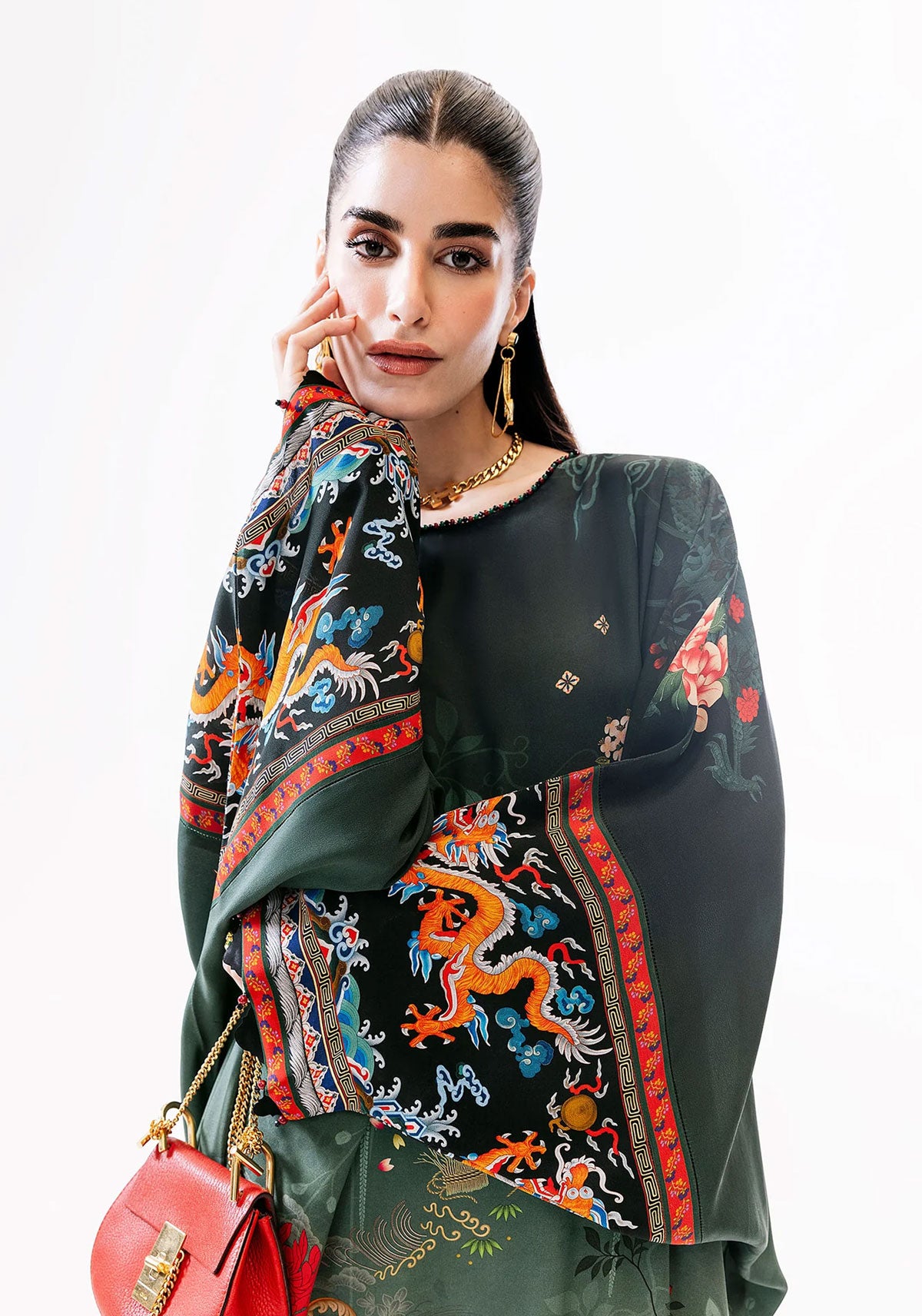 Step into a realm of elevated sophistication with Orée, an exquisite batwing co-ord ensemble rendered in sumptuous deep forest green silk, gently suffused with an ethereal gradient. This pièce de résistance is adorned with intricately illustrated dragons and vintage-inspired Chinese florals, evoking a timeless tableau of imperial grandeur and refined elegance.