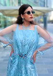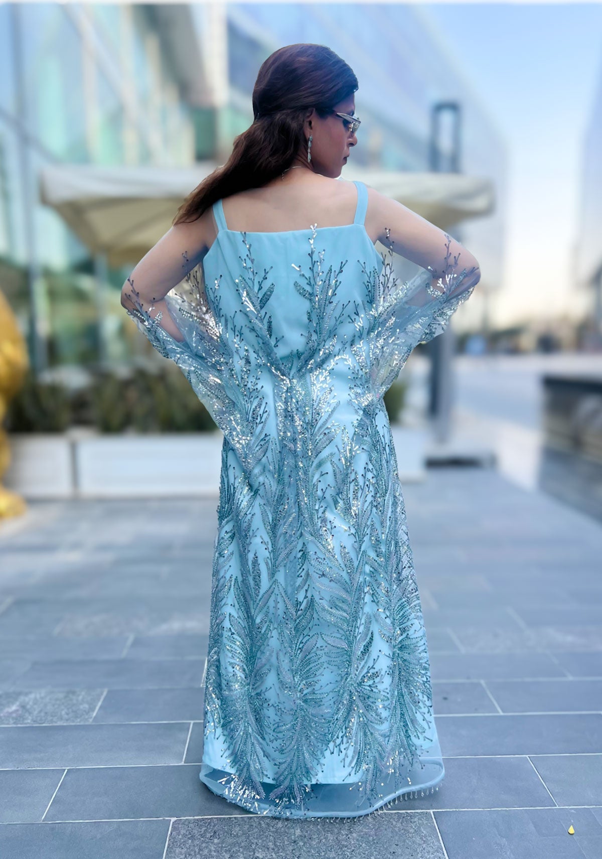 The flowing silhouette, paired with sheer embellished sleeves, moves with fluid ease — making it the perfect ensemble for evening soirées, formal dinners, or festive celebrations. Subtle yet striking, it radiates quiet glamour with every step.
