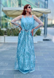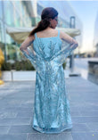 A vision of elegance and grace, the Cut Dana Kaftan captures the delicate allure of green grey sophistication. This ethereal piece is adorned with intricate silver bead work and sequins, cascading across the bodice and sleeves like glimmering frost on a winter morning.