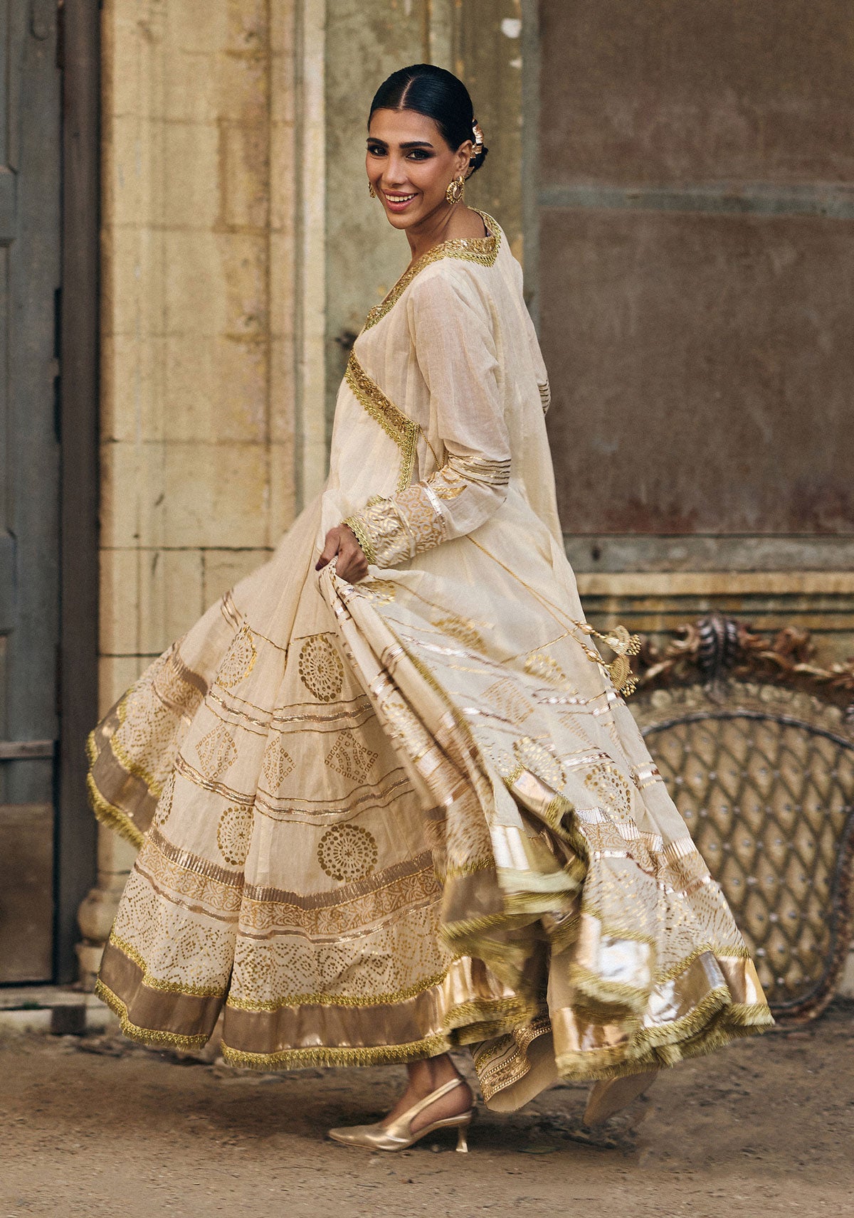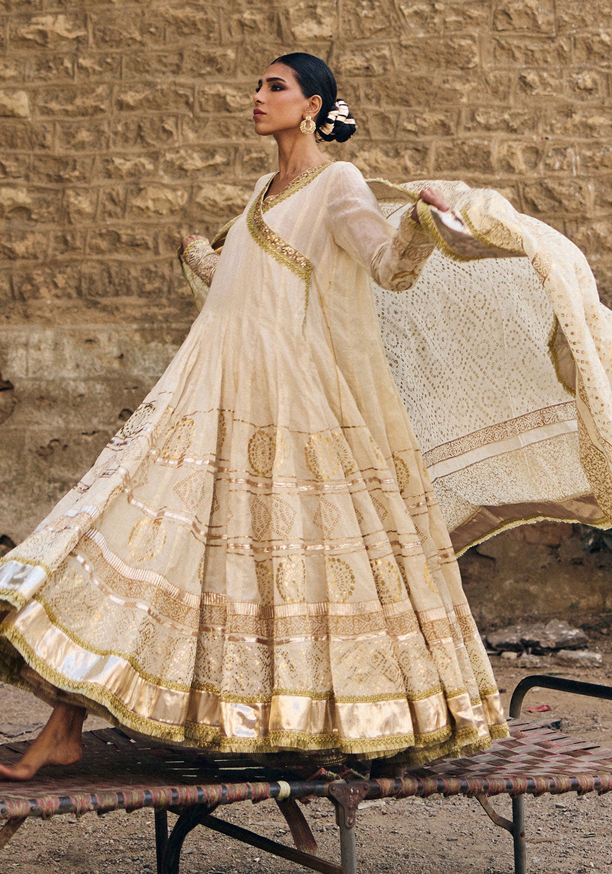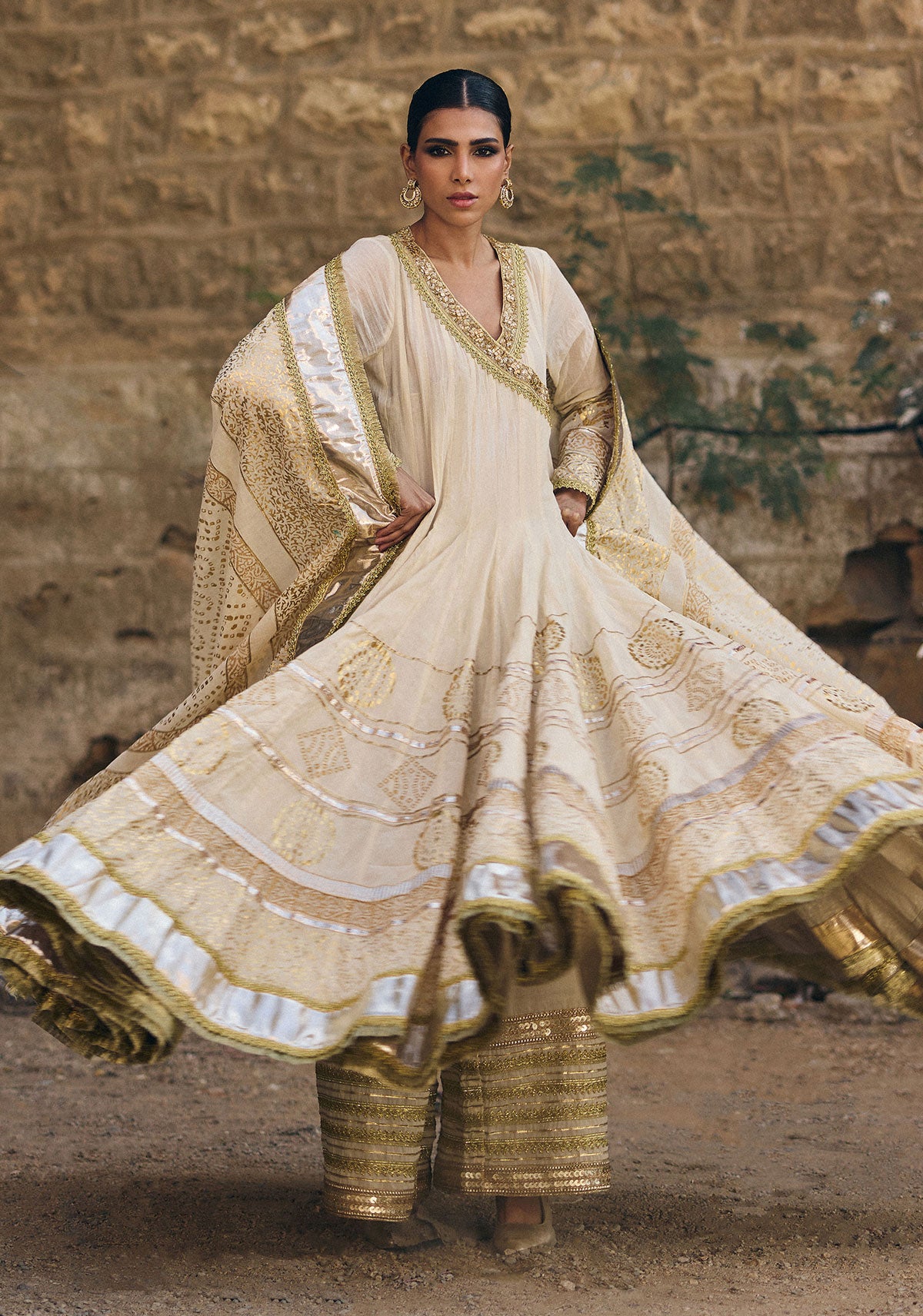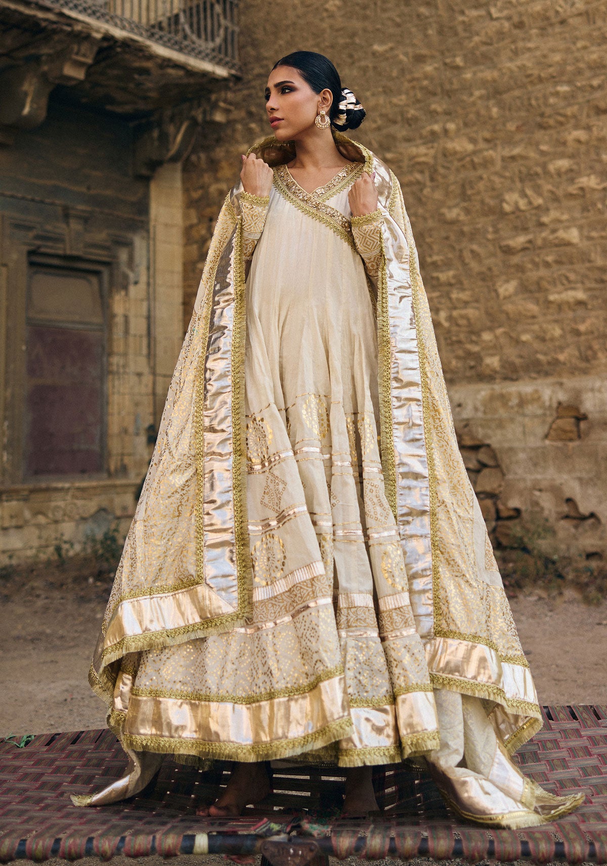 Pari is an elegant three-piece ensemble crafted from pure hand-woven muslin, blending traditional charm with a refined, graceful silhouette. The short shirt adds a modern, youthful touch, while the classic Dhaka pajama provides beautiful volume and movement, creating a look that is both festive and timeless. The centerpiece of this outfit is its heavy dupatta, richly finished to bring depth,, and a celebratory feel to the entire look. Soft foil printing and gold detailing enhance the richness of the muslin, giving Pari a regal glow without overpowering its delicate elegance. Perfect for nikah events, mehndi celebrations, weddings, and all occasions where you want to look beautifully traditional and effortlessly radiant.