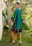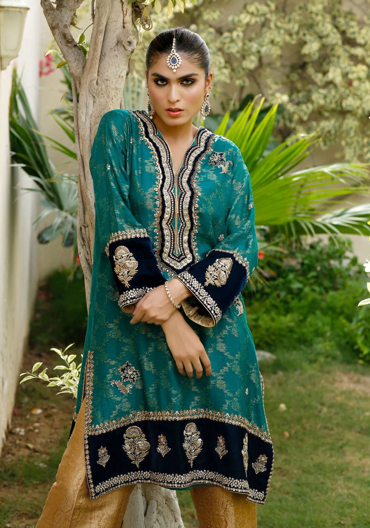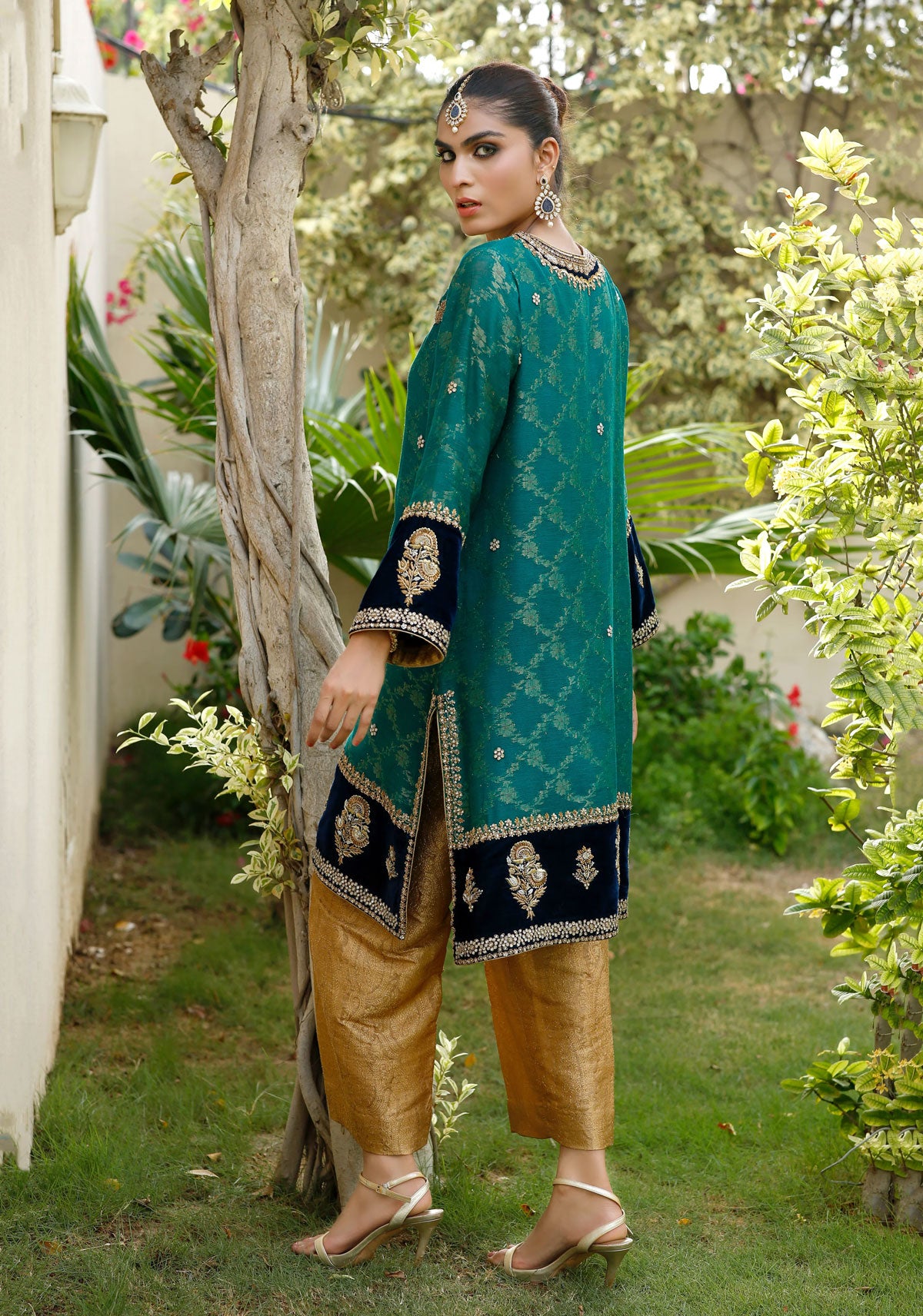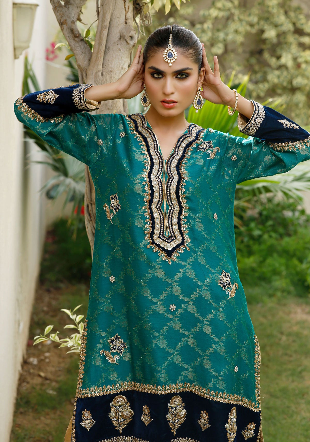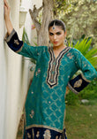 Cut from pure structured spun net, the kurti is crafted using a myriad of techniques like appliqué, sequins zardozi, glistening crystals and kasab with embroidered daman on both the front & back of the kurti giving it a contemporary touch of freedom and ease. Paired with matching silk pants or gold banarsi pants.